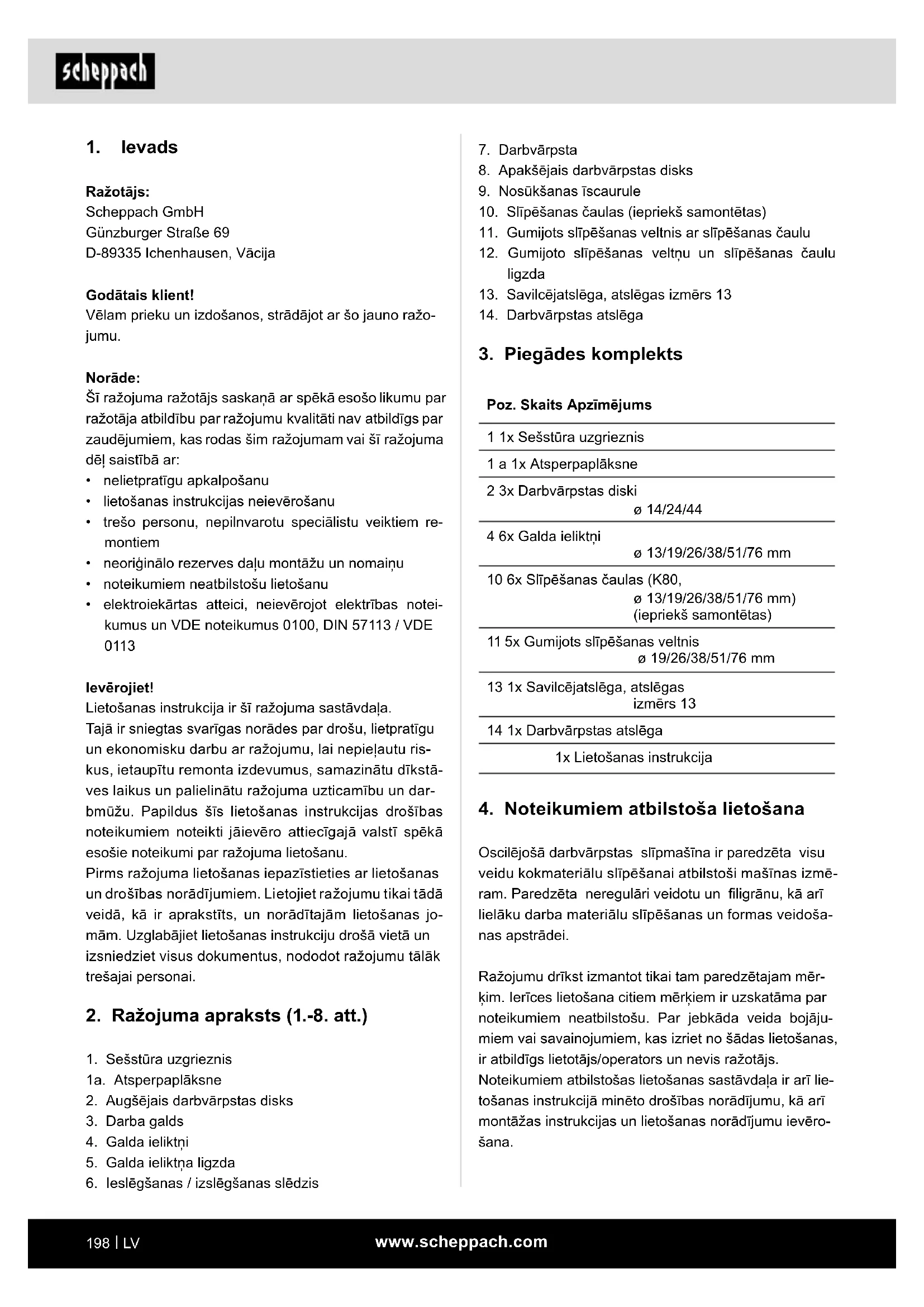 - Pasūtījumos norādiet mūsu preces numurus, kā arī ierīces tipu un izgatavošanas gadu. m IEVĒRĪBAI! Ierīce un iepakojuma materiāls nav rotaļlietas! Bērni nedrīkst rotaļāties ar plastikāta maisiņiem, plēvēm un sīkām detaļām! Pastāv norīšanas un nosmakšanas risks!www.scheppach.com