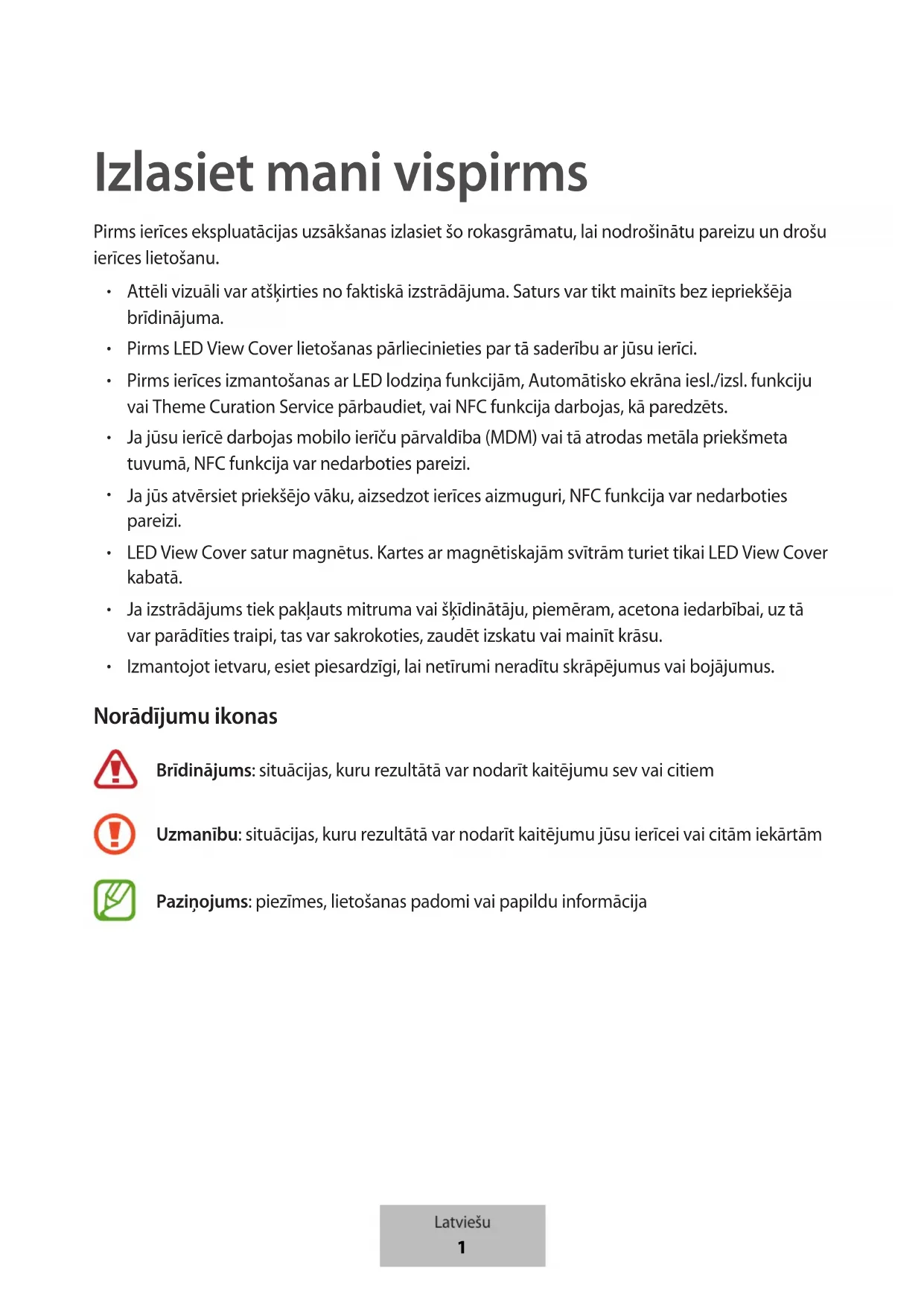 Izmantojot ietvaru, esiet piesardzīgi, lai netīrumi neradītu skrāpējumus vai bojājumus. Norādījumu ikonas Brīdinājums: situācijas, kuru rezultātā var nodarīt kaitējumu sev vai citiem Uzmanību: situācijas, kuru rezultātā var nodarīt kaitējumu jūsu ierīcei vai citām iekārtām Paziņojums: piezīmes, lietošanas padomi vai papildu informācija Latviešu