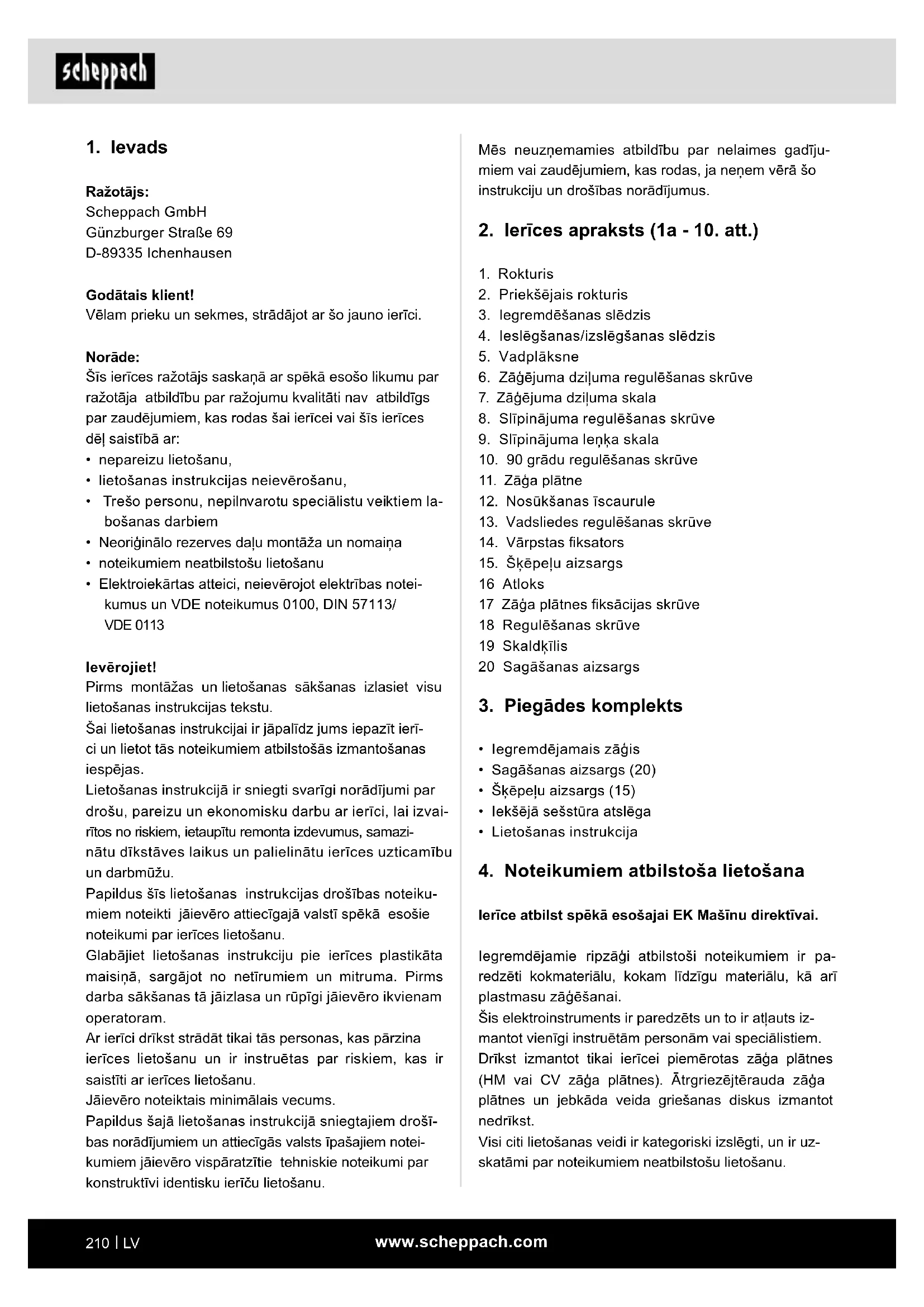 Ražotājs: Scheppach GmbH Günzburger Straße 69 D-89335 Ichenhausen Godātais klient! Vēlam prieku un sekmes, strādājot ar šo jauno ierīci. Norāde: Šīs ierīces ražotājs saskaņā ar spēkā esošo likumu par ražotāja atbildību par ražojumu kvalitāti nav atbildīgs par zaudējumiem, kas rodas šai ierīcei vai šīs ierīces dēļ saistībā ar:
