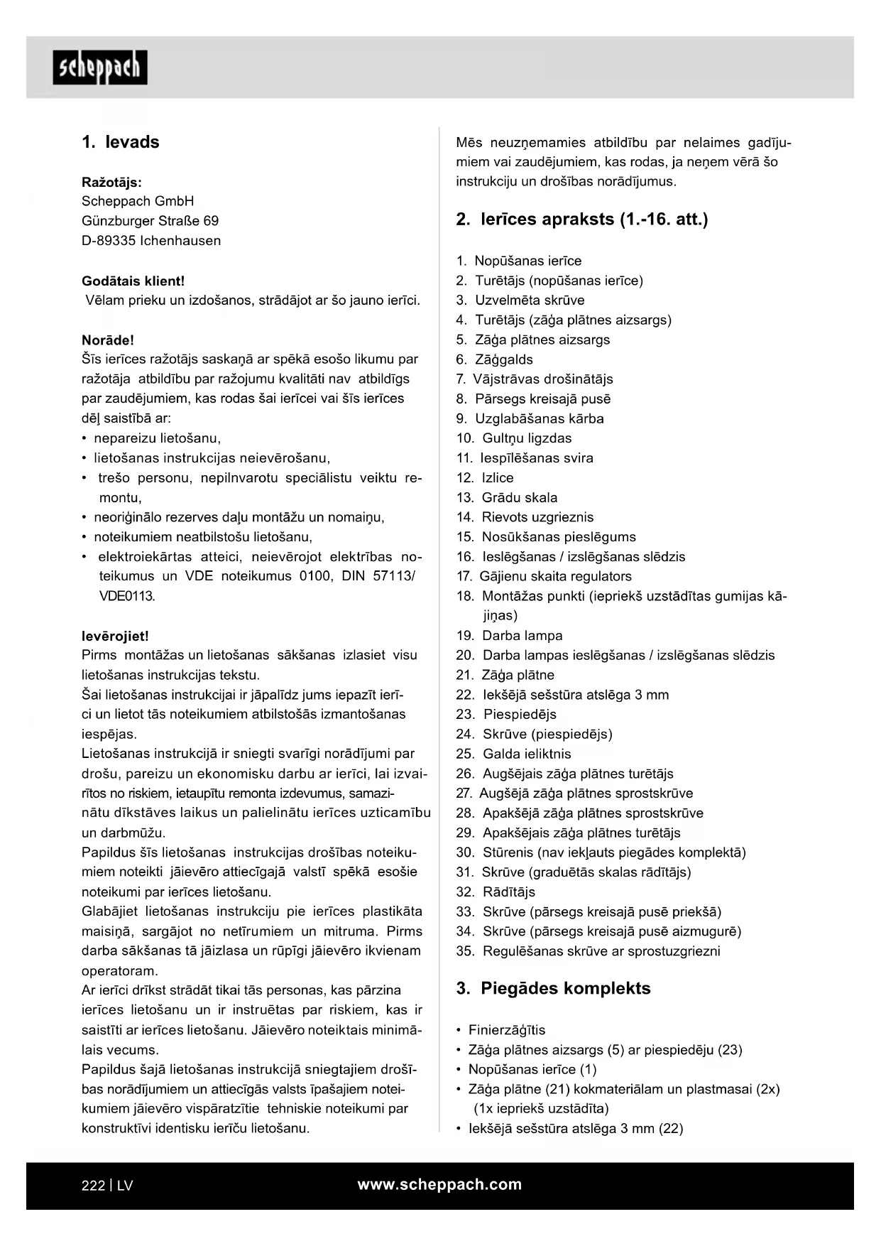 - elektroiekārtas atteici, neievērojot elektrības no- teikumus un VDE noteikumus 0100, DIN 57113/ VDE0113. Ievērojiet! Pirms montāžas un lietošanas sākšanas izlasiet visu lietošanas instrukcijas tekstu. Šai lietošanas instrukcijai ir jāpalīdz jums iepazīt ierī- ci un lietot tās noteikumiem atbilstošās izmantošanas iespējas. Lietošanas instrukcijā ir sniegti svarīgi norādījumi par drošu, pareizu un ekonomisku darbu ar ierīci, lai izvai- rītos no riskiem, ietaupītu remonta izdevumus, samazi- nātu dīkstāves laikus un palielinātu ierīces uzticamību un darbmūžu. Papildus šīs lietošanas instrukcijas drošības noteiku- miem noteikti jāievēro attiecīgajā valstī spēkā esošie noteikumi par ierīces lietošanu. Glabājiet lietošanas instrukciju pie ierīces plastikāta maisiņā, sargājot no netīrumiem un mitruma. Pirms darba sākšanas tā jāizlasa un rūpīgi jāievēro ikvienam operatoram. Ar ierīci drīkst strādāt tikai tās personas, kas pārzina ierīces lietošanu un ir instruētas par riskiem, kas ir saistīti ar ierīces lietošanu. Jāievēro noteiktais minimā- lais vecums. Papildus šajā lietošanas instrukcijā sniegtajiem drošī- bas norādījumiem un attiecīgās valsts īpašajiem notei- kumiem jāievēro vispāratzītie tehniskie noteikumi par konstruktīvi identisku ierīču lietošanu.www.scheppach.com