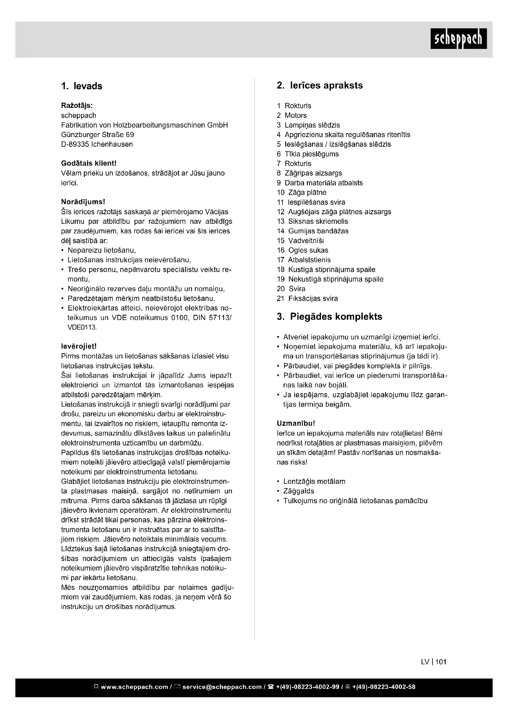 Ražotājs: scheppach Fabrikation von Holzbearbeitungsmaschinen GmbH Günzburger Straße 69 D-89335 Ichenhausen Godātais klient! Vēlam prieku un izdošanos, strādājot ar Jūsu jauno ierīci. Norādījums! Šīs ierīces ražotājs saskaņā ar piemērojamo Vācijas Likumu par atbildību par ražojumiem nav atbildīgs par zaudējumiem, kas rodas šai ierīcei vai šīs ierīces dēļ saistībā ar: