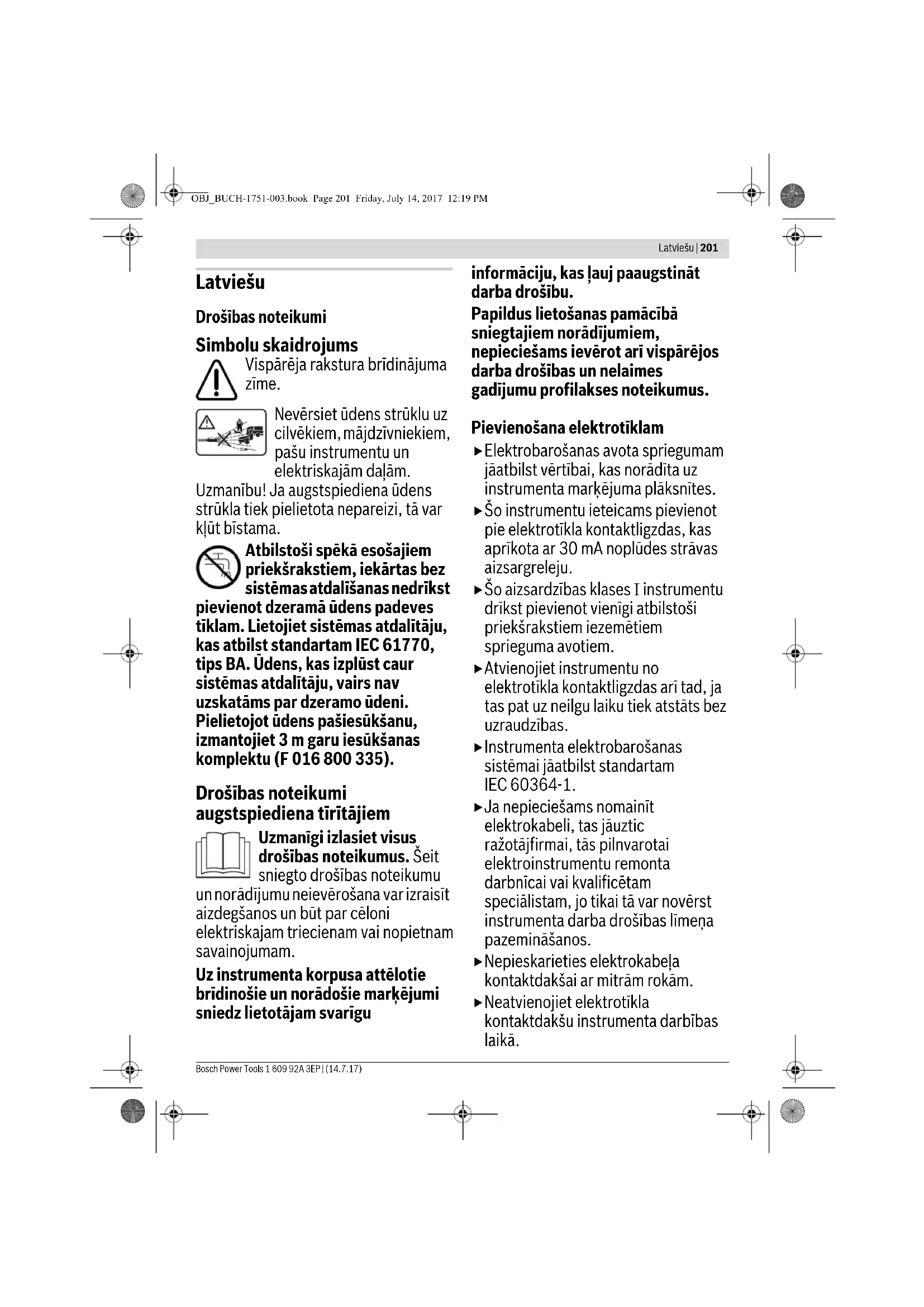 OBJ_BUCH-1751-003.book Page 205 Friday, July 14, 2017 12:19 PM Ω 0,358206 | Latviešu 1 609 92A 3EP | (14.7.17) Bosch Power Tools IEVĒRĪBAI! Nepiemērotu pagarinātājkabeļu izmantošana var būt bīstama. Pagarinātājkabelim, kontaktdakšai un savienotājam jābūt ūdensdrošiem un piemērotiem izmantošanai ārpus telpām. Izmantojiet tikai pagarinātājkabeli, vadus un kabeļa noturspoli, kas atbilst standartam EN 61242 / IEC 61242 vai IEC 60884-2-7. Ja kopā ar dārza instrumentu vēlaties izmantot pagarinātājkabeli, tā vadu šķērsgriezuma laukumam jābūt šādam: – Vadu šķērsgriezuma laukums 1,5 mm