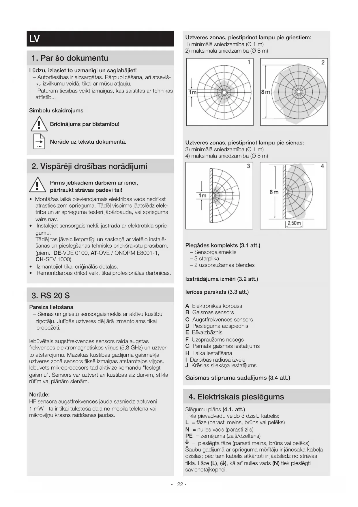 Pareiza lietošana – Sienas un griestu sensorgaismeklis ar aktīvu kustību ziņotāju. Jutīgās uztveres dēļ ārā izmantojams tikai ierobežoti.Iebūvētais augstfrekvences sensors raida augstas frekvences elektromagnētiskos viļņus (5,8GHz) un uztver to atstarojumu. Mazākās kustības gadījumā gaismekļa uztveres zonā sensors fiksē izmaiņas atstarotajos viļņos. Iebūvēts mikroprocesors tad aktivizē komandu "Ieslēgt gaismu". Sensors var uztvert arī kustības aiz durvīm, stikla rūtīm vai plānām sienām.Norāde:HF sensora augstfrekvences jauda sasniedz aptuveni 1mW - tā ir tikai tūkstošā daļa no mobilā telefona vai mikroviļņu krāsns raidīšanas jaudas. !- 123 - Svarīgi! Pieslēgumu sajaukšana vēlāk var izraisīt īssavienojumu ierī- cē vai Jūsu sadales skapī. Šādā gadījumā ir atkārtoti jāveic atsevišķu kabeļu noteikšana un savienošana. Tīkla pieva- dvadā var iemontēt tīkla slēdzi, kas paredzēts ieslēgšanai un izslēgšanai (izmantojot avārijas gaismas moduli). Pieslēgšana pārslēgam izraisa sensorgaismekļa bojājumus. Norāde! Nepieskarieties LED. Norāde! Šī gaismekļa gaismas avots nav nomaināms. Ja šis gaismas avots ir jānomaina (piem., tā darba mūža beigās), ir jānomaina viss gaismeklis.