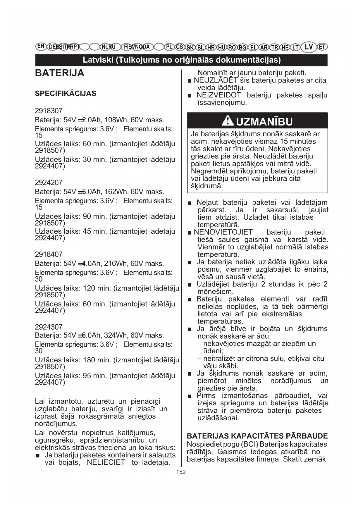 Uzlādes laiks: 180 min. (izmantojiet lādētāju 2918507) Uzlādes laiks: 95 min. (izmantojiet lādētāju 2924407) Lai izmantotu, uzturētu un pienācīgi uzglabātu bateriju, svarīgi ir izlasīt un izprast šajā rokasgrāmatā sniegtos norādījumus. Lai novērstu nopietnus kaitējumus, ugunsgrēku, sprādzienbīstamību un elektriskās strāvas trieciena un loka riskus: ■ Ja bateriju paketes konteiners ir salauzts vai bojāts, NELIECIET to lādētājā. Nomainīt ar jaunu bateriju paketi. ■ NEUZLĀDĒT šīs bateriju paketes ar cita veida lādētāju. ■ NEIZVEIDOT bateriju paketes spaiļu īssavienojumu. UZMANĪBU Ja baterijas šķidrums nonāk saskarē ar acīm, nekavējoties vismaz 15 minūtes tās skalot ar tīru ūdeni. Nekavējoties griezties pie ārsta. Neuzlādēt bateriju paketi lietus apstākļos vai mitrā vidē. Negremdēt aprīkojumu, bateriju paketi vai lādētāju ūdenī vai jebkurā citā šķidrumā. ■ Neļaut bateriju paketei vai lādētājam pārkarst. Ja ir sakarsuši, ļaujiet tiem atdzist. Uzlādēt tikai istabas temperatūrā. ■ NENOVIETOJIET bateriju paketi tiešā saules gaismā vai karstā vidē. Vienmēr to uzglabājiet normālā istabas temperatūrā. ■ Ja baterija netiek uzlādēta ilgāku laika posmu, vienmēr uzglabājiet to ēnainā, vēsā un sausā vietā. ■ Uzlādējiet bateriju 2 stundas ik pēc 2 mēnešiem. ■ Bateriju paketes elementi var radīt nelielas noplūdes, ja tā tiek pārmērīgi lietota vai arī pie ekstremālas temperatūras. ■ Ja ārējā blīve ir bojāta un šķidrums nonāk saskarē ar ādu: – nekavējoties mazgāt ar ziepēm un ūdeni; – neitralizēt ar citrona sulu, etiķivai citu vāju skābi. ■ Ja šķidrums nonāk saskarē ar acīm, piemērot minētos norādījumus un griezties pie ārsta. ■ Pirms izmantošanas pārbaudiet, vai izejas spriegums un baterijas lādētāja strāva ir piemērota bateriju paketes uzlādēšanai.