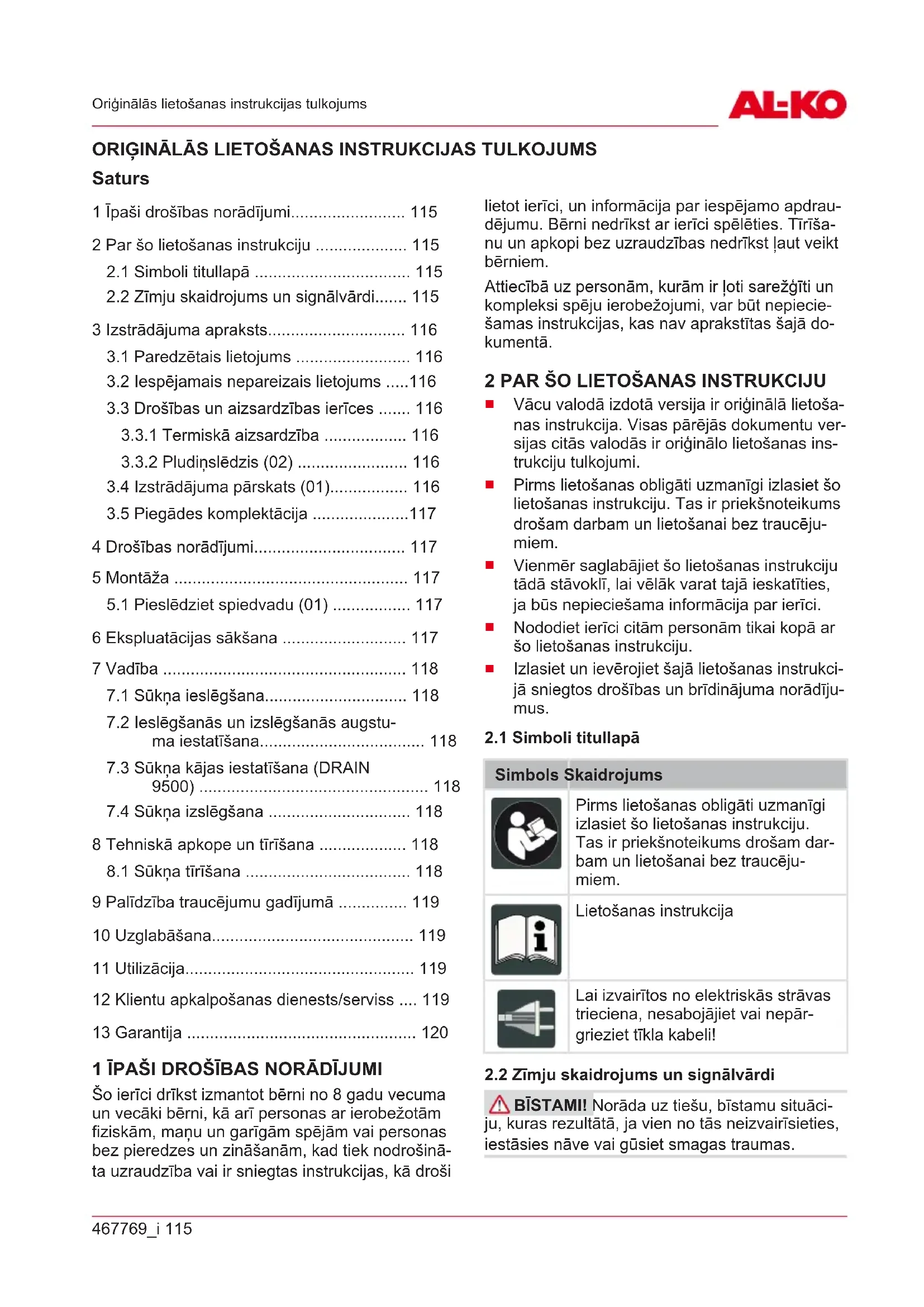 DIENESTS/SERVISS Jautājumu gadījumā par garantiju, remontu vai rezerves daļām sazinieties ar tuvāko AL-KOser- visa centru. Informāciju par tiem meklējiet šādā vietnē: www.al-ko.com/service-contactsLV