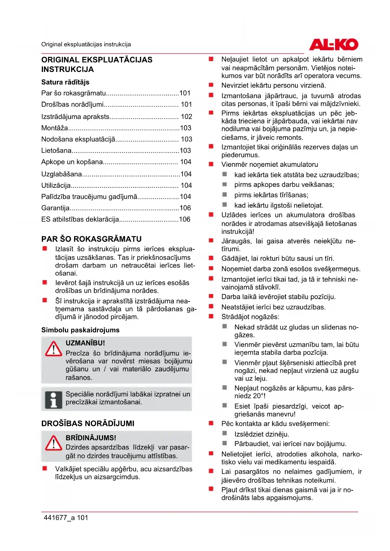 BRĪDINĀJUMS! Dzirdes apsardzības līdzekļi var pasar- gāt no dzirdes traucējumu attīstības. Valkājiet speciālu apģērbu, acu aizsardzības līdzekļus un aizsargcimdus. Neļaujiet lietot un apkalpot iekārtu bērniem vai neapmācītām personām. Vietējos notei- kumos var būt norādīts arī operatora vecums. Nevirziet iekārtu personu virzienā. Izmantošana jāpārtrauc, ja tuvumā atrodas citas personas, it īpaši bērni vai mājdzīvnieki. Pirms iekārtas ekspluatācijas un pēc jeb- kāda trieciena ir jāpārbauda, vai iekārtai nav nodiluma vai bojājuma pazīmju un, ja nepie- ciešams, ir jāveic remonts. Izmantojiet tikai oriģinālās rezerves daļas un piederumus. Vienmēr noņemiet akumulatoru kad iekārta tiek atstāta bez uzraudzības; pirms apkopes darbu veikšanas; pirms iekārtas tīrīšanas; kad iekārtu ilgstoši nelietojat. Uzlādes ierīces un akumulatora drošības norādes ir atrodamas atsevišķajā lietošanas instrukcijā! Jāraugās, lai gaisa atverēs neiekļūtu ne- tīrumi. Gādājiet, lai rokturi būtu sausi un tīri. Noņemiet darba zonā esošos svešķermeņus. Izmantojiet ierīci tikai tad, ja tā ir tehniski ne- vainojamā stāvoklī. Darba laikā ievērojiet stabilu pozīciju. Neatstājiet ierīci bez uzraudzības. Strādājot nogāzēs: Nekad strādāt uz gludas un slidenas no- gāzes. Vienmēr pievērst uzmanību tam, lai būtu ieņemta stabila darba pozīcija. Vienmēr pļaut šķērseniski attiecībā pret nogāzi, nekad nepļaut virzienā uz augšu vai uz leju. Nepļaut nogāzēs ar kāpumu, kas pārs- niedz 20°! Esiet īpaši piesardzīgi, veicot ap- griešanās manevru! Pēc kontakta ar kādu svešķermeni: Izslēdziet dzinēju. Pārbaudiet, vai ierīcei nav bojājumu. Nelietojiet ierīci, atrodoties alkohola, narko- tisko vielu vai medikamentu iespaidā. Lai pasargātos no nelaimes gadījumiem, ir jāievēro drošības tehnikas noteikumi. Pļaut drīkst tikai dienas gaismā vai ja ir no- drošināts labs apgaismojums.lv Drošības norādījumi 102 LB 36 Li Ar iekārtu nedrīkst strādāt sprādzienne- drošās vietās, kur atrodas viegli aizded- zināmi šķidrumi, gāzes vai putekļi. Elektro- instrumentu darbības laikā veidojas dzirkste- les, kas var aizdedzināt putekļus vai tvaikus. Nepakļaujiet iekārtu mitruma iedarbībai. Glabājiet ierīci sausā, bērniem un nepie- derošām personām nepieejamā vietā. Elektrodrošība PIESARDZĪBA! Saskare ar daļām, kas atrodas zem sprieguma, ir bīstama! Ja pagarinātāja kabelis ir bojāts vai pār- griezts, iekārtas kontaktdakša nekavējo- ties jāatvieno no elektrotīkla! Iekārtas pieslēguma vietā ieteicams instalēt bo- jājumstrāvas aizsargslēdzi ar nominālo bojājumstrāvas stiprumu < 30 mA. Mājas elektrotīkla raksturlielumiem jāatbilst iekārtas tehniskajiem parametriem, un ie- kārtu nedrīkst pievienot sprieguma avotam ar parametriem, kas neatbilst norādītajiem. Drīkst lietot tikai tādus pagarinātājkabeļus, kas paredzēti lietošanai ārpus telpām un kuru šķērsgriezums ir vismaz 1,5 mm