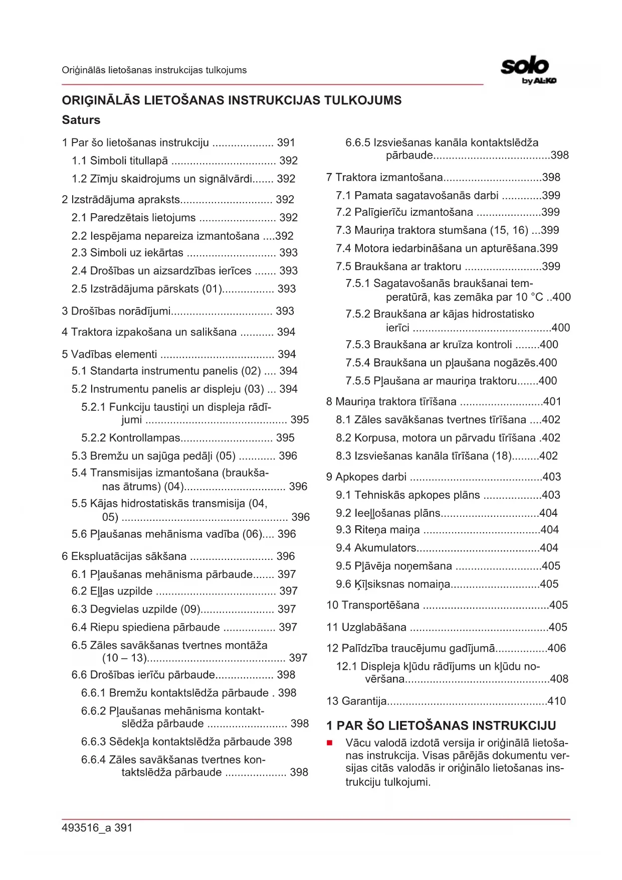 Mauriņa traktors nav paredzēts komerciālai iz- mantošanai atklātos parkos, sporta laukumos, lauksaimniecībā un mežsaimniecībā. BRĪDINĀJUMS! Mauriņa traktora pārkrau- šana var būt bīstama! Izmantojot piekabi, pie- vērsiet pastiprinātu uzmanību tam, lai netiktu pār- sniegts pieļaujamais svars, kā arī kāpumi un kri- tumi. Pārkraušanas gadījumā var neizturēt mauri- ņa traktora bremzes un tas var radīt bīstamas si- tuācijas!493516_a 393 Drošības norādījumi NORĀDĪJUMS Ņemiet vērā to, ka mauriņa traktors nedrīkst pārvietoties pa ielu, tādēļ to nav atļauts izmantot uz sabiedriskiem ceļiem.