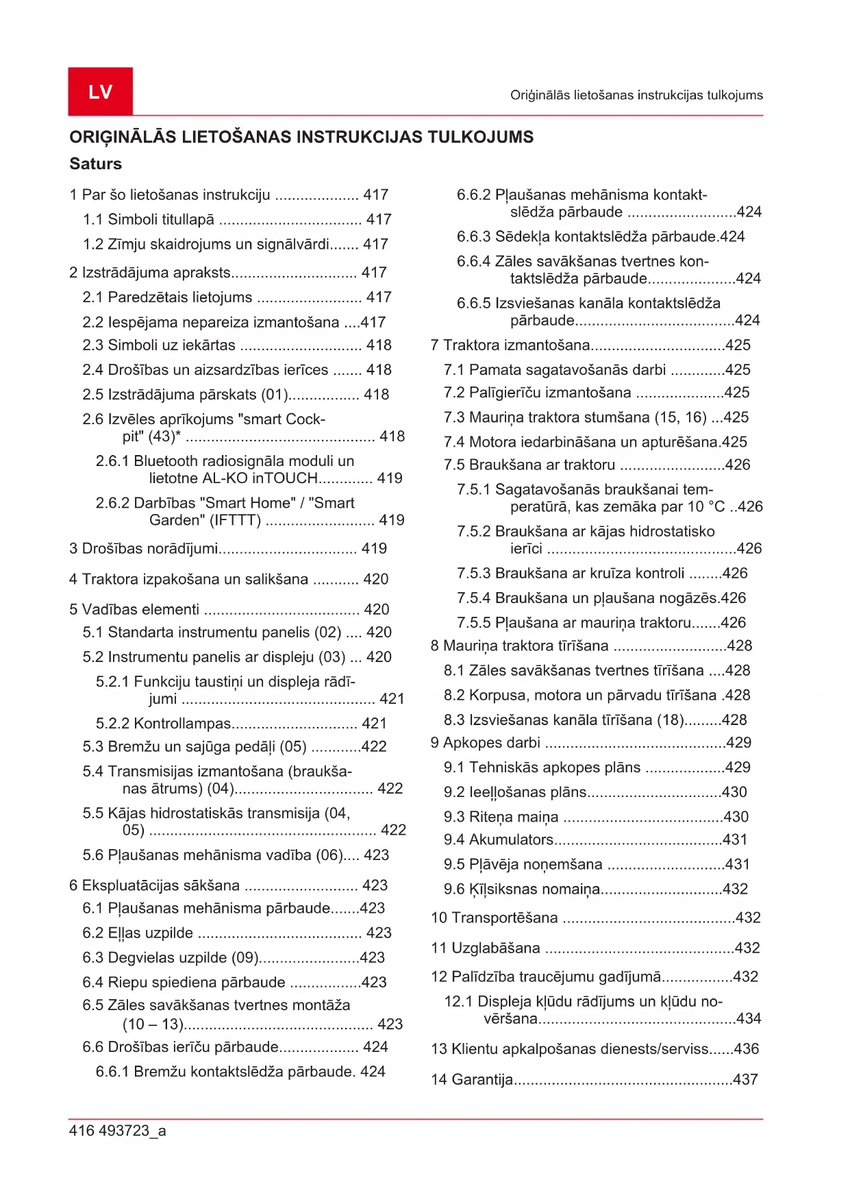 - Ja neietilpst piegādes komplektācijā, "smart Cockpit" iespējams vēlāk uzstādīt kā izvēles aprī- kojumu. Ar "smart Cockpit", jūsu viedtālruni, kas ir sade- rīgs ar Bluetooth, un lietotni AL‑KO inTOUCH jū-493723_a 419 Drošības norādījumi su būtiski uzlabosiet sava Premium klases mauri- ņa traktora lietošanas komfortu. Brauciena laikā pie "smart Cockpit" USB lādēša- nas ligzdas varat uzlādēt savu viedtālruni. Ja jūsu viedtālrunis ir aprīkots induktīvai lādēšanai, varat papildus iegādāties induktīvās lādēšanas paplaši- nājuma moduli. Sazinieties ar vietējo izplatītāju. UZMANĪBU! Plates iznīcināšanas risks. At- vienojot akumulatoru mauriņa traktora darbības laikā, iespējams iznīcināt "smart Cockpit" elektro- niskās plates.