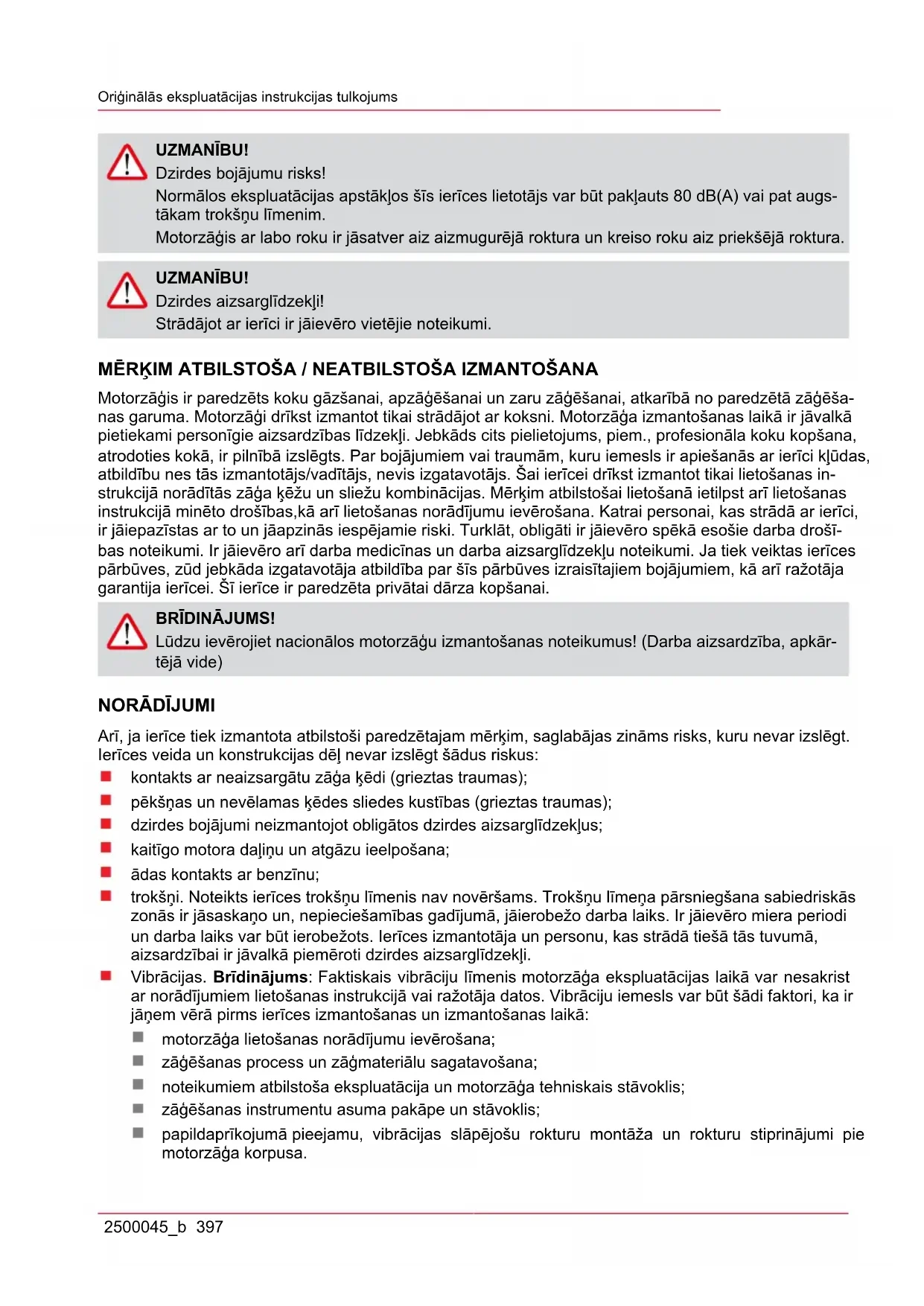 - EK ATBILSTĪBAS DEKLARĀCIJA UZMANĪBU! Pirms mūsu produktu izmantošanas lūdzam rūpīgi izlasīt šo lietošanas instrukciju, lai iepazītos ar ierīci. Uzglabājiet šo lietošanas instrukciju viegli pieejamā vietā. UZMANĪBU! Ar attiecīgu simbolu apzīmēti brīdinājuma norādījumi šajā lietošanas instrukcijā norāda uz kri- tiskiem punktiem, kas ir jāņem vērā, lai izvairītos no traumu gūšanas; izlasiet šos norādījumus rūpīgi un ņemiet tos vērā ierīces ekspluatācijas laikā. UZMANĪBU! Šis simbols apzīmē norādījumus, ka ir jāievēro, lai izvairītos no negadījumiem, kas var izraisīt traumas vai pat nāvi. UZMANĪBU! Šis simbols apzīmē norādījumus, ka ir jāievēro, lai izvairītos no mehāniskiem traucējumiem, atteikumiem vai bojājumiem. UZMANĪBU! Izlasiet šos norādījumus uzmanīgi, pirms sāciet strādāt ar zāģi un uzglabājiet tos viegli pieejamā vietā. Rūpīgi izlasiet norādījumus. Iepazīstieties ar vadības elementiem, lai spētu ierīci vadīt droši. Uzglabājiet šo lietošanas instrukciju kopā ar motorzāģi.Oriģinālās ekspluatācijas instrukcijas tulkojums 2500045_b 397 UZMANĪBU! Dzirdes bojājumu risks! Normālos ekspluatācijas apstākļos šīs ierīces lietotājs var būt pakļauts 80 dB(A) vai pat augs- tākam trokšņu līmenim. Motorzāģis ar labo roku ir jāsatver aiz aizmugurējā roktura un kreiso roku aiz priekšējā roktura. UZMANĪBU! Dzirdes aizsarglīdzekļi! Strādājot ar ierīci ir jāievēro vietējie noteikumi. MĒRĶIM ATBILSTOŠA / NEATBILSTOŠA IZMANTOŠANA Motorzāģis ir paredzēts koku gāzšanai, apzāģēšanai un zaru zāģēšanai, atkarībā no paredzētā zāģēša- nas garuma. Motorzāģi drīkst izmantot tikai strādājot ar koksni. Motorzāģa izmantošanas laikā ir jāvalkā pietiekami personīgie aizsardzības līdzekļi. Jebkāds cits pielietojums, piem., profesionāla koku kopšana, atrodoties kokā, ir pilnībā izslēgts. Par bojājumiem vai traumām, kuru iemesls ir apiešanās ar ierīci kļūdas, atbildību nes tās izmantotājs/vadītājs, nevis izgatavotājs. Šai ierīcei drīkst izmantot tikai lietošanas in- strukcijā norādītās zāģa ķēžu un sliežu kombinācijas. Mērķim atbilstošai lietošanā ietilpst arī lietošanas instrukcijā minēto drošības,kā arī lietošanas norādījumu ievērošana. Katrai personai, kas strādā ar ierīci, ir jāiepazīstas ar to un jāapzinās iespējamie riski. Turklāt, obligāti ir jāievēro spēkā esošie darba drošī- bas noteikumi. Ir jāievēro arī darba medicīnas un darba aizsarglīdzekļu noteikumi. Ja tiek veiktas ierīces pārbūves, zūd jebkāda izgatavotāja atbildība par šīs pārbūves izraisītajiem bojājumiem, kā arī ražotāja garantija ierīcei. Šī ierīce ir paredzēta privātai dārza kopšanai. BRĪDINĀJUMS! Lūdzu ievērojiet nacionālos motorzāģu izmantošanas noteikumus! (Darba aizsardzība, apkār- tējā vide) p. 418