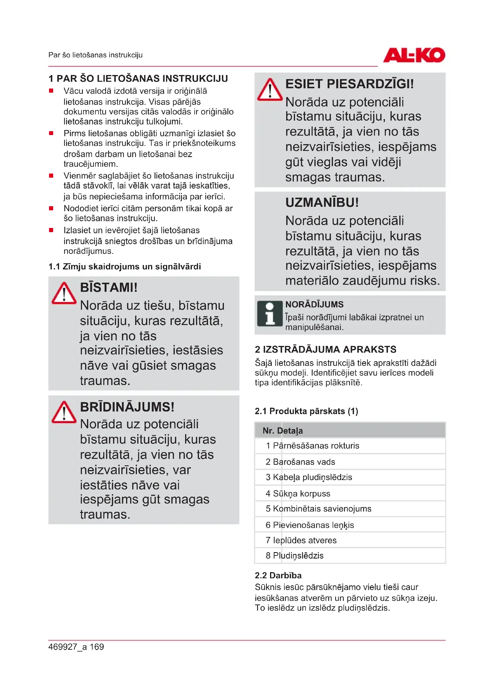 Izlasiet un ievērojiet šajā lietošanas instrukcijā sniegtos drošības un brīdinājuma norādījumus.