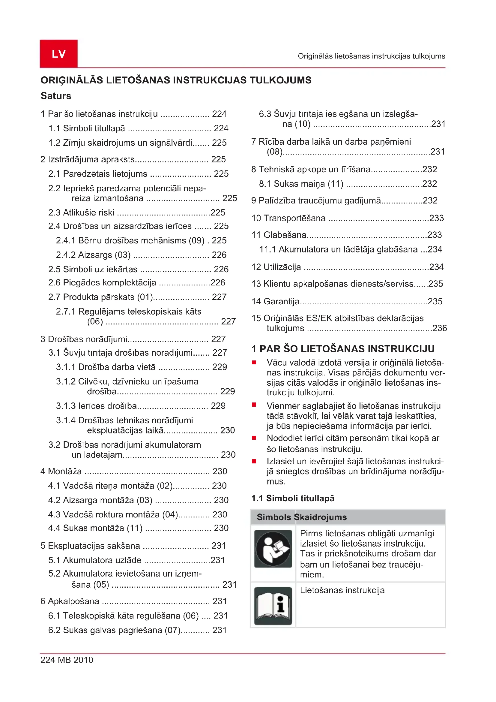 9 Palīdzība traucējumu gadījumā.................232 10 Transportēšana .........................................233 11 Glabāšana.................................................233