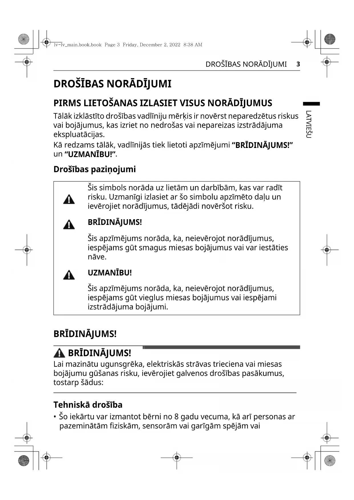 - Šo iekārtu var izmantot bērni no 8 gadu vecuma, kā arī personas ar pazeminātām fiziskām, sensorām vai garīgām spējām vai Šis simbols norāda uz lietām un darbībām, kas var radīt risku. Uzmanīgi izlasiet ar šo simbolu apzīmēto daļu un ievērojiet norādījumus, tādējādi novēršot risku. BRĪDINĀJUMS! Šis apzīmējums norāda, ka, neievērojot norādījumus, iespējams gūt smagus miesas bojājumus vai var iestāties nāve. UZMANĪBU! Šis apzīmējums norāda, ka, neievērojot norādījumus, iespējams gūt vieglus miesas bojājumus vai iespējami izstrādājuma bojājumi. lv-lv_main.book.book Page 3 Friday, December 2, 2022 8:38 AM4