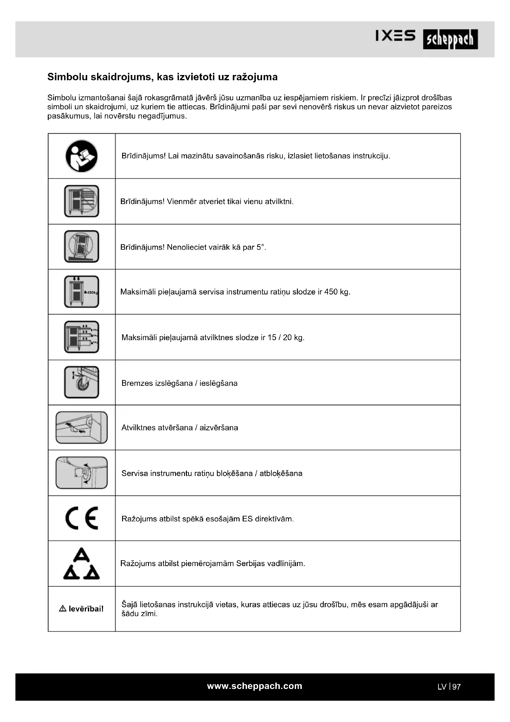 Simbolu skaidrojums, kas izvietoti uz ražojuma Simbolu izmantošanai šajā rokasgrāmatā jāvērš jūsu uzmanība uz iespējamiem riskiem. Ir precīzi jāizprot drošības simboli un skaidrojumi, uz kuriem tie attiecas. Brīdinājumi paši par sevi nenovērš riskus un nevar aizvietot pareizos pasākumus, lai novērstu negadījumus. Brīdinājums! Lai mazinātu savainošanās risku, izlasiet lietošanas instrukciju. Brīdinājums! Vienmēr atveriet tikai vienu atvilktni. Brīdinājums! Nenolieciet vairāk kā par 5°. 450kg Maksimāli pieļaujamā servisa instrumentu ratiņu slodze ir 450 kg. 15kg 20kg 20kg Maksimāli pieļaujamā atvilktnes slodze ir 15 / 20 kg. Bremzes izslēgšana / ieslēgšana Atvilktnes atvēršana / aizvēršana Servisa instrumentu ratiņu bloķēšana / atbloķēšana Ražojums atbilst spēkā esošajām ES direktīvām. Ražojums atbilst piemērojamām Serbijas vadlīnijām. m Ievērībai! Šajā lietošanas instrukcijā vietas, kuras attiecas uz jūsu drošību, mēs esam apgādājuši ar šādu zīmi.www.scheppach.com