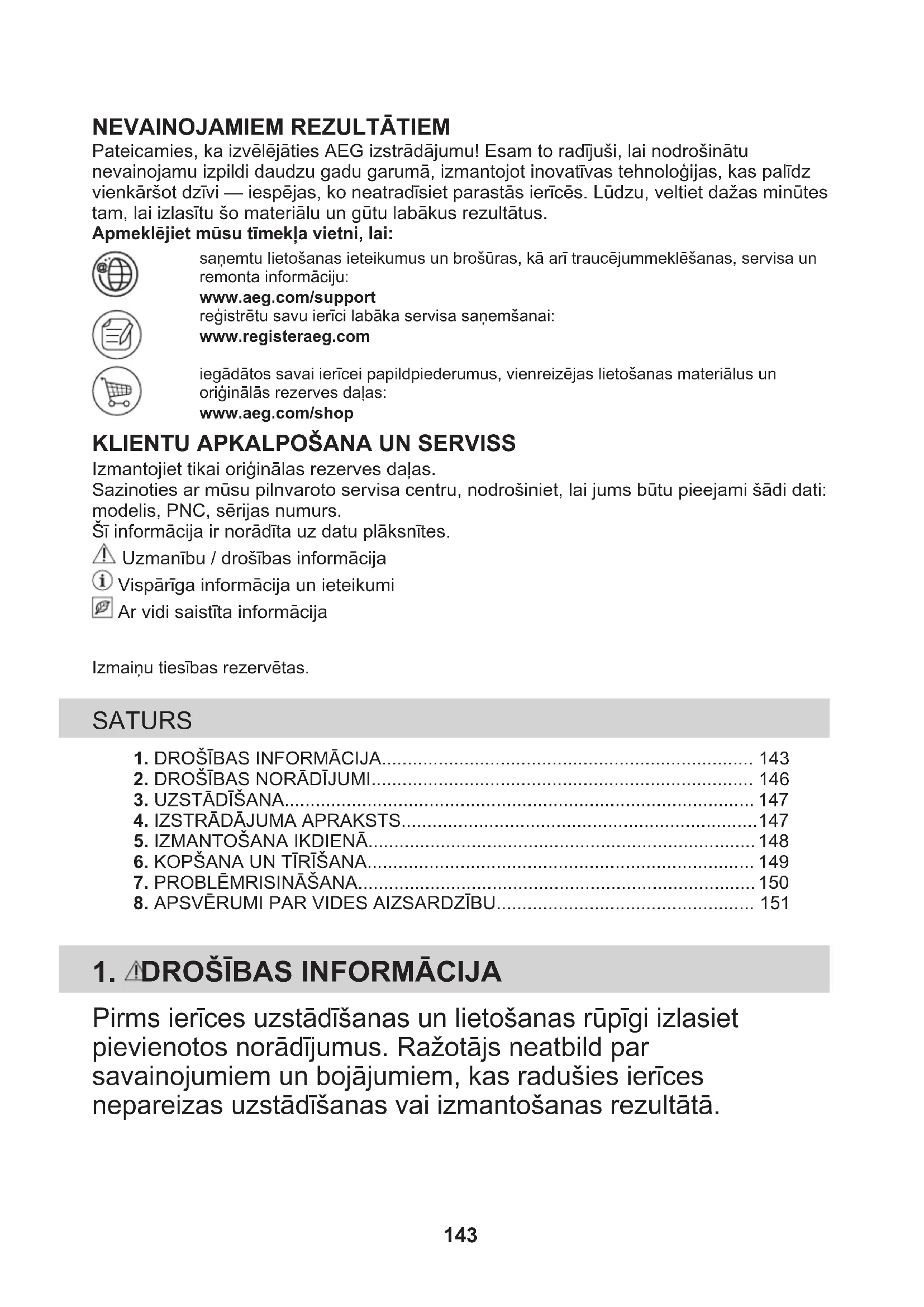 Pateicamies, ka izvēlējāties AEG izstrādājumu! Esam to radījuši, lai nodrošinātunevainojamu izpildi daudzu gadu garumā, izmantojot inovatīvas tehnoloģijas, kas palīdzvienkāršot dzīvi — iespējas, ko neatradīsiet parastās ierīcēs. Lūdzu, veltiet dažas minūtestam, lai izlasītu šo materiālu un gūtu labākus rezultātus.Apmeklējiet mūsu tīmekļa vietni, lai:saņemtu lietošanas ieteikumus un brošūras, kā arī traucējummeklēšanas, servisa unremonta informāciju:www.aeg.com/supportreģistrētu savu ierīci labāka servisa saņemšanai:www.registeraeg.comiegādātos savai ierīcei papildpiederumus, vienreizējas lietošanas materiālus unoriģinālās rezerves daļas:www.aeg.com/shop
