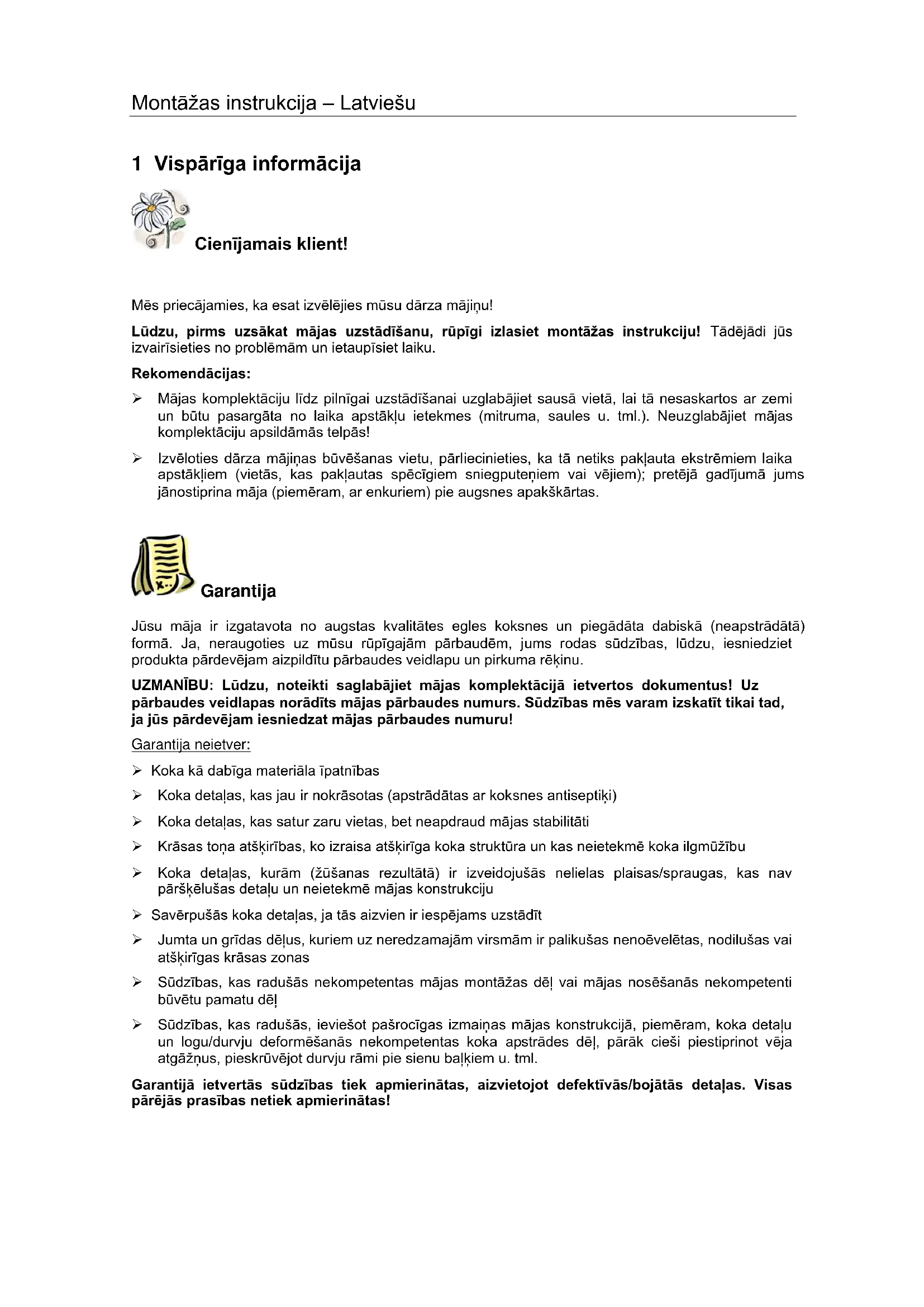 1 Vispārīga informācija Cienījamais klient! Mēs priecājamies, ka esat izvēlējies mūsu dārza mājiņu! Lūdzu, pirms uzsākat mājas uzstādīšanu, rūpīgi izlasiet montāžas instrukciju! Tādējādi jūs izvairīsieties no problēmām un ietaupīsiet laiku. Rekomendācijas: ➢ Mājas komplektāciju līdz pilnīgai uzstādīšanai uzglabājiet sausā vietā, lai tā nesaskartos ar zemi un būtu pasargāta no laika apstākļu ietekmes (mitruma, saules u. tml.). Neuzglabājiet mājas komplektāciju apsildāmās telpās! ➢ Izvēloties dārza mājiņas būvēšanas vietu, pārliecinieties, ka tā netiks pakļauta ekstrēmiem laika apstākļiem (vietās, kas pakļautas spēcīgiem sniegputeņiem vai vējiem); pretējā gadījumā jums jānostiprina māja (piemēram, ar enkuriem) pie augsnes apakškārtas. Garantija Jūsu māja ir izgatavota no augstas kvalitātes egles koksnes un piegādāta dabiskā (neapstrādātā) formā. Ja, neraugoties uz mūsu rūpīgajām pārbaudēm, jums rodas sūdzības, lūdzu, iesniedziet produkta pārdevējam aizpildītu pārbaudes veidlapu un pirkuma rēķinu. UZMANĪBU: Lūdzu, noteikti saglabājiet mājas komplektācijā ietvertos dokumentus! Uz pārbaudes veidlapas norādīts mājas pārbaudes numurs. Sūdzības mēs varam izskatīt tikai tad, ja jūs pārdevējam iesniedzat mājas pārbaudes numuru! Garantija neietver: ➢ Koka kā dabīga materiāla īpatnības ➢ Koka detaļas, kas jau ir nokrāsotas (apstrādātas ar koksnes antiseptiķi) ➢ Koka detaļas, kas satur zaru vietas, bet neapdraud mājas stabilitāti ➢ Krāsas toņa atšķirības, ko izraisa atšķirīga koka struktūra un kas neietekmē koka ilgmūžību ➢ Koka detaļas, kurām (žūšanas rezultātā) ir izveidojušās nelielas plaisas/spraugas, kas nav pāršķēlušas detaļu un neietekmē mājas konstrukciju ➢ Savērpušās koka detaļas, ja tās aizvien ir iespējams uzstādīt ➢ Jumta un grīdas dēļus, kuriem uz neredzamajām virsmām ir palikušas nenoēvelētas, nodilušas vai atšķirīgas krāsas zonas ➢ Sūdzības, kas radušās nekompetentas mājas montāžas dēļ vai mājas nosēšanās nekompetenti būvētu pamatu dēļ ➢ Sūdzības, kas radušās, ieviešot pašrocīgas izmaiņas mājas konstrukcijā, piemēram, koka detaļu un logu/durvju deformēšanās nekompetentas koka apstrādes dēļ, pārāk cieši piestiprinot vēja atgāžņus, pieskrūvējot durvju rāmi pie sienu baļķiem u. tml. Garantijā ietvertās sūdzības tiek apmierinātas, aizvietojot defektīvās/bojātās detaļas. Visas pārējās prasības netiek apmierinātas!Montāžas instrukcija – Latviešu