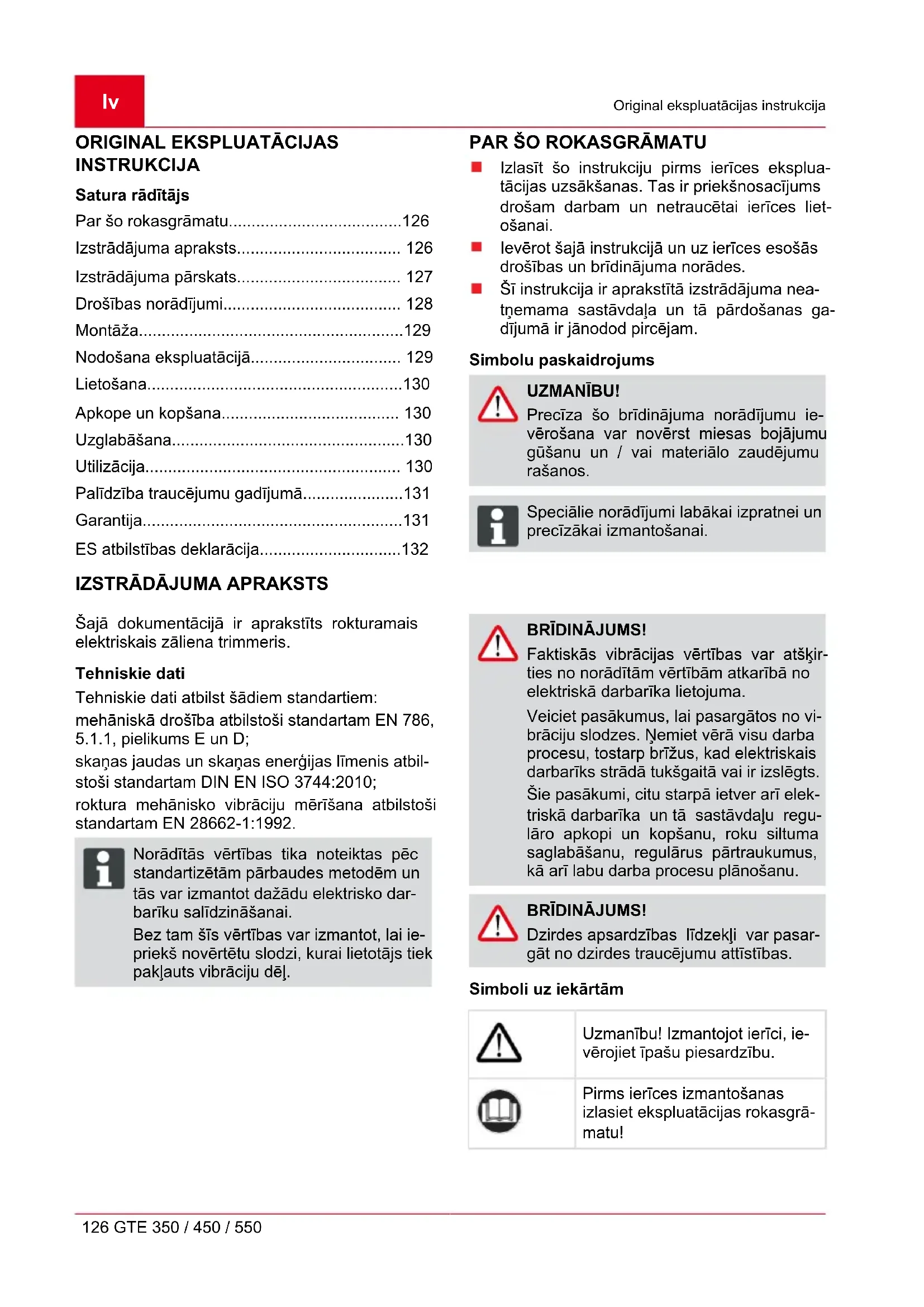 rus. UZGLABĀŠANA Tīriet iekārtu un tās sastāvdaļas pēc katras lietošanas. ADVICE Pakariniet zāliena trimmeri aiz roktura. Šādi griezējgalva netiks lieki pārslogota. Glabājiet iekārtu sausā, no sala aizsargātā vietā. UTILIZĀCIJA Nokalpojušās iekārtas, baterijas un akumulatorus nedrīkst izmest sadzī- ves atkritumos! Iepakojums, iekārta un piederumi ir izga- tavoti no otrreiz pārstrādājamiem mate- riāliem un jānodod atbilstīgai utilizācijai.Palīdzība traucējumu gadījumā 440083_c 131 PALĪDZĪBA TRAUCĒJUMU GADĪJUMĀ Problēma Iespējamais iemesls Risinājums Motors nesāk darboties Motora aizsardzības slēdzis ir izslēdzies Tīklā nav sprieguma Uzgaidiet līdz motora aizsardzības slēdzis atkal ieslēgs trimmeri. Pārbaudiet drošības ierīces / aiz- sardzības slēdzi, elektriķim ir jāpārbauda elektroapgāde Pārbaudiet pagarinātājkabeli, ja nepieciešams, nomainiet Trimmeris vibrē Ir netīra auklas spole Iztīriet auklas spoli, ja nepie- ciešams, nomainiet Auklas spole ir tukša Nomainiet auklas spoliSlikti atgriež zāli Nepietiekams auklas garums Noregulējiet auklas garumu ADVICE Ja rodas šajā tabulā neminētie bojājumi vai bojājumi, ar kuriem nevarat pats tikt galā, griezieties mūsu klientu apkalpošanas dienestā. GARANTIJA Ja ar likumu noteiktajā termiņā tiek iesniegta prasība par bojājumu novēršanu, iespējamos materiālu vai ražošanas defektus mēs novēršam, veicot remontu vai apmainot ierīci. Prasību iesniegšanas termiņš ir atkarīgs no attiecīgās valsts likumdošanas, kurā ierīce ir pirkta. Mūsu dotā garantija ir spēkā tikai šādos gadījumos Ierīce tiek atbilstoši izmantota Tiek ievērota lietošanas pamācība Tiek izmantotas tikai oriģinālas rezerves daļas Garantija tiek anulēta šādos gadījumos: Ir mēģināts patstāvīgi salabot ierīci Ierīcei ir veiktas tehniskas izmaiņas Ierīce tiek neatbilstoši izmantota (piem., komer- ciālām vai sabiedriskām vajadzībām) Garantija neattiecas uz: Krāsojuma defektiem, kas rodas parasta nodiluma dēļ Dilstošajām daļām, kas rezerves daļu kartē ir atzīmētas ar rāmīti [xxx xxx (x)] Iekšdedzes motoriem – uz tiem attiecas konkrētā motora izgatavotāja atsevišķie garantijas noteikumi Garantija stājas spēkā ar brīdi, kad gala patērētājs to iegādājas. Noteicošais ir datums uz pirkuma oriģinālās kvīts. Ja nepieciešams izmantot garantiju, lūdzu, vērsieties ar šo garantijas apliecinājumu un pirkuma čeku pie preces pārdevēja vai tuvākajā autorizētajā klientu apkalpošanas centrā. Šis garantijas apliecinājums neattiecas uz pircēja likumīgajām tiesībām attiecībā uz defektu novēršanu pret pārdevēju.lv ES atbilstības deklarācija 132 GTE 350 / 450 / 550
