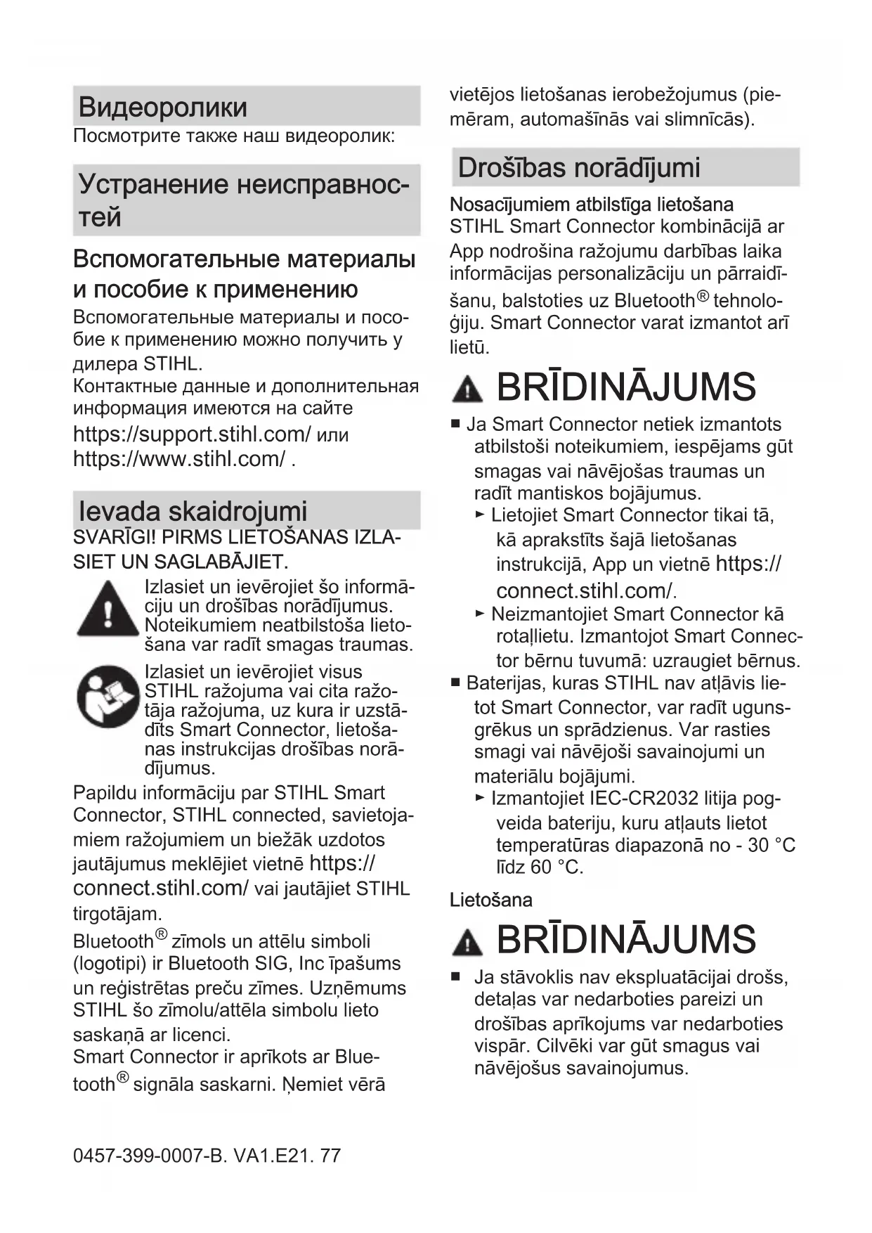 SIET UN SAGLABĀJIET. Izlasiet un ievērojiet šo informā‐ ciju un drošības norādījumus. Noteikumiem neatbilstoša lieto‐ šana var radīt smagas traumas. Izlasiet un ievērojiet visus STIHL ražojuma vai cita ražo‐ tāja ražojuma, uz kura ir uzstā‐ dīts Smart Connector, lietoša‐ nas instrukcijas drošības norā‐ dījumus. Papildu informāciju par STIHL Smart Connector, STIHL connected, savietoja‐ miem ražojumiem un biežāk uzdotos jautājumus meklējiet vietnē https:// connect.stihl.com/ vai jautājiet STIHL tirgotājam. Bluetooth