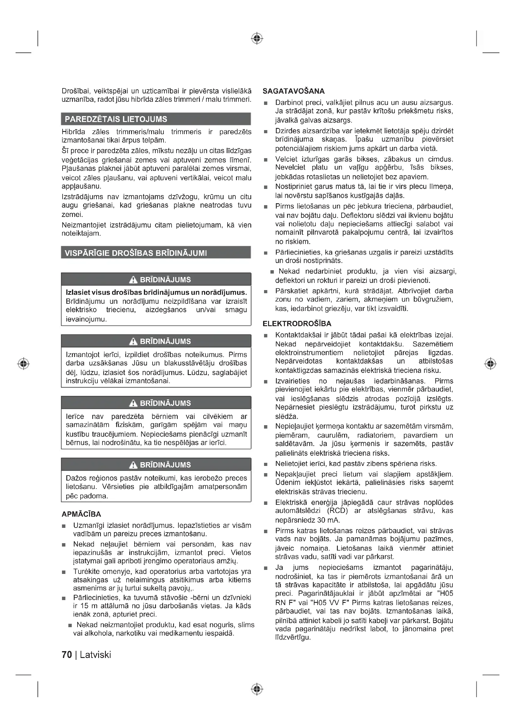 Hibrīda zāles trimmeris/malu trimmeris ir paredzēts izmantošanai tikai ārpus telpām. Šī prece ir paredzēta zāles, mīkstu nezāļu un citas līdzīgas veģetācijas griešanai zemes vai aptuveni zemes līmenī. Pļaušanas plaknei jābūt aptuveni paralēlai zemes virsmai, veicot zāles pļaušanu, vai aptuveni vertikālai, veicot malu appļaušanu. Izstrādājums nav izmantojams dzīvžogu, krūmu un citu augu griešanai, kad griešanas plakne neatrodas tuvu zemei. Neizmantojiet izstrādājumu citam pielietojumam, kā vien noteiktajam. VISPĀRĪGIE DROŠĪBAS BRĪDINĀJUMI