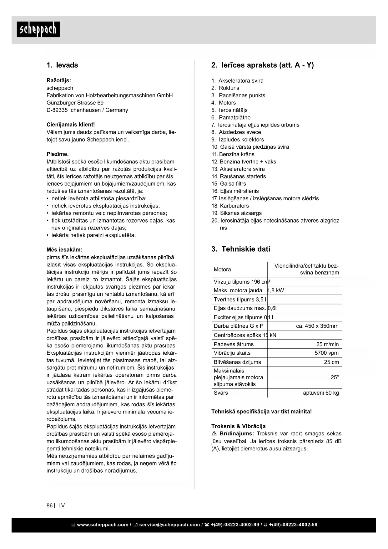 - iekārta netiek pareizi ekspluatēta. Mēs iesakām: pirms šīs iekārtas ekspluatācijas uzsākšanas pilnībā izlasīt visas ekspluatācijas instrukcijas. Šo eksplua- tācijas instrukciju mērķis ir palīdzēt jums iepazīt šo iekārtu un pareizi to izmantot. Šajās ekspluatācijas instrukcijās ir iekļautas svarīgas piezīmes par iekār- tas drošu, prasmīgu un rentablu izmantošanu, kā arī par apdraudējuma novēršanu, remonta izmaksu ie- taupīšanu, piespiedu dīkstāves laika samazināšanu, iekārtas uzticamības palielināšanu un kalpošanas mūža paildzināšanu. Papildus šajās ekspluatācijas instrukcijās ietvertajām drošības prasībām ir jāievēro attiecīgajā valstī spē- kā esošo piemērojamo likumdošanas aktu prasības. Ekspluatācijas instrukcijām vienmēr jāatrodas iekār- tas tuvumā. Ievietojiet tās plastmasas mapē, lai aiz- sargātu pret mitrumu un netīrumiem. Šīs instrukcijas ir jāizlasa katram iekārtas operatoram pirms darba uzsākšanas un pilnībā jāievēro. Ar šo iekārtu drīkst strādāt tikai tādas personas, kas ir izgājušas piemē- rotu apmācību tās izmantošanai un ir informētas par dažādajiem apdraudējumiem, kas rodas šīs iekārtas ekspluatācijas laikā. Ir jāievēro minimālā vecuma ie- robežojums. Papildus šajās ekspluatācijas instrukcijās ietvertajām drošības prasībām un valstī spēkā esošo piemēroja- mo likumdošanas aktu prasībām ir jāievēro vispārpie- ņemti tehniskie noteikumi. Mēs neuzņemamies atbildību par nelaimes gadīju- miem vai zaudējumiem, kas rodas, ja neņem vērā šo instrukciju un drošības norādījumus. www.scheppach.com / service@scheppach.com / +(49)-08223-4002-99 / +(49)-08223-4002-58