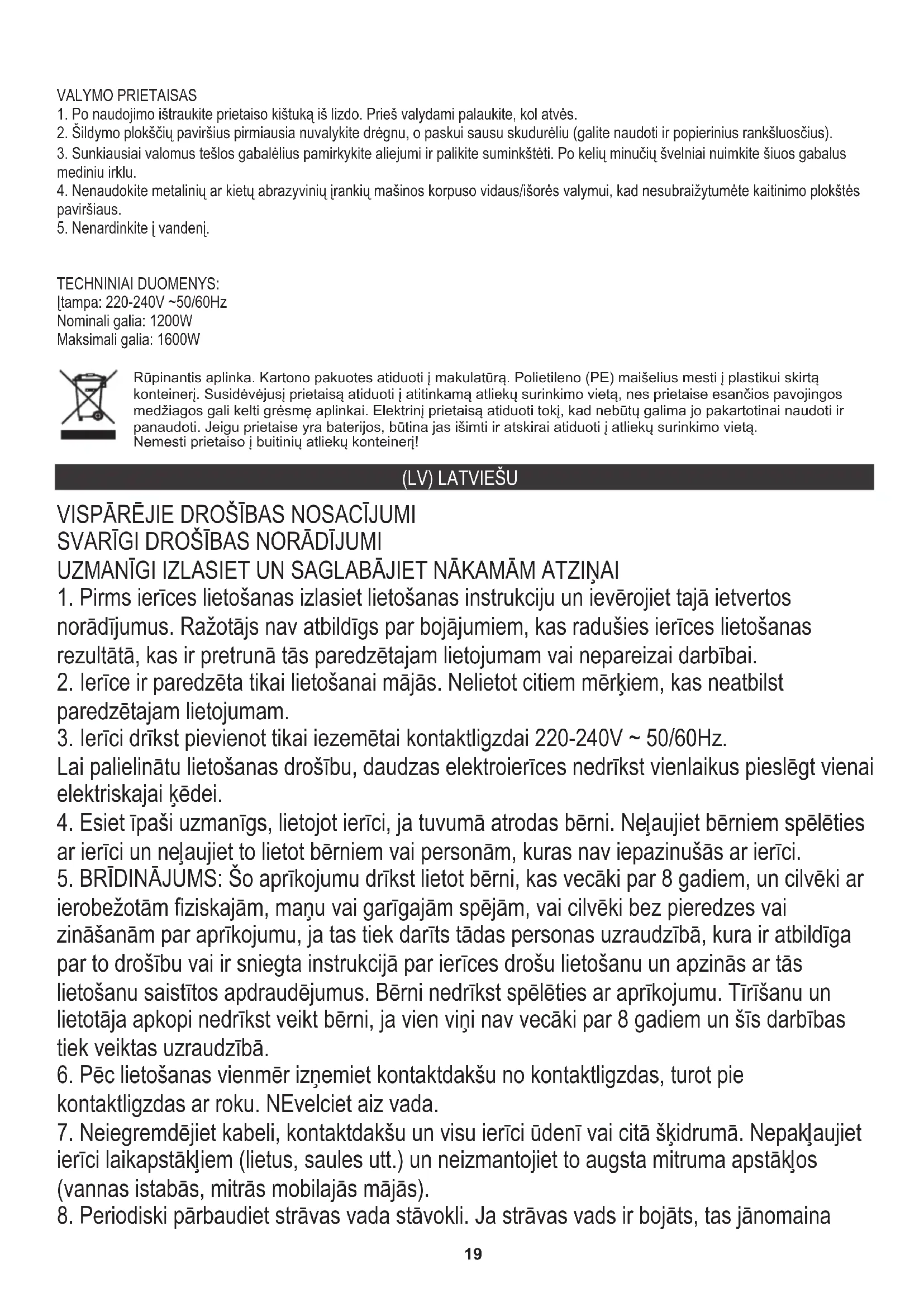 Maksimālā jauda: 1600W TEHNISKIE DATI: Apkārtējās vides aizsardzība. Kartona iepakojumu, lūdzu, nododiet otreizējai pārstrādei. Polietilēna maisiņus (PE) izmest plastmasas izstrādājumiem paredzētajos konteineros. Lietotās elektropreces nododiet attiecīgajos pieņemšanas punktos. Ierīcē satur bīstamas sastāvdaļas, kas var izraisīt draudus apkārtējai videi. Elektroierīce jānodod tā, lai ierobežotu tās atkārtotu izmantošanu. Ja ierīcē atrodas baterijas, izņemiet tās un nododiet pieņemšanas punktā atsevišķi. Produktu neizmest sadzīves atkritumu konteinerā!22 ÜLDISED OHUTUSTINGIMUSED OLULISED OHUTUSJUHISED LUGEGE HOOLIKALT JA SÄILITA EDASISEKS KASUTAMISEKS