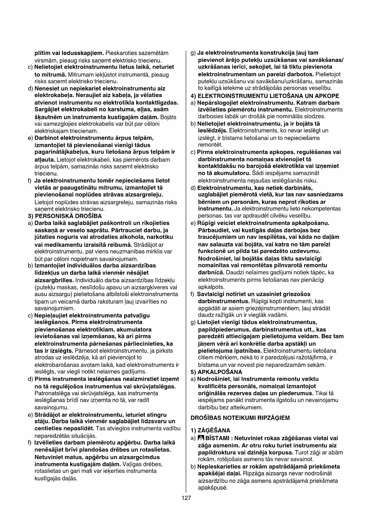 UZMANĪBU!Rūpīgiizlasietvisusdrošības noteikumus. Šeit sniegto drošības noteikumu un norādījumu neievērošana var izraisīt aizdegšanos un būt par cēloni elektriskajam triecienam vai nopietnam savainojumam. Pēcizlasīšanasuzglabājietšos noteikumusturpmākaiizmantošanai. Turpmākajā izklāstā lietotais apzīmējums “elektroinstruments” attiecas gan uz tīkla elektroinstrumentiem (ar elektrokabeli), gan arī uz akumulatora elektroinstrumentiem (bez elektrokabeļa). 1)DROŠĪBADARBAVIETĀ a) Sekojiet,laidarbavietabūtutīraunsakārtota. Nekārtīgā darba vietā vai sliktā apgaismojumā var viegli notikt nelaimes gadījums. b) Nelietojietelektroinstrumentueksplozīvuvai ugunsnedrošuvielutuvumāunvietāsar paaugstinātugāzesvaiputekļusaturugaisā. Darba laikā instruments nedaudz dzirksteļo, un tas var izsaukt viegli degošu putekļu vai tvaiku aizdegšanos. c) Lietojotelektroinstrumentu,neļaujietnepiederošām personāmunjoīpašibērniemtuvotiesdarbavietai. Citu personu klātbūtne var novērst uzmanību, un tā rezultātā jūs varat zaudēt kontroli pār instrumentu. 2)ELEKTRODROŠĪBA a) Elektroinstrumentakontaktdakšaijābūtpiemērotai elektrotīklakontaktligzdai.Kontaktdakšas konstrukcijunedrīkstnekādāveidāmainīt. Nelietojietkontaktdakšassalāgotājus,ja elektroinstruments caur kabeli tiek savienots ar aizsargzemējumaķēdi. Neizmainītas konstrukcijas kontaktdakša, kas piemērota kontaktligzdai, ļauj samazināt elektriskā trieciena saņemšanas risku. b) Darbalaikānepieskarietiessazemētiem priekšmetiem,piemēram,caurulēm,radiatoriem,127 plītīmvailedusskapjiem. Pieskaroties sazemētām virsmām, pieaug risks saņemt elektrisko triecienu. c) Nelietojietelektroinstrumentulietuslaikā,neturiet tomitrumā. Mitrumam iekļūstot instrumentā, pieaug risks saņemt elektrisko triecienu. d) Nenesiet un nepiekariet elektroinstrumentu aiz elektrokabeļa.Neraujietaizkabeļa,javēlaties atvienotinstrumentunoelektrotīklakontaktligzdas. Sargājietelektrokabelinokarstuma,eļļas,asām šķautnēmuninstrumentakustīgajāmdaļām. Bojāts vai samezglojies elektrokabelis var būt par cēloni elektriskajam triecienam. e) Darbinotelektroinstrumentuārpustelpām, izmantojiettāpievienošanaivienīgitādus pagarinātājkabeļus,kurulietošanaārpustelpāmir atļauta. Lietojot elektrokabeli, kas piemērots darbam ārpus telpām, samazinās risks saņemt elektrisko triecienu. f) Jaelektroinstrumentutomērnepieciešamslietot vietāsarpaaugstinātumitrumu,izmantojiettā pievienošanainoplūdesstrāvasaizsargreleju. Lietojot noplūdes strāvas aizsargreleju, samazinās risks saņemt elektrisko triecienu.
