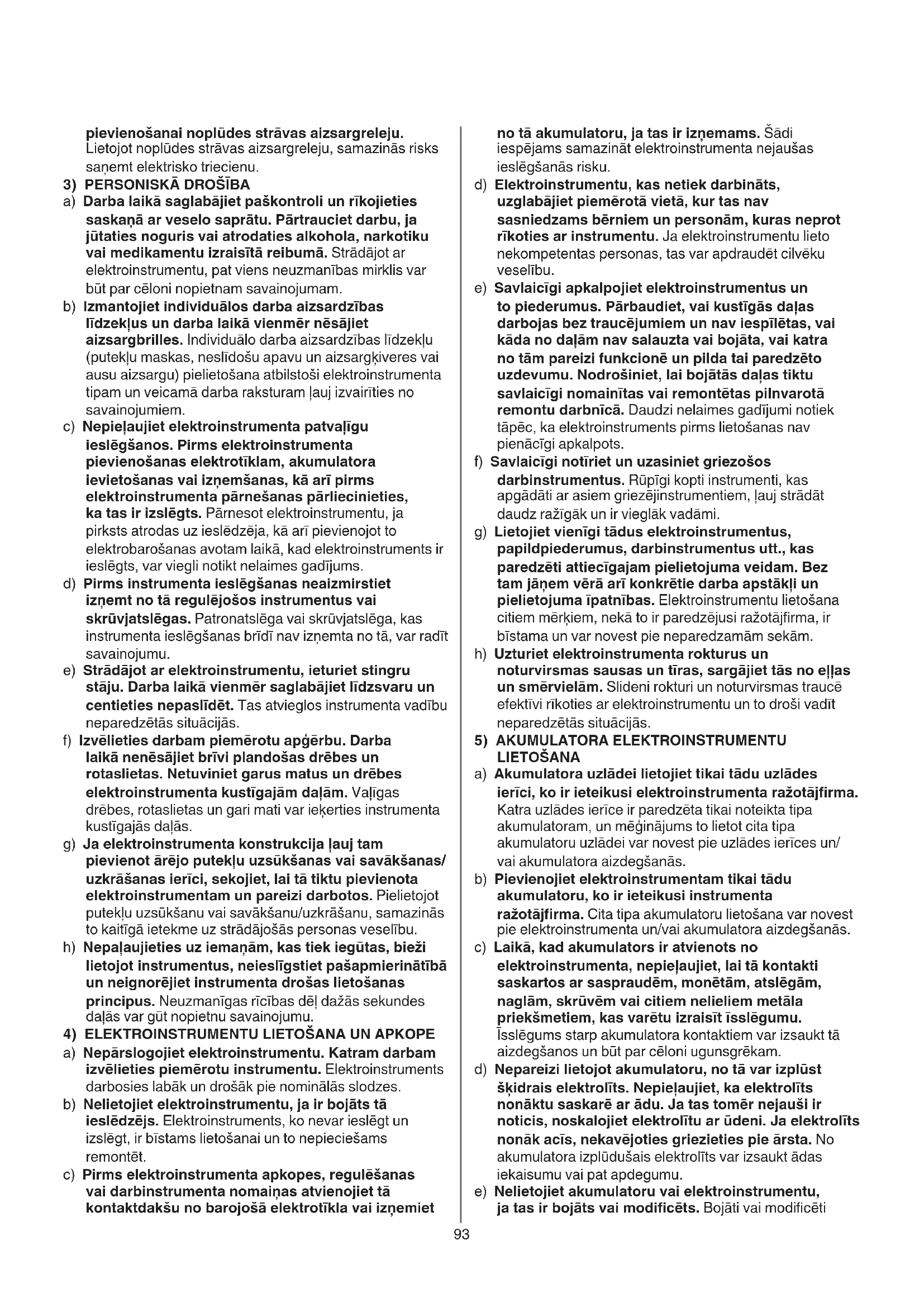 a) Nepārslogojiet elektroinstrumentu. Katram darbam izvēlieties piemērotu instrumentu. Elektroinstruments darbosies labāk un drošāk pie nominālās slodzes. b) Nelietojiet elektroinstrumentu, ja ir bojāts tā ieslēdzējs. Elektroinstruments, ko nevar ieslēgt un izslēgt, ir bīstams lietošanai un to nepieciešams remontēt. c) Pirms elektroinstrumenta apkopes, regulēšanas vai darbinstrumenta nomaiņas atvienojiet tā kontaktdakšu no barojošā elektrotīkla vai izņemiet94