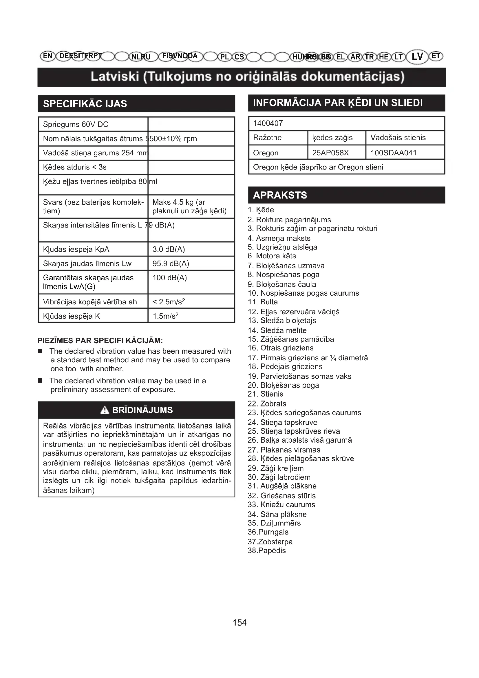 1400407Ražotne ķēdes zāģis Vadošais stienisOregon 25AP058X 100SDAA041Oregon ķēde jāaprīko ar Oregon stieni APRAKSTS 1. Ķēde2. Roktura pagarinājums3. Rokturis zāģim ar pagarinātu rokturi4. Asmeņa maksts5. Uzgriežņu atslēga6. Motora kāts7. Bloķēšanas uzmava8. Nospiešanas poga9. Bloķēšanas čaula10. Nospiešanas pogas caurums11. Bulta12. Eļļas rezervuāra vāciņš13. Slēdža bloķētājs14. Slēdža mēlīte15. Zāģēšanas pamācība16. Otrais grieziens17. Pirmais grieziens ar ¼ diametrā18. Pēdējais grieziens19. Pārvietošanas somas vāks20. Bloķēšanas poga21. Stienis22. Zobrats23. Ķēdes spriegošanas caurums 24. Stieņa tapskrūve25. Stieņa tapskrūves rieva26. Baļķa atbalsts visā garumā27. Plakanas virsmas 28. Ķēdes pielāgošanas skrūve29. Zāģi kreiļiem30. Zāģi labročiem31. Augšējā plāksne32. Griešanas stūris33. Kniežu caurums34. Sāna plāksne35. Dziļummērs36.Purngals37.Zobstarpa38.Papēdis 154LT HETR