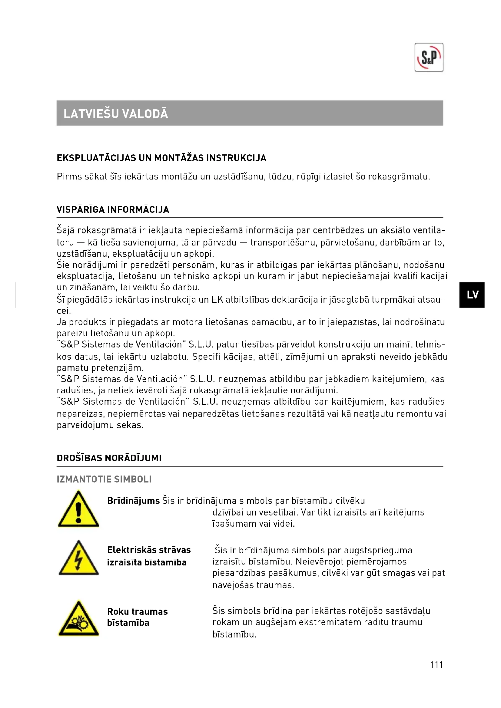 Šajā rokasgrāmatā ir iekļauta nepieciešamā informācija par centrbēdzes un aksiālo ventila- toru — kā tieša savienojuma, tā ar pārvadu — transportēšanu, pārvietošanu, darbībām ar to, uzstādīšanu, ekspluatāciju un apkopi. Šie norādījumi ir paredzēti personām, kuras ir atbildīgas par iekārtas plānošanu, nodošanu ekspluatācijā, lietošanu un tehnisko apkopi un kurām ir jābūt nepieciešamajai kvalifi kācijai un zināšanām, lai veiktu šo darbu. Šī piegādātās iekārtas instrukcija un EK atbilstības deklarācija ir jāsaglabā turpmākai atsau- cei. Ja produkts ir piegādāts ar motora lietošanas pamācību, ar to ir jāiepazīstas, lai nodrošinātu pareizu lietošanu un apkopi. “S&P Sistemas de Ventilación” S.L.U. patur tiesības pārveidot konstrukciju un mainīt tehnis- kos datus, lai iekārtu uzlabotu. Specifi kācijas, attēli, zīmējumi un apraksti neveido jebkādu pamatu pretenzijām. “S&P Sistemas de Ventilación” S.L.U. neuzņemas atbildību par jebkādiem kaitējumiem, kas radušies, ja netiek ievēroti šajā rokasgrāmatā iekļautie norādījumi. “S&P Sistemas de Ventilación” S.L.U. neuzņemas atbildību par kaitējumiem, kas radušies nepareizas, nepiemērotas vai neparedzētas lietošanas rezultātā vai kā neatļautu remontu vai pārveidojumu sekas.