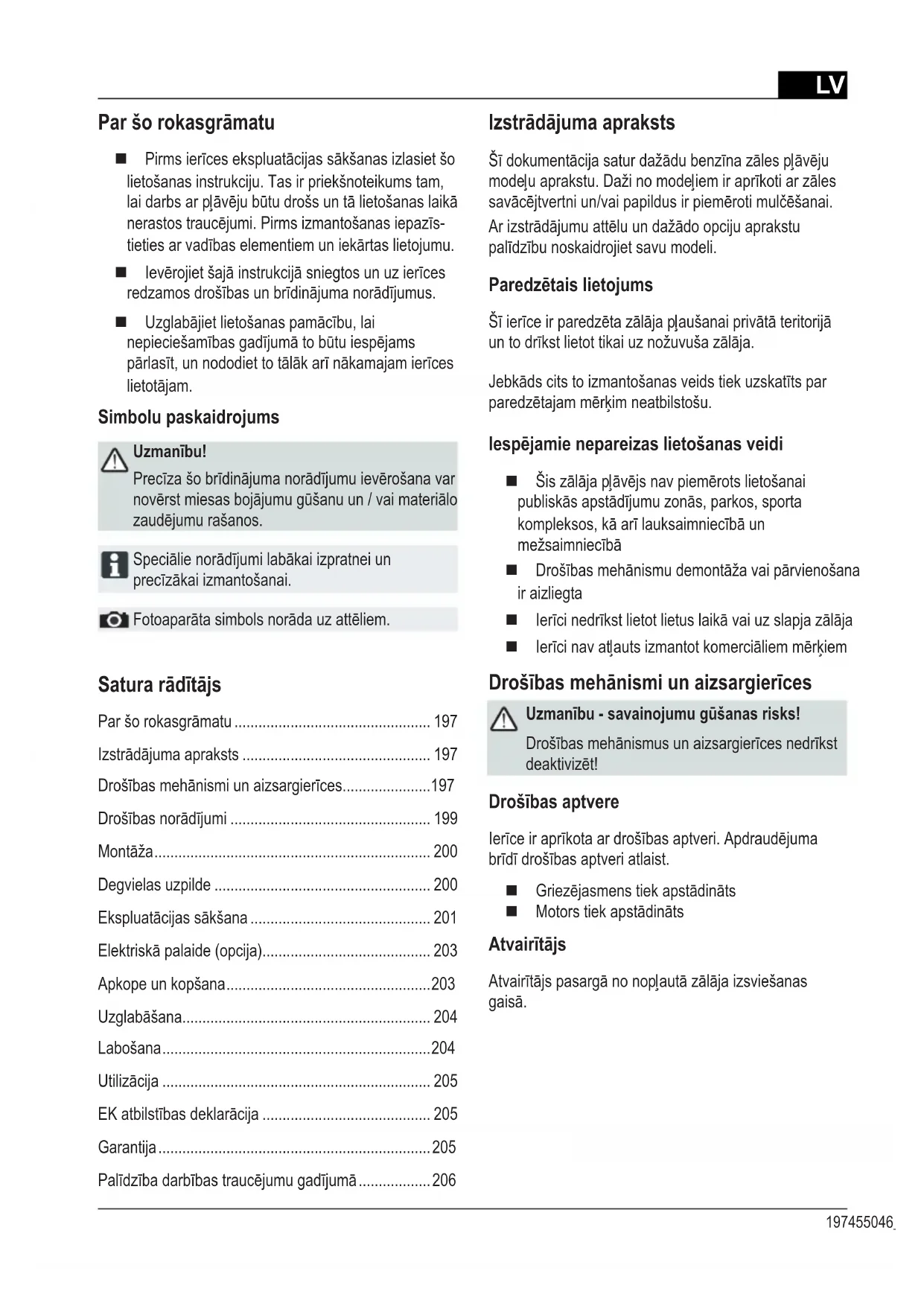 - Kontrollige niiduki tera Rikete korral, mida pole selles tabelis või mida te ise kõrvaldada ei saa, pöörduge meie volitatud klienditeeninduse poole.LV 197455046_e Satura rādītājs Paršorokasgrāmatu ................................................. 197 Izstrādājumaapraksts ............................................... 197 Drošībasmehānismiunaizsargierīces ...................... 197 Drošībasnorādījumi .................................................. 199 Montāža ..................................................................... 200 Degvielas uzpilde ...................................................... 200 Ekspluatācijassākšana ............................................. 201 Elektriskāpalaide(opcija) .......................................... 203 Apkope un kopšana ................................................... 203 Uzglabāšana .............................................................. 204 Labošana ................................................................... 204 Utilizācija ................................................................... 205 EKatbilstībasdeklarācija .......................................... 205 Garantija .................................................................... 205 Palīdzībadarbībastraucējumugadījumā .................. 206 Par šo rokasgrāmatu Pirmsierīcesekspluatācijassākšanasizlasietšo lietošanas instrukciju. Tas ir priekšnoteikums tam, laidarbsarpļāvējubūtudrošsuntālietošanaslaikā nerastostraucējumi.Pirmsizmantošanasiepazīs- tietiesarvadībaselementiemuniekārtaslietojumu. Ievērojietšajāinstrukcijāsniegtosunuzierīces redzamosdrošībasunbrīdinājumanorādījumus. Uzglabājietlietošanaspamācību,lai nepieciešamībasgadījumātobūtuiespējams pārlasīt,unnododiettotālākarīnākamajamierīces lietotājam. Simbolu paskaidrojums Uzmanību! Precīzašobrīdinājumanorādījumuievērošanavar novērstmiesasbojājumugūšanuun/vaimateriālo zaudējumurašanos. Speciālienorādījumilabākaiizpratneiun precīzākaiizmantošanai. Fotoaparātasimbolsnorādauzattēliem. Izstrādājuma apraksts Šīdokumentācijasaturdažādubenzīnazālespļāvēju modeļuaprakstu.Dažinomodeļiemiraprīkotiarzāles savācējtvertniun/vaipapildusirpiemērotimulčēšanai. Arizstrādājumuattēluundažādoopcijuaprakstu palīdzībunoskaidrojietsavumodeli. Paredzētais lietojums Šīierīceirparedzētazālājapļaušanaiprivātāteritorijā untodrīkstlietottikaiuznožuvušazālāja. Jebkādscitstoizmantošanasveidstiekuzskatītspar paredzētajammērķimneatbilstošu. Iespējamie nepareizas lietošanas veidi Šiszālājapļāvējsnavpiemērotslietošanai publiskāsapstādījumuzonās,parkos,sporta kompleksos,kāarīlauksaimniecībāun mežsaimniecībā Drošībasmehānismudemontāžavaipārvienošana ir aizliegta Ierīcinedrīkstlietotlietuslaikāvaiuzslapjazālāja Ierīcinavatļautsizmantotkomerciāliemmērķiem Drošības mehānismi un aizsargierīces Uzmanību - savainojumu gūšanas risks! Drošībasmehānismusunaizsargierīcesnedrīkst deaktivizēt! Drošības aptvere Ierīceiraprīkotaardrošībasaptveri.Apdraudējuma brīdīdrošībasaptveriatlaist. Griezējasmenstiekapstādināts Motorstiekapstādināts Atvairītājs Atvairītājspasargānonopļautāzālājaizsviešanas gaisā.LV Oriģinālās lietošanas instrukcijas tulkojums