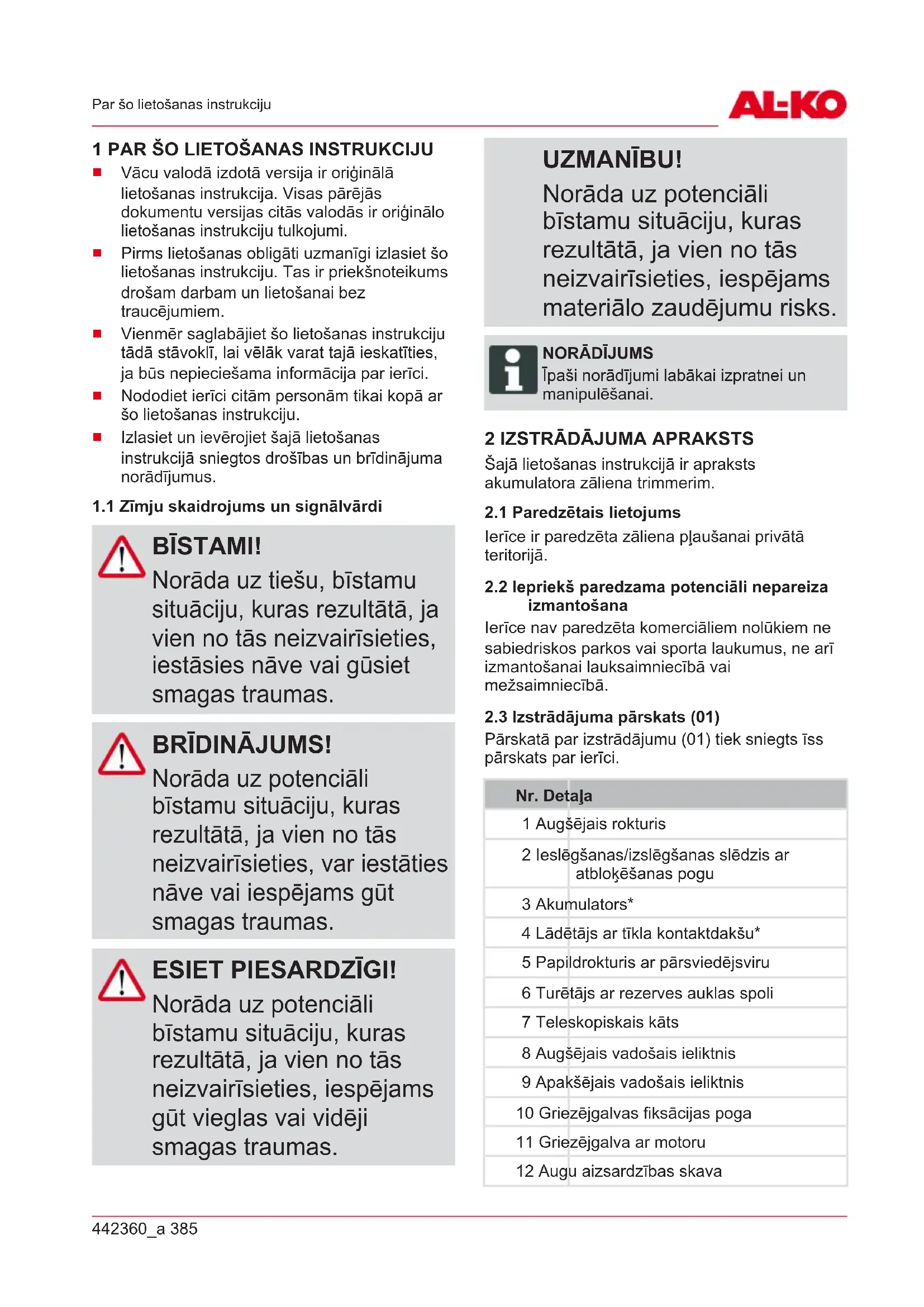 Pārskatā par izstrādājumu (01) tiek sniegts īss pārskats par ierīci. Nr. Detaļa 1 Augšējais rokturis 2 Ieslēgšanas/izslēgšanas slēdzis ar atbloķēšanas pogu 3 Akumulators* 4 Lādētājs ar tīkla kontaktdakšu* 5 Papildrokturis ar pārsviedējsviru 6 Turētājs ar rezerves auklas spoli 7 Teleskopiskais kāts 8 Augšējais vadošais ieliktnis 9 Apakšējais vadošais ieliktnis 10 Griezējgalvas fiksācijas poga 11 Griezējgalva ar motoru 12 Augu aizsardzības skavaLV 386 GT 4030 Izstrādājuma apraksts Nr. Detaļa 13 Vadošais ritenis 14 Aizsargvairogs ar auklas griezēju 15 Auklas spole