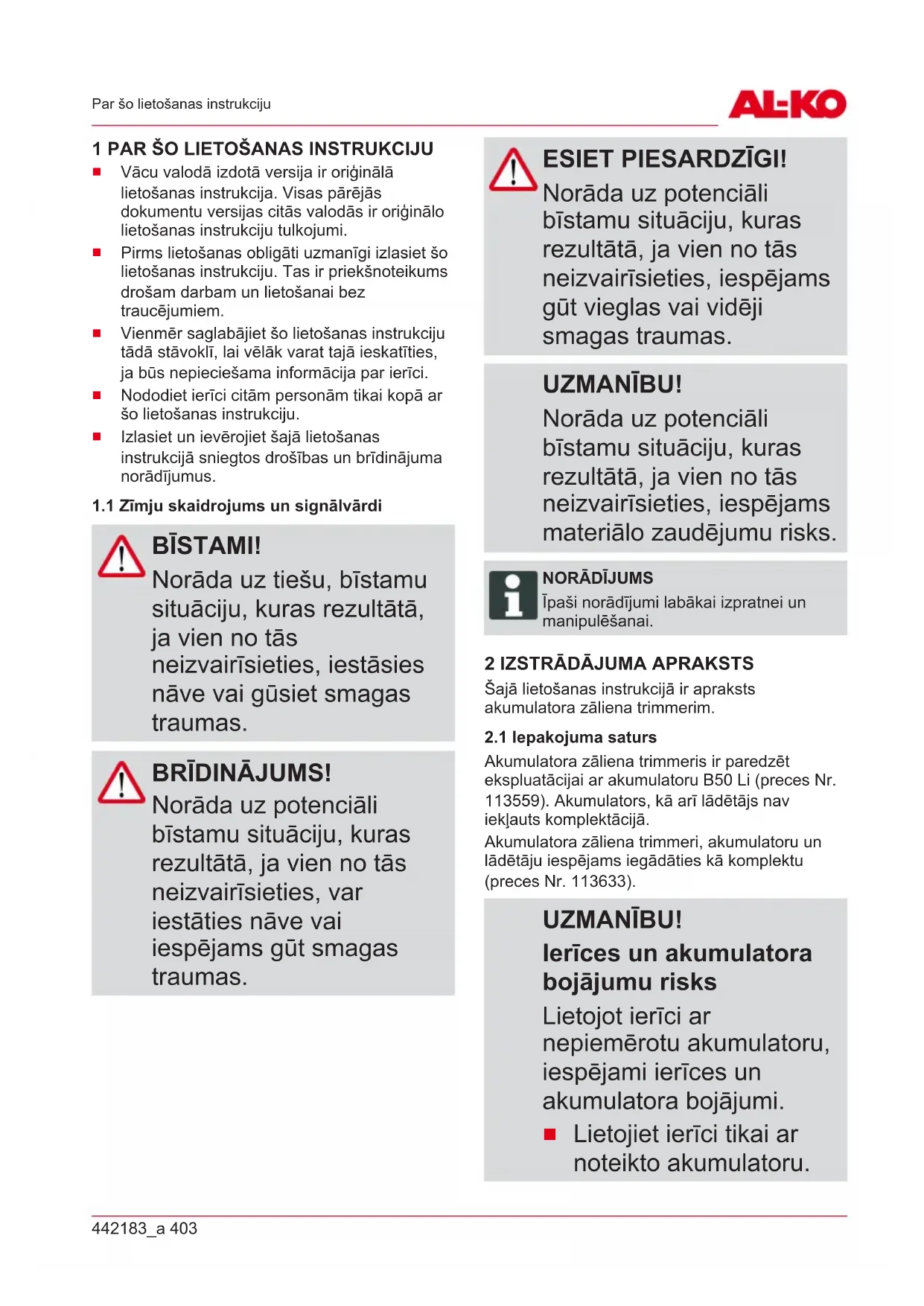 Akumulatora zāliena trimmeris ir paredzēt ekspluatācijai ar akumulatoru B50 Li (preces Nr. 113559). Akumulators, kā arī lādētājs nav iekļauts komplektācijā. Akumulatora zāliena trimmeri, akumulatoru un lādētāju iespējams iegādāties kā komplektu (preces Nr. 113633). UZMANĪBU! Ierīces un akumulatora bojājumu risks Lietojot ierīci ar nepiemērotu akumulatoru, iespējami ierīces un akumulatora bojājumi.