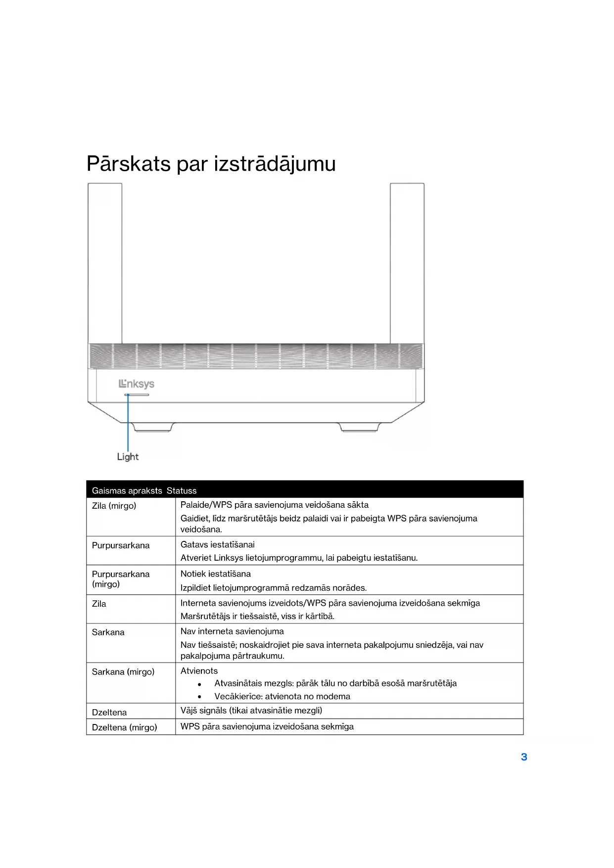 Kad maršrutētājs ir pievienots pie elektrobarošanas un ieslēgts, nospiediet un turiet nospiestu uz aizmugurējā paneļa esošo atiestatīšanas pogu. Lampiņa uz maršrutētāja mirgos sarkanā krāsā. Neatlaidiet pogu, līdz lampiņa nodziest un pēc tam maina krāsu uz spilgti sarkanu. Kā piestiprināt maršrutētāju pie sienas MR2000 sērijas maršrutētājam apakšā ir atveres stiprināšanai pie sienas. Pakariet maršrutētāju, izmantojot M3 x 20 mm skrūves.32 Specifikācijas Linksys Hydra 6 Modeļa nosaukums AX3000 divu frekvenču joslu WiFi 6 maršrutētājs Modeļa numurs MR2000, MR20EC, MR20MS, MR20WH Pieslēgumu pieslēgvietas ātrums 10/100/1000 Mbps (gigabita Ethernet) Radio frekvence 2,4 un 5 GHz Antenu skaits 2 ārējas regulējamas antenas (neatdalāmas), 1 iekšēja iespiedantena Pieslēgvietas USB 3.0, Ethernet (1-4), Internets, Barošana Pogas Barošana, atiestatīšana, WPS Lampiņas Priekšējais panelis: viena daudzkrāsaina lampiņa, kas norāda barošanu un statusu Aizmugurējais panelis: USB, Ethernet (1–4), internets Drošības funkcijas WPA2-Personal, WPA3-Personal, WPA2/WPA3-Personal Mixed Drošības atslēgas biti Līdz 128 bitu šifrs Uzglabāšanas datņu sistēmas atbalsts FAT 32, NTFS, HFS+, Samba Vide Izmēri 215 mm x 155 mm x 56 mm (8,46” x 6,10” x 2,20”) Ierīces svars 687 g (1,51 mārc.) Barošana 12 V/1,5 A Sertifikāti FCC, IC, CE, Wi-Fi (IEEE 802.11a/b/g/n/ac/ax) Darba vides temperatūra 32–104° F (0–40° C) Glabāšanas vides temperatūra -4–140° F (-20–60° C) Darba vides mitrums 10–80% relatīvā mitruma, bez kondensācijas Uzglabāšanas vides mitrums 5–90% bez kondensācijas Piezīmes Reglamentējošo, garantijas un drošuma informāciju skatiet vietnē Linksys.com/support/MR2000. Specifikācijas var tikt mainītas bez iepriekšēja brīdinājuma. Maksimālie darbības lielumu pamats ir IEEE Standarta 802.11 specifikācijas. Faktiskie darbības lielumi var mainīties, tostarp iespējama mazāka bezvadu tīkla kapacitāte, datu pārraides ātrums, amplitūda un pārklājums. Darbība ir atkarīga no daudziem faktoriem, apstākļiem un mainīgajiem lielumiem, kas aptver attālumu no piekļuves vietas, tīkla noslogotību, celtniecības materiālus un konstrukcijas, lietoto operētājsistēmu, izmantoto bezvadu ierīču kopumu, traucējumus un citus nelabvēlīgus faktorus. Lai saņemtu visaugstākā līmeņa tehnisko atbalstu, dodieties uz vietni Linksys.com/support/MR2000.33 LINKSYS, Intelligent Mesh un daudzi produktu nosaukumi un logotipi ir Linksys Holdings, Inc. un/vai tā filiāļu prečzīmes. Minētās trešo personu prečzīmes ir to atbilstīgo īpašnieku īpašums. © 2022 Linksys Holdings, Inc. un/vai tā filiāles. Visas tiesības saglabātas. LNKPG-00898 Rev A001
