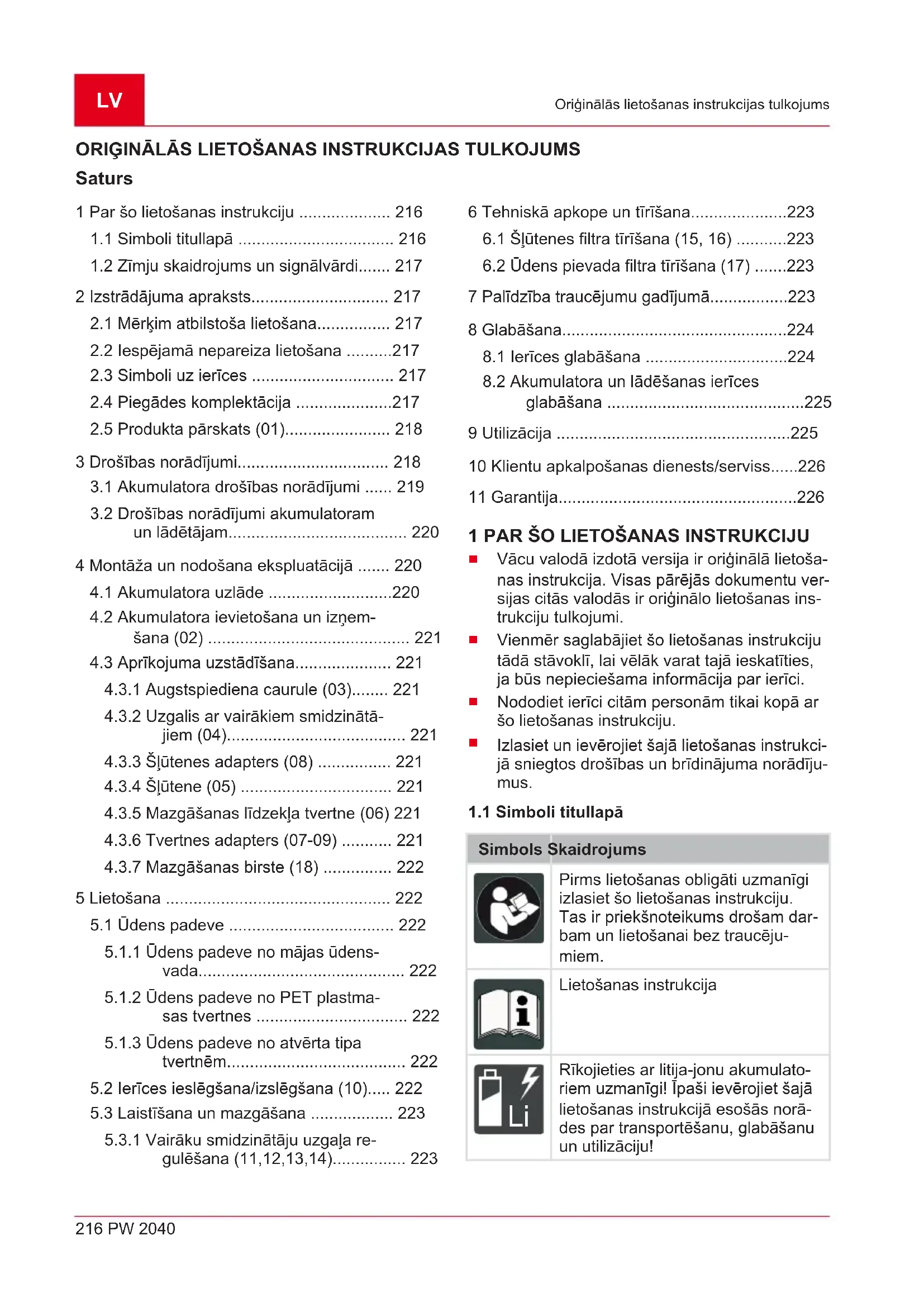 ražotāja atpakaļpieņemšanas vietās (ja tas nav vienotās atpakaļpieņemšanas sistēmas dalībnieks).LV 226 PW 2040 Klientu apkalpošanas dienests/serviss Šie izteikumi attiecas tikai uz tiem akumulatoriem un baterijām, kas tiek uzstādītas un pārdotas Ei- ropas Savienības dalībvalstīs un uz kurām attie- cināmas Eiropas Direktīvas 2006/66/EK prasī- bas. Valstīs, kas atrodas ārpus Eiropas Savienī- bas, var būt atšķirīgi noteikumi attiecībā uz nolie- toto akumulatoru un bateriju utilizāciju.
