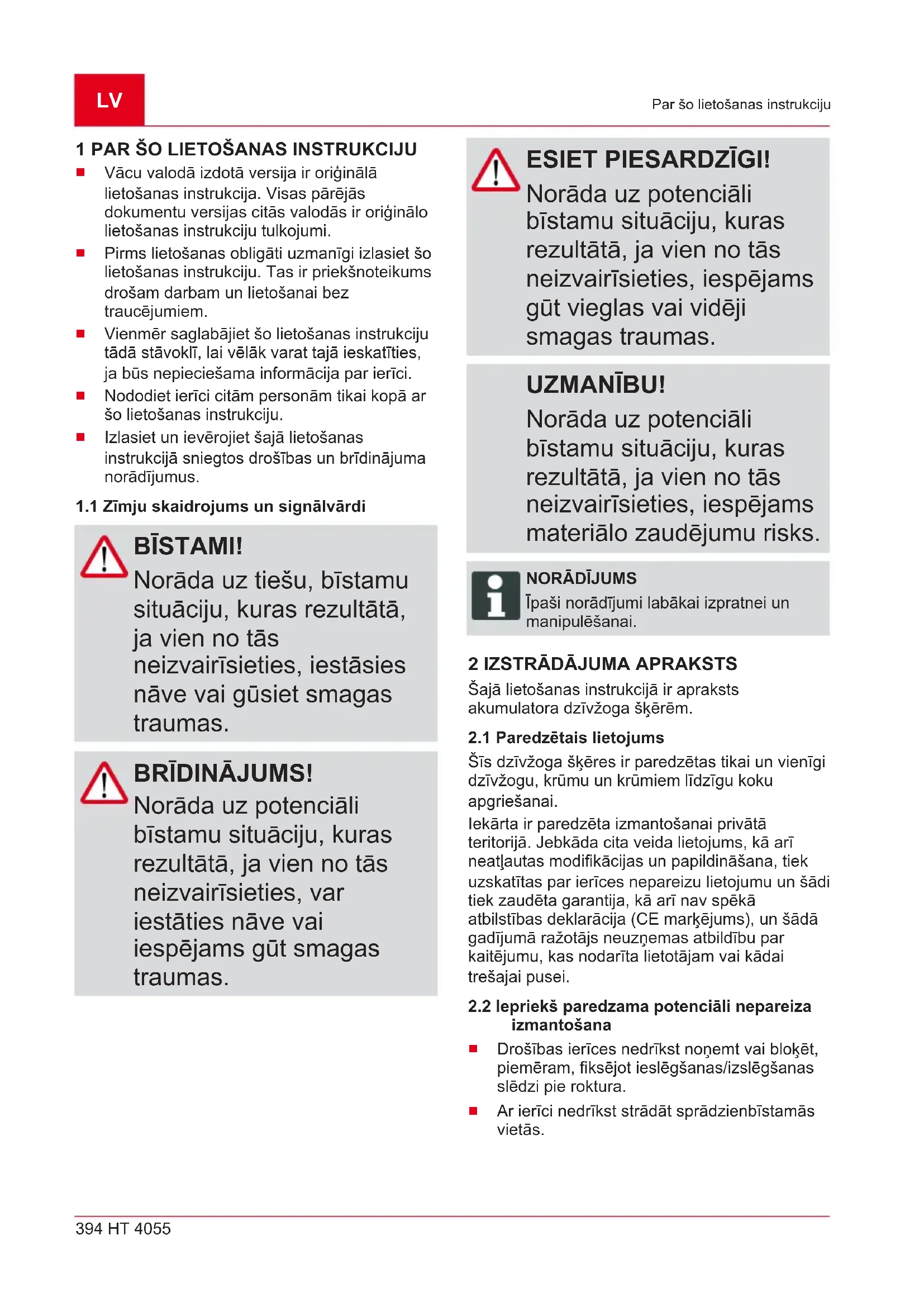 Dzīvžoga šķēres var darbināt tikai ar divām rokām vienlaicīgi.LV 396 HT 4055 Izstrādājuma apraksts