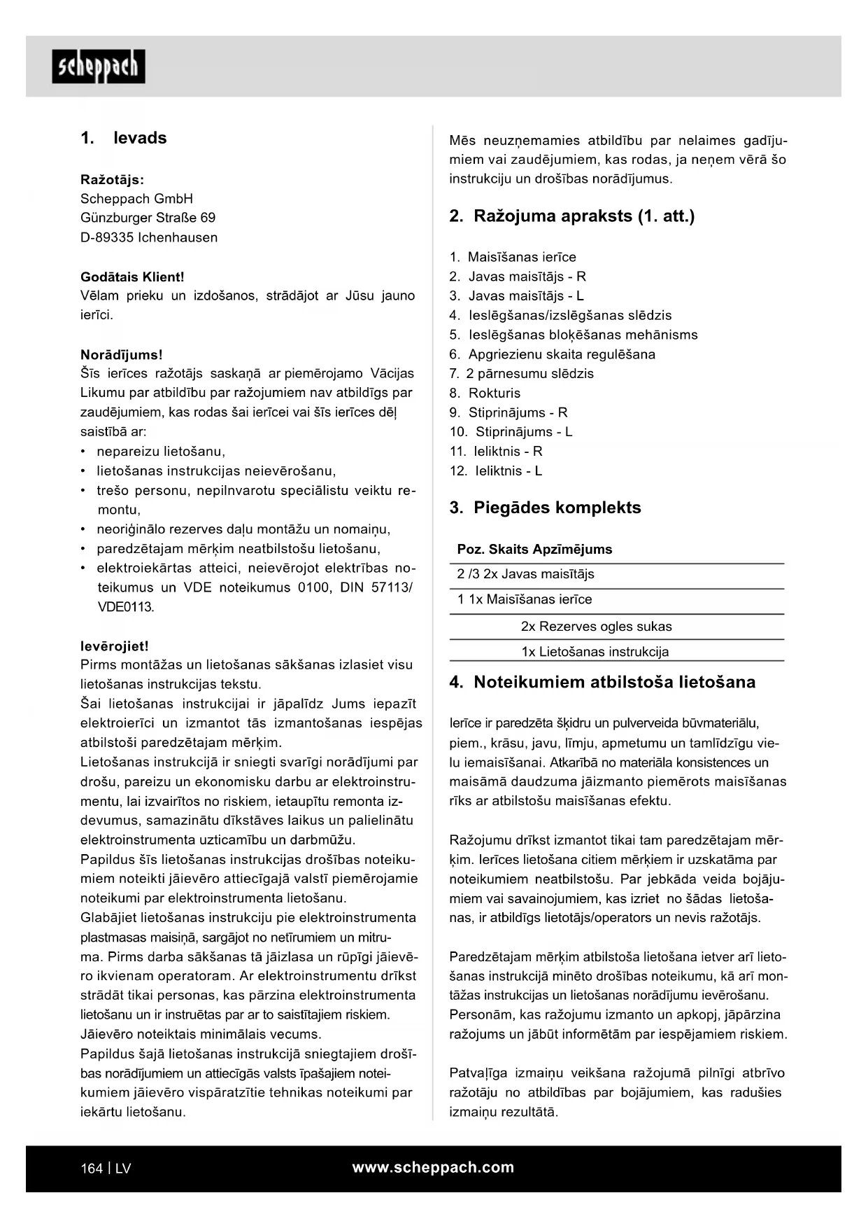 - elektroiekārtas atteici, neievērojot elektrības no- teikumus un VDE noteikumus 0100, DIN 57113/ VDE0113. Ievērojiet! Pirms montāžas un lietošanas sākšanas izlasiet visu lietošanas instrukcijas tekstu. Šai lietošanas instrukcijai ir jāpalīdz Jums iepazīt elektroierīci un izmantot tās izmantošanas iespējas atbilstoši paredzētajam mērķim. Lietošanas instrukcijā ir sniegti svarīgi norādījumi par drošu, pareizu un ekonomisku darbu ar elektroinstru- mentu, lai izvairītos no riskiem, ietaupītu remonta iz- devumus, samazinātu dīkstāves laikus un palielinātu elektroinstrumenta uzticamību un darbmūžu. Papildus šīs lietošanas instrukcijas drošības noteiku- miem noteikti jāievēro attiecīgajā valstī piemērojamie noteikumi par elektroinstrumenta lietošanu. Glabājiet lietošanas instrukciju pie elektroinstrumenta plastmasas maisiņā, sargājot no netīrumiem un mitru- ma. Pirms darba sākšanas tā jāizlasa un rūpīgi jāievē- ro ikvienam operatoram. Ar elektroinstrumentu drīkst strādāt tikai personas, kas pārzina elektroinstrumenta lietošanu un ir instruētas par ar to saistītajiem riskiem. Jāievēro noteiktais minimālais vecums. Papildus šajā lietošanas instrukcijā sniegtajiem drošī- bas norādījumiem un attiecīgās valsts īpašajiem notei- kumiem jāievēro vispāratzītie tehnikas noteikumi par iekārtu lietošanu.www.scheppach.com