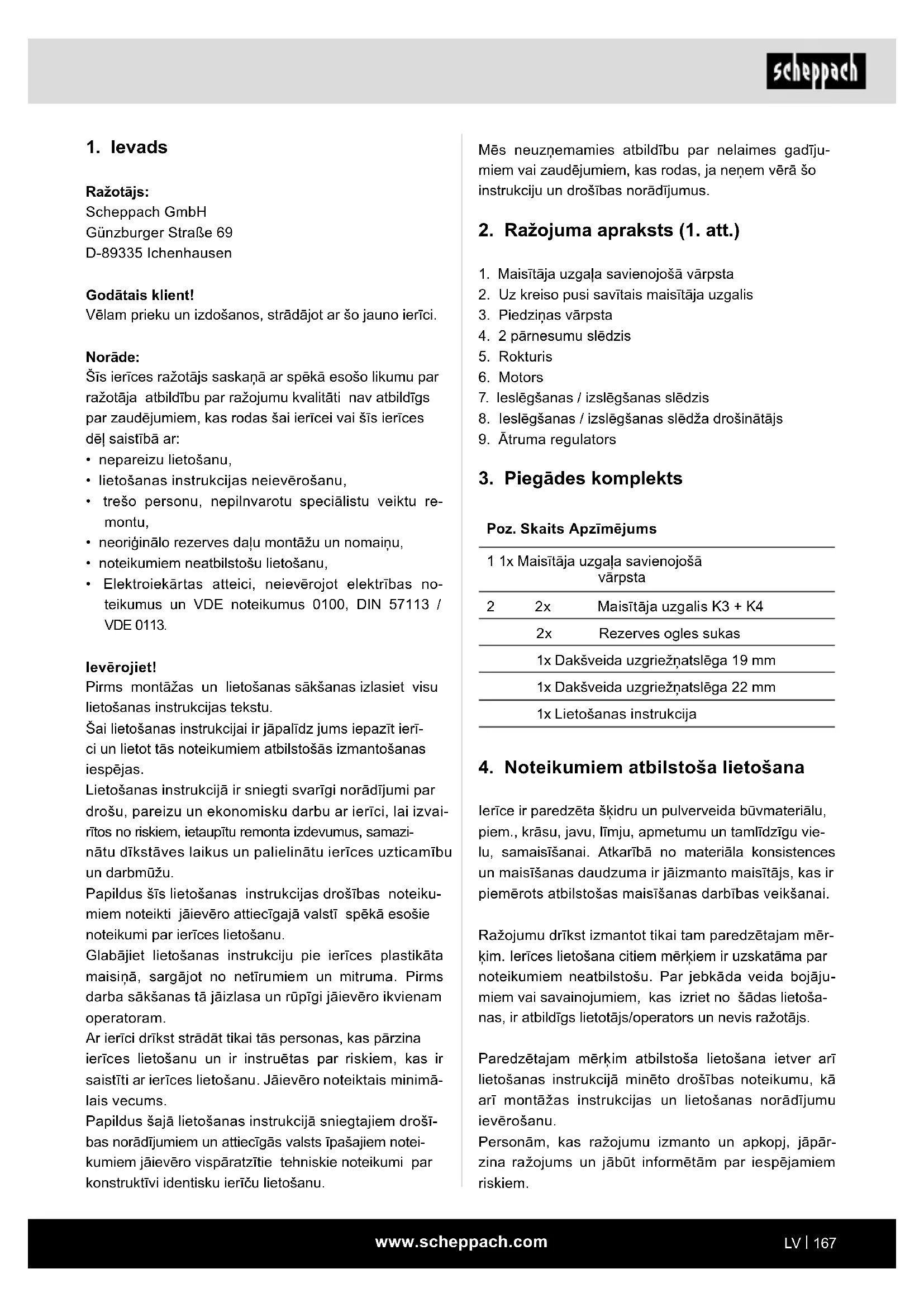 Ražotājs: Scheppach GmbH Günzburger Straße 69 D-89335 Ichenhausen Godātais klient! Vēlam prieku un izdošanos, strādājot ar šo jauno ierīci. Norāde: Šīs ierīces ražotājs saskaņā ar spēkā esošo likumu par ražotāja atbildību par ražojumu kvalitāti nav atbildīgs par zaudējumiem, kas rodas šai ierīcei vai šīs ierīces dēļ saistībā ar: