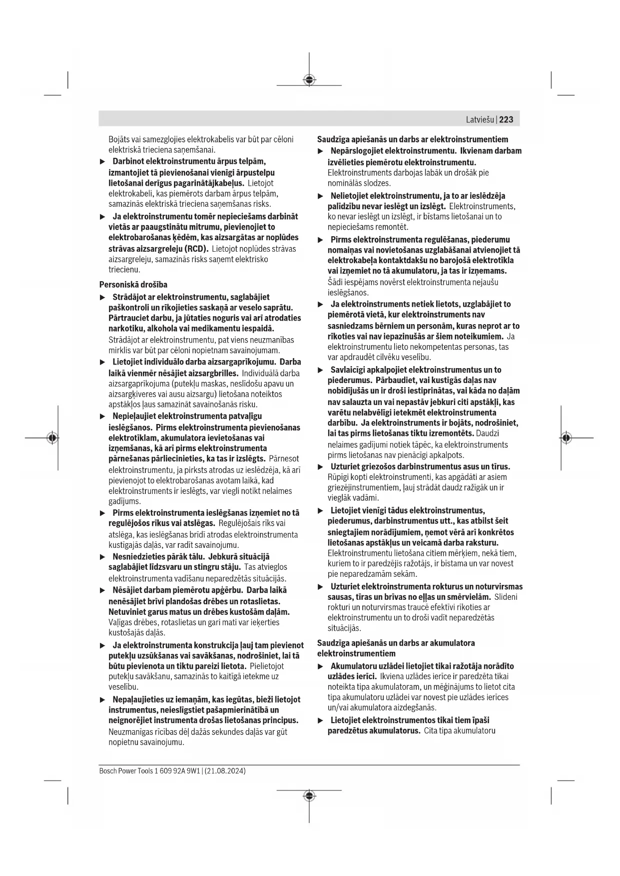 Bosch Power Tools 1 609 92A 9W1 | (21.08.2024)226 | Latviešu Šajā pamācībā norādītais vibrācijas līmenis un instrumenta radītā trokšņa vērtība ir izmērīta atbilstoši standartā noteiktajai procedūrai un var tikt izmantota elektroinstrumentu savstarpējai salīdzināšanai. To var izmantot arī vibrācijas un trokšņa radītās papildu slodzes iepriekšējai novērtēšanai. Šeit norādītais svārstību līmenis un instrumenta radītā trokšņa vērtība ir attiecināma uz elektroinstrumenta galvenajiem pielietojuma veidiem. Ja elektroinstruments tiek lietots netipiskiem mērķiem, kopā ar netipiskiem darbinstrumentiem vai nav vajadzīgajā veidā apkalpots, tā svārstību līmenis un radītā trokšņa vērtība var atšķirties no šeit norādītajām vērtībām. Tas var ievērojami palielināt svārstību un trokšņa radīto papildu slodzi kopējam darba laika posmam. Lai precīzi izvērtētu svārstību un trokšņa radīto papildu slodzi zināmam darba laika posmam, jāņem vērā arī laiks, kad elektroinstruments ir izslēgts vai arī darbojas, taču faktiski netiek izmantots paredzētā darba veikšanai. Tas var ievērojami samazināt svārstību un trokšņa radīto papildu slodzi kopējam darba laika posmam. Veiciet papildu pasākumus, lai pasargātu strādājošo personu no vibrācijas kaitīgās iedarbības, piemēram, savlaicīgi veiciet elektroinstrumenta un darbinstrumentu apkalpošanu, uzturiet rokas siltas un pareizi plānojiet darbu. Akumulators Bosch pārdod akumulatora elektriskos darbinstrumentus arī bez akumulatora. Tas, vai Jūsu elektriskā darbinstrumenta piegādes komplektācijā ir iekļauts akumulators, ir norādīts uz iesaiņojuma. Akumulatora uzlāde u Izmantojiet vienīgi tehniskajos datos norādītās uzlādes ierīces. Vienīgi šī uzlādes ierīce ir piemērota jūsu elektroinstrumentā izmantojamā litija-jonu akumulatora uzlādei. Norāde: atbilstoši starptautiskajiem kravu pārvadāšanas noteikumiem litija jonu akumulatori tiek piegādāti daļēji uzlādētā stāvoklī. Lai nodrošinātu pilnu akumulatora jaudu, pirms pirmās lietošanas reizes pilnībā uzlādējiet akumulatoru. Akumulatora ielikšana Ievietojiet uzlādēto akumulatoru akumulatora stiprinājumā, līdz tas tiek nofiksēts. Akumulatora izņemšana Lai izņemtu akumulatoru, nospiediet akumulatora atbrīvošanas taustiņu un izvelciet akumulatoru. Nedarbojieties ar spēku. Akumulatoram 2 ir divpakāpju fiksators, kas neļauj tam izkrist, kad nejauši nospiež akumulatora atbrīvošanas pogu. Kamēr akumulators ir ielikts elektroinstrumentā, to notur atspere. Akumulatora uzlādes pakāpes indikators Piezīme: ne visiem akumulatoru tipiem ir uzlādes līmeņa indikators. Akumulatora uzlādes pakāpes indikatora zaļās LEDs diodes parāda akumulatora uzlādes pakāpi. Vadoties no drošības apsvērumiem, uzlādes pakāpe ir nolasāma tikai tad, ja elektroinstruments atrodas miera stāvoklī. Lai nolasītu akumulatora uzlādes pakāpi, nospiediet akumulatora uzlādes pakāpes nolasīšanas taustiņu vai . Tas iespējams arī tad, ja akumulators ir izņemts no elektroinstrumenta. Ja pēc akumulatora uzlādes pakāpes nolasīšanas taustiņa nospiešanas neiedegas neviena no uzlādes pakāpes indikatora LED diodēm, tas nozīmē, ka akumulators ir bojāts un to nepieciešams nomainīt. Akumulatora tips GBA 18V... LED Uzlādes līmenis Pastāvīgi deg 3zaļas LED diodes 60–100% Pastāvīgi deg 2zaļas LED diodes 30–60% Pastāvīgi deg 1zaļa LED diode 5–30% Mirgo 1zaļa LED diode 0–5% Akumulatora tips ProCORE18V... LED Uzlādes līmenis Pastāvīgi deg 5zaļas LED diodes 80–100% Pastāvīgi deg 4zaļas LED diodes 60–80% Pastāvīgi deg 3zaļas LED diodes 40–60% Pastāvīgi deg 2zaļas LED diodes 20–40% Pastāvīgi deg 1zaļa LED diode 5–20% Mirgo 1zaļa LED diode 0–5% Pareiza apiešanās ar akumulatoru Sargājiet akumulatoru no mitruma un ūdens. Uzglabājiet akumulatoru pie temperatūras no −20°C līdz 50°C. Neatstājiet akumulatoru karstumā, piemēram, vasaras laikā neatstājiet to automašīnā. Laiku pa laikam iztīriet akumulatora ventilācijas atvērumus ar mīkstu, tīru un sausu otu. Ja manāmi samazinās instrumenta darbības laiks starp akumulatora uzlādēm, tas norāda, ka akumulators ir nolietojies un to nepieciešams nomainīt. Ievērojiet norādījumus par atbrīvošanos no nolietotajiem izstrādājumiem. 1 609 92A 9W1 | (21.08.2024) Bosch Power ToolsLatviešu | 227 Montāža u Pirms jebkādu darbu veikšanas pie elektroinstrumenta (piem. apkope, instrumentu maiņa utt.) izņemiet akumulatoru no elektroinstrumenta. Ja nejauši nospiež ieslēdzēju/ izslēdzēju, pastāv savainojumu risks. Papildrokturis u Lietojiet elektroinstrumentu tikai tad, ja uz tā ir nostiprināts papildrokturis (15). u Pārliecinieties, ka papildu rokturis vienmēr ir stingri pievilkts. Pretējā gadījumā darba laikā jūs varat zaudēt kontroli pār savu elektroinstrumentu. Papildroktura pagriešana (skat. attēlu A) Lai varētu strādāt droši un bez noguruma, papildrokturi (15) var pagriezt un nostiprināt vēlamajā stāvoklī. – Atskrūvējiet papildroktura (15) apakšējo posmu, griežot to pretēji pulksteņa rādītāju kustības virzienam, un tad pagrieziet papildrokturi (15) vēlamajā stāvoklī. Pēc tam no jauna stingri pieskrūvējiet papildroktura (15) apakšējo posmu, griežot to pulksteņa rādītāju kustības virzienā. Sekojiet, lai, papildroktura spīļaploce ievietotos šim nolūkam paredzētajā korpusa gropē. Urbjpatronas un darbinstrumenta izvēle Veicot triecienurbšanu, jālieto SDSplus darbinstrumenti, kas ir piemēroti iestiprināšanai SDSplus urbjpatronā. Urbšanai bez trieciena kokā, metālā, keramikā un plastmasā, kā arī skrūvēšanai jālieto darbinstrumenti bez SDSplus stiprinājuma (piemēram, urbji ar cilindrisku kātu). Šiem instrumentiemm ir nepieciešama zobaploces urbjpatrona. Norāde: 