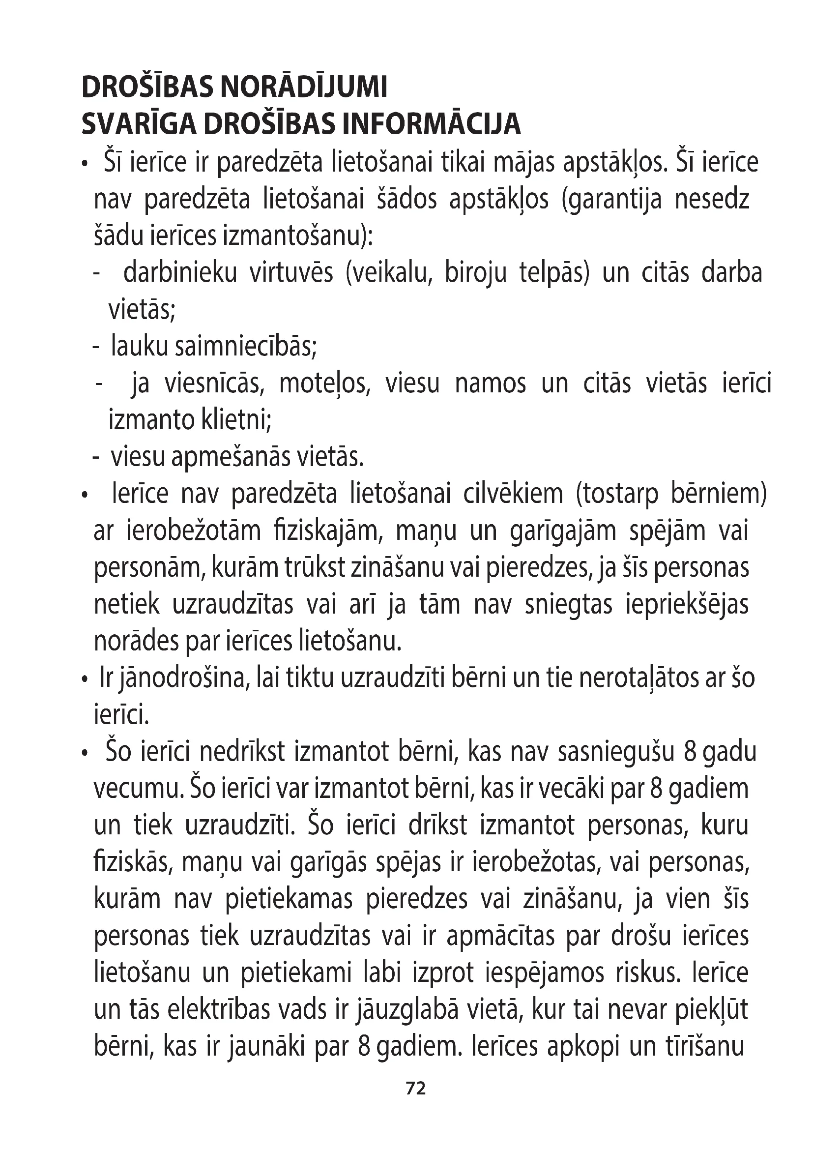So ierici nedrikst izmantot berneni, kas nav sasniegušu 8 gadu vecumu. So ierici var izmantot berneni, kas ir vecaki par 8 gadiem un tiek uzraudziti. So ierici drikst izmantot personas, kuru fiziskas, manu vai garigas spejas ir ierobežotas, vai personas, kuram nav pietiekamas pieredzes vai zinašanu, ja vien šis personas tiek uzraudzitas vai ir apmacitas par drošu ierices lietošanu un pietiekami labi izprot iespejamos riskus. lerice un tās elektribas vads ir jauzglaba vieta, kur tai nevar pieklut berneni, kas ir jaunaki par 8 gadiem. lerices apkopi un tirisanu
