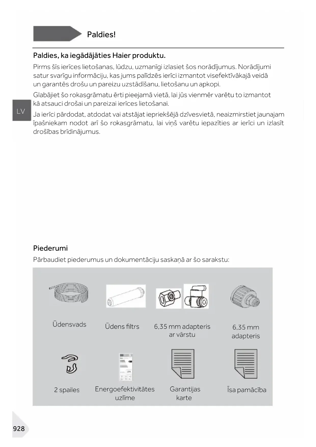 Paldies, ka iegādājāties Haier produktu. Pirms šīs ierīces lietošanas, lūdzu, uzmanīgi izlasiet šos norādījumus. Norādījumi satur svarīgu informāciju, kas jums palīdzēs ierīci izmantot visefektīvākajā veidā un garantēs drošu un pareizu uzstādīšanu, lietošanu un apkopi. Glabājiet šo rokasgrāmatu ērti pieejamā vietā, lai jūs vienmēr varētu to izmantot kā atsauci drošai un pareizai ierīces lietošanai. Ja ierīci pārdodat, atdodat vai atstājat iepriekšējā dzīvesvietā, neaizmirstiet jaunajam īpašniekam nodot arī šo rokasgrāmatu, lai viņš varētu iepazīties ar ierīci un izlasīt drošības brīdinājumus. Piederumi Pārbaudiet piederumus un dokumentāciju saskaņā ar šo sarakstu: Ūdensvads Ūdens ltrs 6,35 mm adapteris ar vārstu 6,35 mm adapteris 2 spailes Energoefektivitātes uzlīme Garantijas karte Īsa pamācībaDrošības informācija
