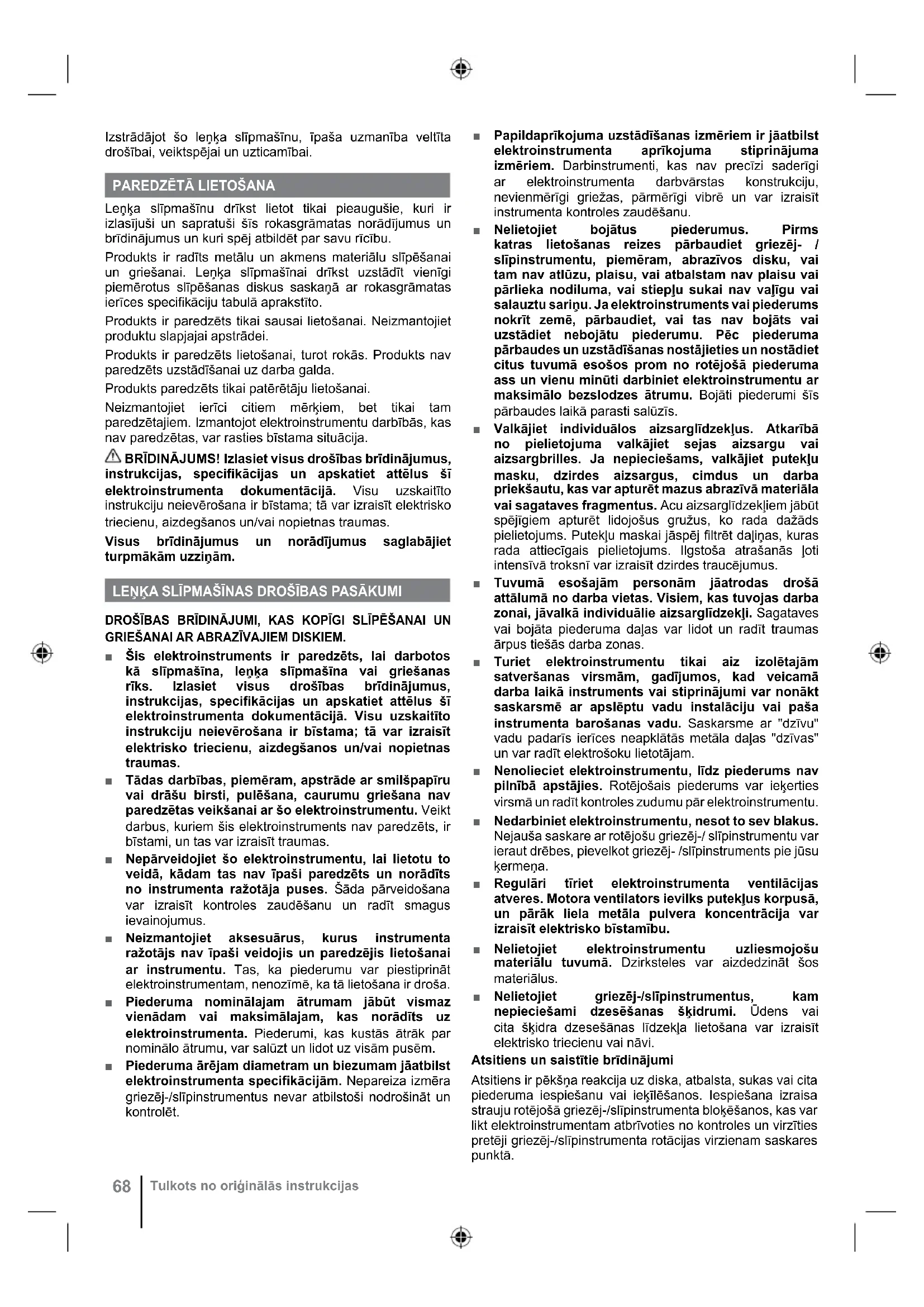 Leņķa slīpmašīnu drīkst lietot tikai pieaugušie, kuri ir izlasījuši un sapratuši šīs rokasgrāmatas norādījumus un brīdinājumus un kuri spēj atbildēt par savu rīcību. Produkts ir radīts metālu un akmens materiālu slīpēšanai un griešanai. Leņķa slīpmašīnai drīkst uzstādīt vienīgi piemērotus slīpēšanas diskus saskaņā ar rokasgrāmatas ierīces specifi kāciju tabulā aprakstīto. Produkts ir paredzēts tikai sausai lietošanai. Neizmantojiet produktu slapjajai apstrādei. Produkts ir paredzēts lietošanai, turot rokās. Produkts nav paredzēts uzstādīšanai uz darba galda. Produkts paredzē ts tikai patērētāju lietošanai. Neizmantojiet ierīci citiem mērķiem, bet tikai tam paredzētajiem. Izmantojot elektroinstrumentu darbībās, kas nav paredzētas, var rasties bīstama situācija. BRĪDINĀJUMS! Izlasiet visus drošības brīdinājumus, instrukcijas, specifikācijas un apskatiet attēlus šī elektroinstrumenta dokumentācijā. Visu uzskaitīto instrukciju neievērošana ir bīstama; tā var izraisīt elektrisko triecienu, aizdegšanos un/vai nopietnas traumas. Visus brīdinājumus un norādījumus saglabājiet turpmākām uzziņām. LEŅĶA SLĪPMAŠĪNAS DROŠĪBAS PASĀKUMI DROŠĪBAS BRĪDINĀJUMI, KAS KOPĪGI SLĪPĒŠANAI UN GRIEŠANAI AR ABRAZĪVAJIEM DISKIEM. ■ Šis elektroinstruments ir paredzēts, lai darbotos kā slīpmašīna, leņķa slīpmašīna vai griešanas rīks. Izlasiet visus drošības brīdinājumus, instrukcijas, specifikācijas un apskatiet attēlus šī elektroinstrumenta dokumentācijā. Visu uzskaitīto instrukciju neievērošana ir bīstama; tā var izraisīt elektrisko triecienu, aizdegšanos un/vai nopietnas traumas. ■ Tādas darbības, piemēram, apstrāde ar smilšpapīru vai drāšu birsti, pulēšana, caurumu griešana nav paredzētas veikšanai ar šo elektroinstrumentu. Veikt darbus, kuriem šis elektroinstruments nav paredzēts, ir bīstami, un tas var izraisīt traumas. ■ Nepārveidojiet šo elektroinstrumentu, lai lietotu to veidā, kādam tas nav īpaši paredzēts un norādīts no instrumenta ražotāja puses. Šāda pārveidošana var izraisīt kontroles zaudēšanu un radīt smagus ievainojumus. ■ Neizmantojiet aksesuārus, kurus instrumenta ražotājs nav īpaši veidojis un paredzējis lietošanai ar instrumentu. Tas, ka piederumu var piestiprināt elektroinstrumentam, nenozīmē, ka tā lietošana ir droša. ■ Piederuma nominālajam ātrumam jābūt vismaz vienādam vai maksimālajam, kas norādīts uz elektroinstrumenta. Piederumi, kas kustās ātrāk par nominālo ātrumu, var salūzt un lidot uz visām pusēm. ■ Piederuma ārējam diametram un biezumam jāatbilst elektroinstrumenta specifikācijām. Nepareiza izmēra griezēj-/slīpinstrumentus nevar atbilstoši nodrošināt un kontrolēt. ■ Papildaprīkojuma uzstādīšanas izmēriem ir jāatbilst elektroinstrumenta aprīkojuma stiprinājuma izmēriem. Darbinstrumenti, kas nav precīzi saderīgi ar elektroinstrumenta darbvārstas konstrukciju, nevienmērīgi griežas, pārmērīgi vibrē un var izraisīt instrumenta kontroles zaudēšanu. ■ Nelietojiet bojātus piederumus. Pirms katras lietošanas reizes pārbaudiet griezēj- / slīpinstrumentu, piemēram, abrazīvos disku, vai tam nav atlūzu, plaisu, vai atbalstam nav plaisu vai pārlieka nodiluma, vai stiepļu sukai nav vaļīgu vai salauztu sariņu. Ja elektroinstruments vai piederums nokrīt zemē, pārbaudiet, vai tas nav bojāts vai uzstādiet nebojātu piederumu. Pēc piederuma pārbaudes un uzstādīšanas nostājieties un nostādiet citus tuvumā esošos prom no rotējošā piederuma ass un vienu minūti darbiniet elektroinstrumentu ar maksimālo bezslodzes ātrumu. Bojāti piederumi šīs pārbaudes laikā parasti salūzīs. ■ Valkājiet individuālos aizsarglīdzekļus. Atkarībā no pielietojuma valkājiet sejas aizsargu vai aizsargbrilles. Ja nepieciešams, valkājiet putekļu masku, dzirdes aizsargus, cimdus un darba priekšautu, kas var apturēt mazus abrazīvā materiāla vai sagataves fragmentus. Acu aizsarglīdzekļiem jābūt spējīgiem apturēt lidojošus gružus, ko rada dažāds pielietojums. Putekļu maskai jāspēj filtrēt daļiņas, kuras rada attiecīgais pielietojums. Ilgstoša atrašanās ļoti intensīvā troksnī var izraisīt dzirdes traucējumus. ■ Tuvumā esošajām personām jāatrodas drošā attālumā no darba vietas. Visiem, kas tuvojas darba zonai, jāvalkā individuālie aizsarglīdzekļi. Sagataves vai bojāta piederuma daļas var lidot un radīt traumas ārpus tiešās darba zonas. ■ Turiet elektroinstrumentu tikai aiz izolētajām satveršanas virsmām, gadījumos, kad veicamā darba laikā instruments vai stiprinājumi var nonākt saskarsmē ar apslēptu vadu instalāciju vai paša instrumenta barošanas vadu. Saskarsme ar "dzīvu" vadu padarīs ierīces neapklātās metāla daļas "dzīvas" un var radīt elektrošoku lietotājam. ■ Nenolieciet elektroinstrumentu, līdz piederums nav pilnībā apstājies. Rotējošais piederums var ieķerties virsmā un radīt kontroles zudumu pār elektroinstrumentu. ■ Nedarbiniet elektroinstrumentu, nesot to sev blakus. Nejauša saskare ar rotējošu griezēj-/ slīpinstrumentu var ieraut drēbes, pievelkot griezēj- /slīpinstruments pie jūsu ķermeņa. ■ Regulāri tīriet elektroinstrumenta ventilācijas atveres. Motora ventilators ievilks putekļus korpusā, un pārāk liela metāla pulvera koncentrācija var izraisīt elektrisko bīstamību. ■ Nelietojiet elektroinstrumentu uzliesmojošu materiālu tuvumā. Dzirksteles var aizdedzināt šos materiālus. ■ Nelietojiet griezēj-/slīpinstrumentus, kam nepieciešami dzesēšanas šķidrumi. Ūdens vai cita šķidra dzesešānas līdzekļa lietošana var izraisīt elektrisko triecienu vai nāvi. Atsitiens un saistītie brīdinājumi Atsitiens ir pēkšņa reakcija uz diska, atbalsta, sukas vai cita piederuma iespiešanu vai