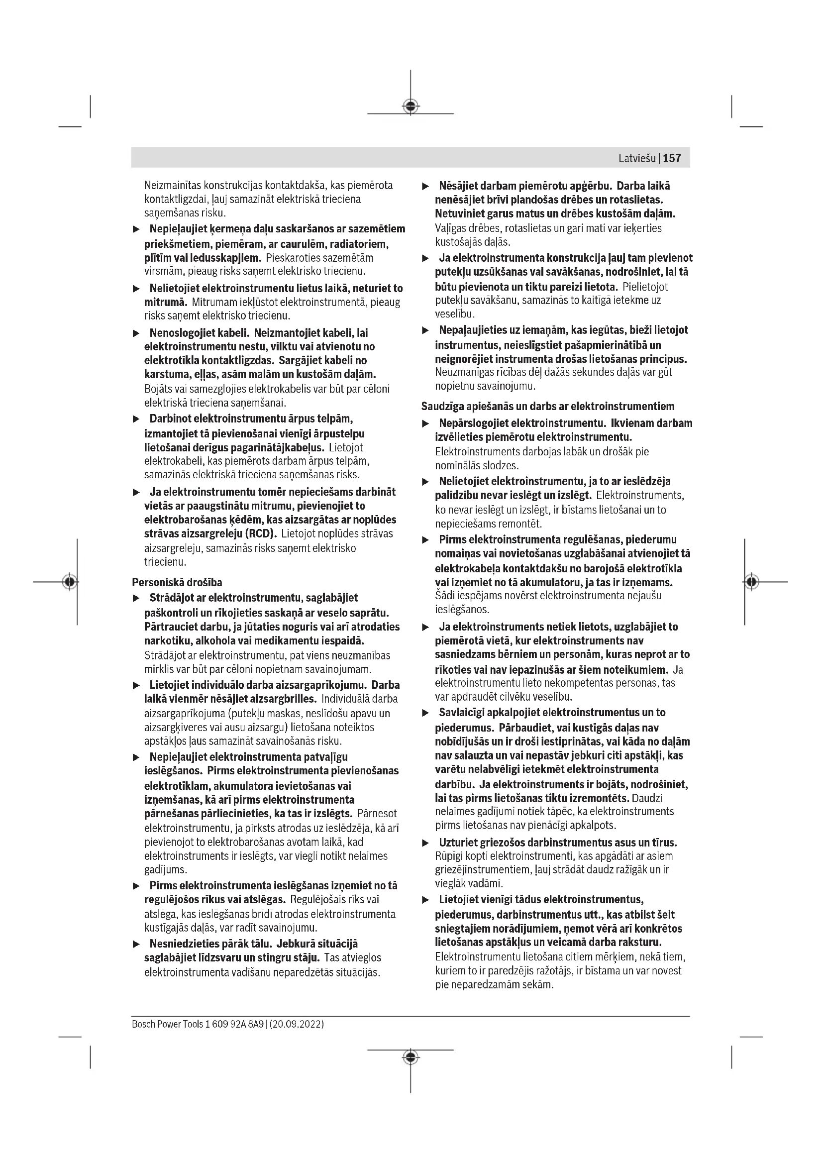 Šajā pamācībā norādītais vibrācijas līmenis un instrumenta radītā trokšņa vērtība ir izmērīta atbilstoši standartā noteiktajai procedūrai un var tikt izmantota elektroinstrumentu savstarpējai salīdzināšanai. To var izmantot arī vibrācijas un trokšņa radītās papildu slodzes iepriekšējai novērtēšanai. Šeit norādītais svārstību līmenis un instrumenta radītā trokšņa vērtība ir attiecināma uz elektroinstrumenta galvenajiem pielietojuma veidiem. Ja elektroinstruments tiek lietots netipiskiem mērķiem, kopā ar netipiskiem darbinstrumentiem vai nav vajadzīgajā veidā apkalpots, tā svārstību līmenis un radītā trokšņa vērtība var atšķirties no šeit norādītajām vērtībām. Tas var ievērojami palielināt svārstību un trokšņa radīto papildu slodzi kopējam darba laika posmam. Lai precīzi izvērtētu svārstību un trokšņa radīto papildu slodzi zināmam darba laika posmam, jāņem vērā arī laiks, kad elektroinstruments ir izslēgts vai arī darbojas, taču faktiski netiek izmantots paredzētā darba veikšanai. Tas var ievērojami samazināt svārstību un trokšņa radīto papildu slodzi kopējam darba laika posmam. Veiciet papildu pasākumus, lai pasargātu strādājošo personu no vibrācijas kaitīgās iedarbības, piemēram, savlaicīgi veiciet elektroinstrumenta un darbinstrumentu apkalpošanu, uzturiet rokas siltas un pareizi plānojiet darbu. Akumulators Bosch pārdod akumulatora elektriskos darbinstrumentus arī bez akumulatora. Tas, vai Jūsu elektriskā darbinstrumenta piegādes komplektācijā ir iekļauts akumulators, ir norādīts uz iesaiņojuma. Akumulatora uzlāde u Izmantojiet vienīgi tehniskajos datos norādītās uzlādes ierīces. Vienīgi šī uzlādes ierīce ir piemērota jūsu elektroinstrumentā izmantojamā litija-jonu akumulatora uzlādei. Norāde: atbilstoši starptautiskajiem kravu pārvadāšanas noteikumiem litija jonu akumulatori tiek piegādāti daļēji uzlādētā stāvoklī. Lai nodrošinātu pilnu akumulatora jaudu, pirms pirmās lietošanas reizes pilnībā uzlādējiet akumulatoru. Akumulatora ielikšana Ievietojiet uzlādēto akumulatoru akumulatora stiprinājumā, līdz tas tiek nofiksēts. Akumulatora izņemšana Lai izņemtu akumulatoru, nospiediet akumulatora atbrīvošanas taustiņu un izvelciet akumulatoru. Nedarbojieties ar spēku. Akumulatoram 2 ir divpakāpju fiksators, kas neļauj tam izkrist, kad nejauši nospiež akumulatora atbrīvošanas pogu. Kamēr akumulators ir ielikts elektroinstrumentā, to notur atspere. Akumulatora uzlādes pakāpes indikators Akumulatora uzlādes pakāpes indikatora zaļās LEDs diodes parāda akumulatora uzlādes pakāpi. Vadoties no drošības apsvērumiem, uzlādes pakāpe ir nolasāma tikai tad, ja elektroinstruments atrodas miera stāvoklī. Bosch Power Tools 1 609 92A 8A9 | (20.09.2022)160 | Latviešu Lai nolasītu akumulatora uzlādes pakāpi, nospiediet akumulatora uzlādes pakāpes nolasīšanas taustiņu vai . Tas iespējams arī tad, ja akumulators ir izņemts no elektroinstrumenta. Ja pēc akumulatora uzlādes pakāpes nolasīšanas taustiņa nospiešanas neiedegas neviena no uzlādes pakāpes indikatora LED diodēm, tas nozīmē, ka akumulators ir bojāts un to nepieciešams nomainīt. Akumulatora tips GBA 18V... LED Uzlādes līmenis Pastāvīgi deg 3zaļas LED diodes 60–100% Pastāvīgi deg 2zaļas LED diodes 30–60% Pastāvīgi deg 1zaļa LED diode 5–30% Mirgo 1zaļa LED diode 0–5% Akumulatora tips ProCORE18V... LED Uzlādes līmenis Pastāvīgi deg 5zaļas LED diodes 80–100% Pastāvīgi deg 4zaļas LED diodes 60–80% Pastāvīgi deg 3zaļas LED diodes 40–60% Pastāvīgi deg 2zaļas LED diodes 20–40% Pastāvīgi deg 1zaļa LED diode 5–20% Mirgo 1zaļa LED diode 0–5% Pareiza apiešanās ar akumulatoru Sargājiet akumulatoru no mitruma un ūdens. Uzglabājiet akumulatoru pie temperatūras no −20°C līdz 50°C. Neatstājiet akumulatoru karstumā, piemēram, vasaras laikā neatstājiet to automašīnā. Laiku pa laikam iztīriet akumulatora ventilācijas atvērumus ar mīkstu, tīru un sausu otu. Ja manāmi samazinās instrumenta darbības laiks starp akumulatora uzlādēm, tas norāda, ka akumulators ir nolietojies un to nepieciešams nomainīt. Ievērojiet norādījumus par atbrīvošanos no nolietotajiem izstrādājumiem. Lietošana Uzsākot lietošanu Ieslēgšana un izslēgšana Lai ieslēgtu elektroinstrumentu, pabīdiet ieslēdzēju(3) uz priekšu, līdz blakus tam kļūst redzams apzīmējums I. Lai izslēgtu elektroinstrumentu, pabīdiet ieslēdzēju(3) uz aizmuguri, līdz blakus tam kļūst redzams apzīmējums 0. Aizsardzība pret atkārtotu ieslēgšanos Aizsardzība pret atkārtotu ieslēgšanos novērš elektroinstrumenta nekontrolētu ieslēgšanos, atjaunojoties sprieguma padevei pēc elektrobarošanas pārtraukuma. Lai atsāktu darbu, pārvietojiet ieslēdzēju(3) stāvoklī "Izslēgts" un tad no jauna ieslēdziet elektroinstrumentu. Pakāpeniska palaišana Instrumenta ieskrējiena laikā tā griezes moments tiek elektroniski ierobežots, šādi palielinot dzinēja kalpošanas laiku. Griešanas virziena maiņa Griešanas virzienu var mainīt, pagriežot matricas turētāju(7) vienā no trim iespējamajiem stāvokļiem, kuru leņķis atšķiras ik par 90°. Griešana atpakaļvirzienā (virzienā uz instrumenta korpusa aizmuguri) nav iespējama. Lai pagrieztu matricas turētāju(7), atskrūvējiet skrūvi(4) tik daudz, lai varētu pagriezt matricas turētāju. Pagrieziet to par 90° pa labi vai pa kreisi attiecībā pret elektroinstrumenta garenisko asi. Sekojiet, lai skrūve(4) pareizi ievietotos matricas turētāja (7) urbumā. Tad stingri pieskrūvējiet skrūvi. Norādījumi darbam u Veicot jebkurus darbus ar elektroinstrumentu (piemēram, apkalpošanu, darbinstrumentu nomaiņu utt.), kā arī pirms tā transportēšanas vai uzglabāšanas vienmēr izņemiet no elektroinstrumenta akumulato