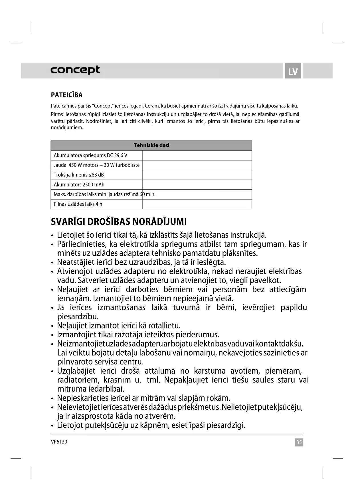 VP6130 PATEICĪBA Pateicamies par šīs “Concept” ierīces iegādi. Ceram, ka būsiet apmierināti ar šo izstrādājumu visu tā kalpošanas laiku. Pirms lietošanas rūpīgi izlasiet šo lietošanas instrukciju un uzglabājiet to drošā vietā, lai nepieciešamības gadījumā varētu pārlasīt. Nodrošiniet, lai arī citi cilvēki, kuri izmantos šo ierīci, pirms tās lietošanas būtu iepazinušies ar norādījumiem. Tehniskie dati Akumulatora spriegums DC29,6V Jauda 450 W motors + 30 W turbobirste Trokšņa līmenis ≤83dB Akumulators 2500mAh Maks. darbības laiks min. jaudas režīmā 60min. Pilnas uzlādes laiks 4h SVARĪGI DROŠĪBAS NORĀDĪJUMI
