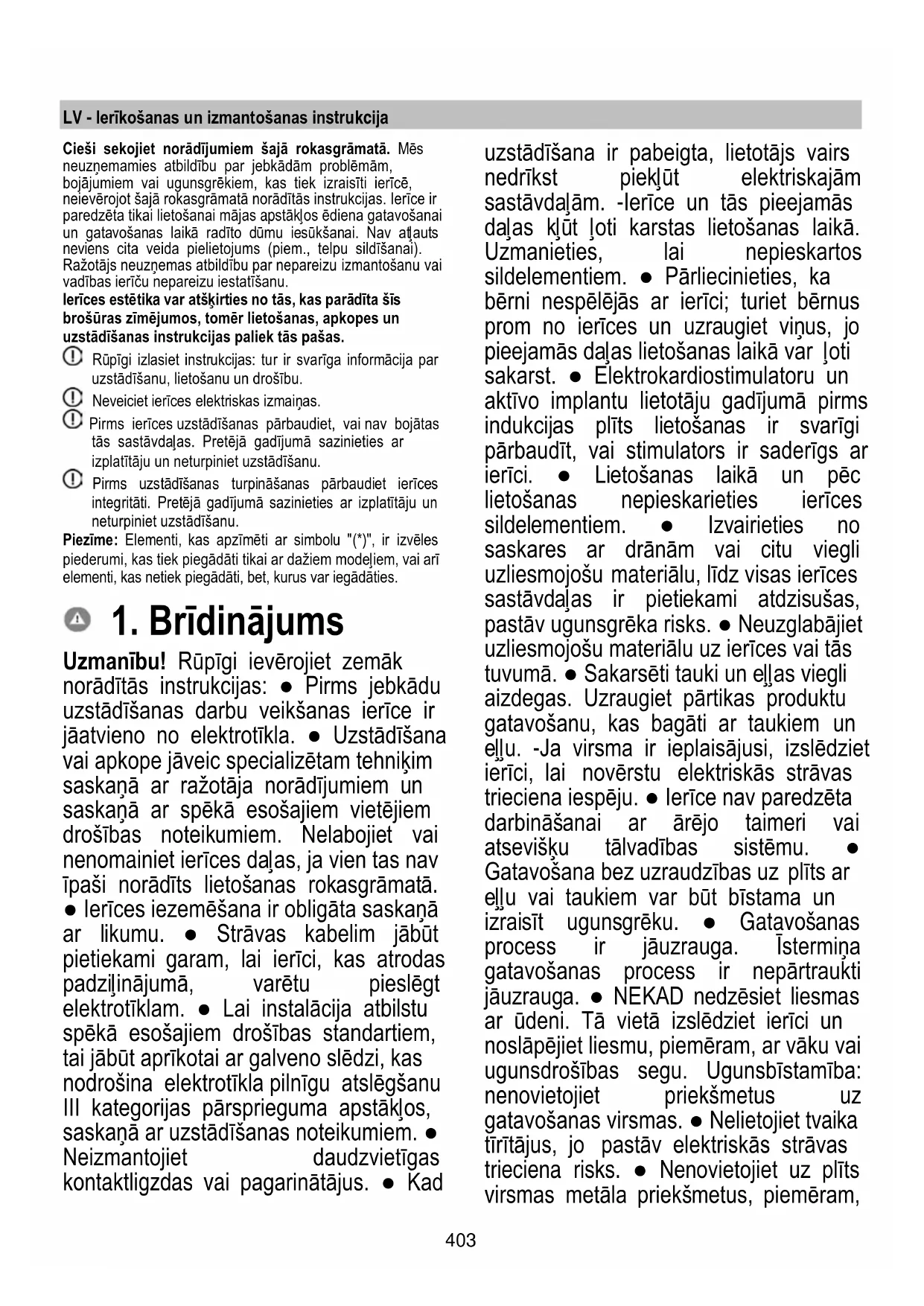 Uzmanību! Rūpīgi ievērojiet zemāk norādītās instrukcijas: ● Pirms jebkādu uzstādīšanas darbu veikšanas ierīce ir jāatvieno no elektrotīkla. ● Uzstādīšana vai apkope jāveic specializētam tehniķim saskaņā ar ražotāja norādījumiem un saskaņā ar spēkā esošajiem vietējiem drošības noteikumiem. Nelabojiet vai nenomainiet ierīces daļas, ja vien tas nav īpaši norādīts lietošanas rokasgrāmatā. ● Ierīces iezemēšana ir obligāta saskaņā ar likumu. ● Strāvas kabelim jābūt pietiekami garam, lai ierīci, kas atrodas padziļinājumā, varētu pieslēgt elektrotīklam. ● Lai instalācija atbilstu spēkā esošajiem drošības standartiem, tai jābūt aprīkotai ar galveno slēdzi, kas nodrošina elektrotīkla pilnīgu atslēgšanu III kategorijas pārsprieguma apstākļos, saskaņā ar uzstādīšanas noteikumiem. ● Neizmantojiet daudzvietīgas kontaktligzdas vai pagarinātājus. ● Kad uzstādīšana ir pabeigta, lietotājs vairs nedrīkst piekļūt elektriskajām sastāvdaļām. -Ierīce un tās pieejamās daļas kļūt ļoti karstas lietošanas laikā. Uzmanieties, lai nepieskartos sildelementiem. ● Pārliecinieties, ka bērni nespēlējās ar ierīci; turiet bērnus prom no ierīces un uzraugiet viņus, jo pieejamās daļas lietošanas laikā var ļoti sakarst. ● Elektrokardiostimulatoru un aktīvo implantu lietotāju gadījumā pirms indukcijas plīts lietošanas ir svarīgi pārbaudīt, vai stimulators ir saderīgs ar ierīci. ● Lietošanas laikā un pēc lietošanas nepieskarieties ierīces sildelementiem. ● Izvairieties no saskares ar drānām vai citu viegli uzliesmojošu materiālu, līdz visas ierīces sastāvdaļas ir pietiekami atdzisušas, pastāv ugunsgrēka risks. ● Neuzglabājiet uzliesmojošu materiālu uz ierīces vai tās tuvumā. ● Sakarsēti tauki un eļļas viegli aizdegas. Uzraugiet pārtikas produktu gatavošanu, kas bagāti ar taukiem un eļļu. -Ja virsma ir ieplaisājusi, izslēdziet ierīci, lai novērstu elektriskās strāvas trieciena iespēju. ● Ierīce nav paredzēta darbināšanai ar ārējo taimeri vai atsevišķu tālvadības sistēmu. ● Gatavošana bez uzraudzības uz plīts ar eļļu vai taukiem var būt bīstama un izraisīt ugunsgrēku. ● Gatavošanas process ir jāuzrauga. Īstermiņa gatavošanas process ir nepārtraukti jāuzrauga. ● NEKAD nedzēsiet liesmas ar ūdeni. Tā vietā izslēdziet ierīci un noslāpējiet liesmu, piemēram, ar vāku vai ugunsdrošības segu. Ugunsbīstamība: nenovietojiet priekšmetus uz gatavošanas virsmas. ● Nelietojiet tvaika tīrītājus, jo pastāv elektriskās strāvas trieciena risks. ● Nenovietojiet uz plīts virsmas metāla priekšmetus, piemēram,404 nažus, dakšiņas, karotes un vākus, jo tie var pārkarst. ● Pirms ierīces pievienošanas elektrotīklam: pārbaudiet datu plāksnīti (atrodas ierīces apakšā), lai pārliecinātos, ka spriegums un jauda atbilst elektrotīkla spriegumam un savienojuma kontaktligzdai. Ja rodas šaubas, sazinieties ar kvalificētu elektriķi. Svarīgi: ● Pēc lietošanas izslēdziet plīti, izmantojot tās vadības ierīci, un nepaļaujieties uz katla detektoru. ● Izvairieties no šķidruma izlīšanas; tāpēc, vārot vai sildot šķidrumu, samaziniet siltuma padevi. ● Neatstājiet sildelementus ieslēgtus ar tukšiem katliem un pannām vai bez katliem. ● Kad gatavošana ir pabeigta, izslēdziet attiecīgo gatavošanas zonu. ● Nekādā gadījumā nelietojiet alumīnija foliju ēdiena gatavošanai un nekad negatavojiet produktus, kas iesaiņoti alumīnija folijā. Alumīnijs var izkust un neatgriezeniski sabojāt ierīci. ● Nekad nekarsējiet skārda bundžu vai burku, kas satur pārtikas produktus, iepriekš to neatverot: tā var uzsprāgt! Šis brīdinājums attiecas uz visu citu veidu plīts virsmām. ● Lielas jaudas izmantošana, piemēram, Booster (palielināšana) funkcija, nav piemērota dažu šķidrumu, piemēram, cepšanas eļļas sildīšanai. Pārmērīgs karstums var būt bīstams. Šādos gadījumos mēs iesakām izmantot zemāku jaudu. ● Katli jānovieto tieši uz plīts virsmas un tiem jābūt centrētiem. Starp katlu un plīti nekādā gadījumā neievietojiet citus priekšmetus. ● Situācijā ar augstu temperatūru ierīce automātiski samazina gatavošanas zonu jaudas līmeni. ● Pirms tīrīšanas vai apkopes darbībām atvienojiet ierīci no strāvas avota, izņemot kontaktdakšu vai izslēdzot galveno slēdzi telpā. ● Visām uzstādīšanas un apkopes darbībām izmantojiet darba cimdus. ● Ierīci var lietot bērni, kas ir vecāki par 8 gadiem, un cilvēki ar samazinātām fiziskām, maņu vai garīgām spējām, vai bez pieredzes un nepieciešamajām zināšanām, ja vien tas tiek darīts citu uzraudzībā vai pēc tam, kad tie ir saņēmuši norādījumus par drošu ierīces lietošanu un sapratuši ar ierīci saistītos riskus. ● Bērni ir jāuzrauga, lai viņi nespēlētos ar ierīci. ● Tīrīšanu un apkopi bērni nedrīkst veikt bez uzraudzības. ● Telpā jābūt pietiekamai ventilācijai, ja ierīci lieto vienlaikus ar citām gāzes vai citām degšanas ierīcēm. ● Ierīce ir bieži jātīra gan no iekšpuses, gan no ārpuses (VISMAZ VIENU REIZI MĒNESĪ), katrā ziņā ievērojot apkopes instrukcijās skaidri norādīto. ● Ierīces tīrīšanas, filtru nomaiņas un filtru tīrīšanas noteikumu neievērošana rada ugunsbīstamību. ● Flambēšanas gatavošana ir stingri aizliegta. ● Atklātas liesmas izmantošana filtriem ir kaitīga un var izraisīt ugunsgrēku, tāpēc no tā jebkurā gadījumā ir jāizvairās. ● Cepšana jāveic kontrolētā veidā, lai nepieļautu pārkarsētas eļļas aizdegšanos. ● UZMANĪBU: kad plīts darbojas, ierīces pieejamās daļas var sakarst. ● Uzmanību! Nepievienojiet ierīci elektrotīklam, līdz uzstādīšana nav pabeigta. ● Attiecībā uz tehniskajiem un drošības pasākumiem, kas 