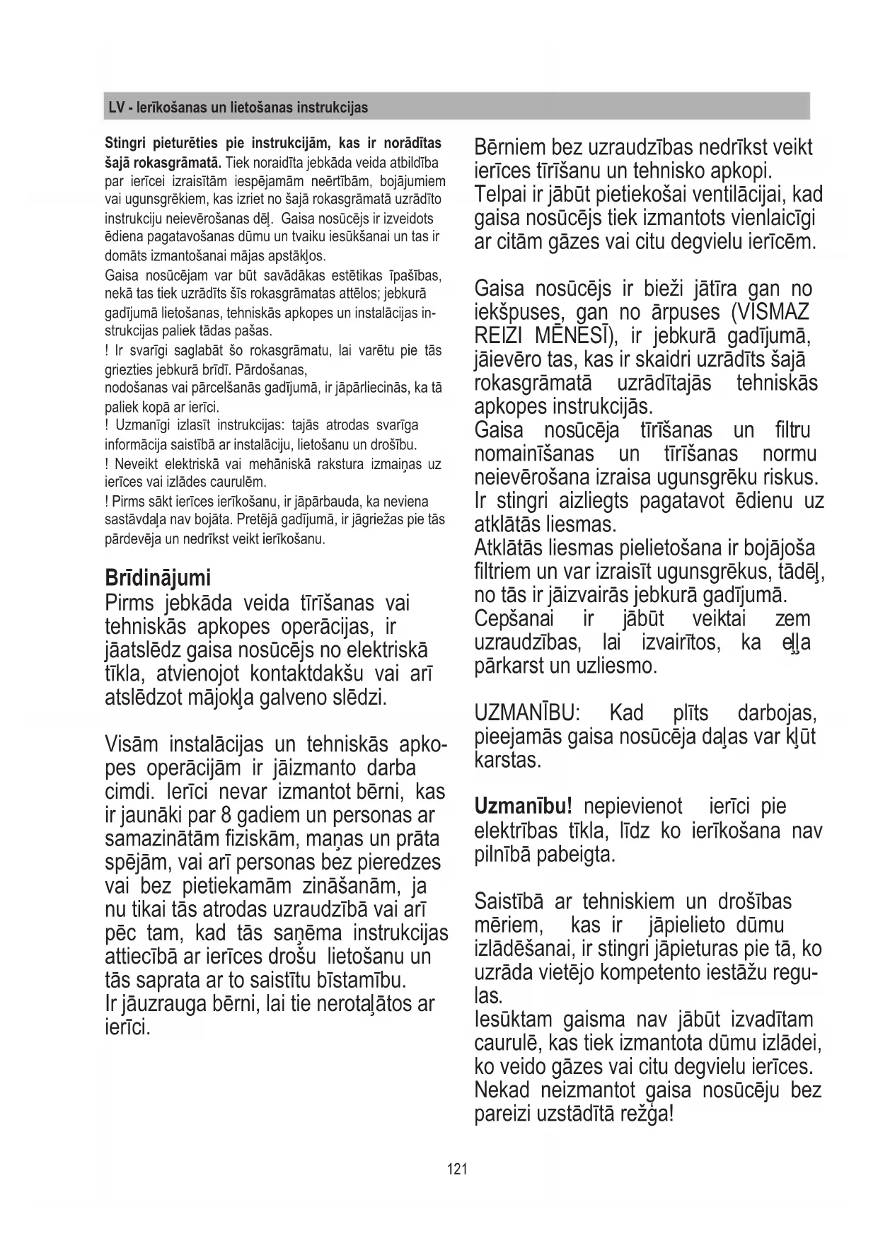 Riebalų ltras Sulaiko kepant ar verdant į orą patenkančių riebalų daleles. Filtrą valykite kartą per mėnesį (arba kai nurodo ltrų prisoti- nimo indikacijos sistema, jei ji yra turimame modelyje). Valy- kite švelniais valikliais rankomis arba plaukite indaplovėje žemoje temperatūroje trumpu ciklu. Plaunant indaplovėje, metalinis riebalų ltras gali prarasti spalvą, bet jo ltravimo savybės išlieka nepakitusios. Aktyviosios anglies ltras (tik ltravimo modelyje) Naikina nemalonius kvapus, atsirandančius gaminant maistą. Anglies ltras prisisotina naudojant ilgą laiką, priklausomai nuo viryklės rūšies ir riebalų ltro valymo reguliarumo. Bet kuriuo atveju kasetę reikia keisti ne dažniau kaip kas keturis mėnesius. Išėmus riebalų ltrus, galima įdėti anglies ltrus (8 pav.). Veikimas Norint užtikrinti tinkamą gaminio veikimą, reikia atidaryti nuimamąją dėžutę, kaip nurodyta toliau. Paspauskite stiklą žemyn, kaip pa- vaizduota 12 pav. – dėžutė atsiskirs ir atsidarys. Atsidarius nuimamajai dėžutei, gali- ma įjungti traukos variklį naudojant pavaizduotą valdymo mygtukų skydelį. Dėžutė uždaroma analogiškai – rei- kia spausti priekinį stiklą, kol ji visiškai užsidarys. T1. T2. T3. Laikmačio įjungimo ir išjungimo mygtukas: paspau- skite norėdami įjungti automatinio išjungimo funkciją: 1 greitis – 20 minučių 2 greitis – 15 minučių 3 greitis – 10 minučių Intensyvus greitis – 5 minutės Traukos greičio (galios) mažinimo mygtukas OFF 1: paspauskite kelis kartus, norėdami sumažinti greitį iki gartraukio išsijungimo. OFF 2: įrenginiui veikiant bet kokiu greičiu, laikykite nuspaudę. Įjungimo (ON) ir traukos greičio (galios) didinimo (1, 2, 3, intensyvus) mygtukas Intensyvus greitis veikia 5 minutes. Praėjus šiam lai- kui automatiškai nustatomas 2 greitis.121 LV - Ierīkošanas un lietošanas instrukcijas Stingri pieturēties pie instrukcijām, kas ir norādītas šajā rokasgrāmatā. Tiek noraidīta jebkāda veida atbildība par ierīcei izraisītām iespējamām neērtībām, bojājumiem vai ugunsgrēkiem, kas izriet no šajā rokasgrāmatā uzrādīto instrukciju neievērošanas dēļ. Gaisa nosūcējs ir izveidots ēdiena pagatavošanas dūmu un tvaiku iesūkšanai un tas ir domāts izmantošanai mājas apstākļos. Gaisa nosūcējam var būt savādākas estētikas īpašības, nekā tas tiek uzrādīts šīs rokasgrāmatas attēlos; jebkurā gadījumā lietošanas, tehniskās apkopes un instalācijas in- strukcijas paliek tādas pašas. ! Ir svarīgi saglabāt šo rokasgrāmatu, lai varētu pie tās griezties jebkurā brīdī. Pārdošanas, nodošanas vai pārcelšanās gadījumā, ir jāpārliecinās, ka tā paliek kopā ar ierīci. ! Uzmanīgi izlasīt instrukcijas: tajās atrodas svarīga informācija saistībā ar instalāciju, lietošanu un drošību. ! Neveikt elektriskā vai mehāniskā rakstura izmaiņas uz ierīces vai izlādes caurulēm. ! Pirms sākt ierīces ierīkošanu, ir jāpārbauda, ka neviena sastāvdaļa nav bojāta. Pretējā gadījumā, ir jāgriežas pie tās pārdevēja un nedrīkst veikt ierīkošanu. Brīdinājumi Pirms jebkāda veida tīrīšanas vai tehniskās apkopes operācijas, ir jāatslēdz gaisa nosūcējs no elektriskā tīkla, atvienojot kontaktdakšu vai arī atslēdzot mājokļa galveno slēdzi. Visām instalācijas un tehniskās apko- pes operācijām ir jāizmanto darba cimdi. Ierīci nevar izmantot bērni, kas ir jaunāki par 8 gadiem un personas ar samazinātām ziskām, maņas un prāta spējām, vai arī personas bez pieredzes vai bez pietiekamām zināšanām, ja nu tikai tās atrodas uzraudzībā vai arī pēc tam, kad tās saņēma instrukcijas attiecībā ar ierīces drošu lietošanu un tās saprata ar to saistītu bīstamību. Ir jāuzrauga bērni, lai tie nerotaļātos ar ierīci. Bērniem bez uzraudzības nedrīkst veikt ierīces tīrīšanu un tehnisko apkopi. Telpai ir jābūt pietiekošai ventilācijai, kad gaisa nosūcējs tiek izmantots vienlaicīgi ar citām gāzes vai citu degvielu ierīcēm. Gaisa nosūcējs ir bieži jātīra gan no iekšpuses, gan no ārpuses (VISMAZ REIZI MĒNESĪ), ir jebkurā gadījumā, jāievēro tas, kas ir skaidri uzrādīts šajā rokasgrāmatā uzrādītajās tehniskās apkopes instrukcijās. Gaisa nosūcēja tīrīšanas un ltru nomainīšanas un tīrīšanas normu neievērošana izraisa ugunsgrēku riskus. Ir stingri aizliegts pagatavot ēdienu uz atklātās liesmas. Atklātās liesmas pielietošana ir bojājoša ltriem un var izraisīt ugunsgrēkus, tādēļ, no tās ir jāizvairās jebkurā gadījumā. Cepšanai ir jābūt veiktai zem uzraudzības, lai izvairītos, ka eļļa pārkarst un uzliesmo. UZMANĪBU: Kad plīts darbojas, pieejamās gaisa nosūcēja daļas var kļūt karstas. Uzmanību! nepievienot ierīci pie elektrības tīkla, līdz ko ierīkošana nav pilnībā pabeigta. Saistībā ar tehniskiem un drošības mēriem, kas ir jāpielieto dūmu izlādēšanai, ir stingri jāpieturas pie tā, ko uzrāda vietējo kompetento iestāžu regu- las. Iesūktam gaisma nav jābūt izvadītam caurulē, kas tiek izmantota dūmu izlādei, ko veido gāzes vai citu degvielu ierīces. Nekad neizmantot gaisa nosūcēju bez pareizi uzstādītā režģa!122 Gaisa nosūcējs NEKAD nedrīkst būt iz- mantots, kā atbalsta virsma, ja nu tikai tas ir skaidri uzrādīts. Ierīkošanai izmantot tikai tās ksācijas skrūves, kas ir dotas līdzi ierīcei, vai arī, ja tās nav dotas līdzi, ir jāiegādājas pareiza veida skrūves. Izmantot pareizu garumu skrūvēm, kas ir identicētas Instalācijas Vadībā. Šaubu gadījumā, sazināties ar autorizētu tehniskās apkalpošanas cen- tru vai līdzīgu kvalicētu personālu. UZMANĪBU! Skrūvju un piestiprināšanas ierīču neierīkošana saskaņā ar šīm instrukcijām, var izraisīt elektriskās da- bas riskus. Tiek noraidīta jebkāda veida atbildība par ierīcei izraisītām 