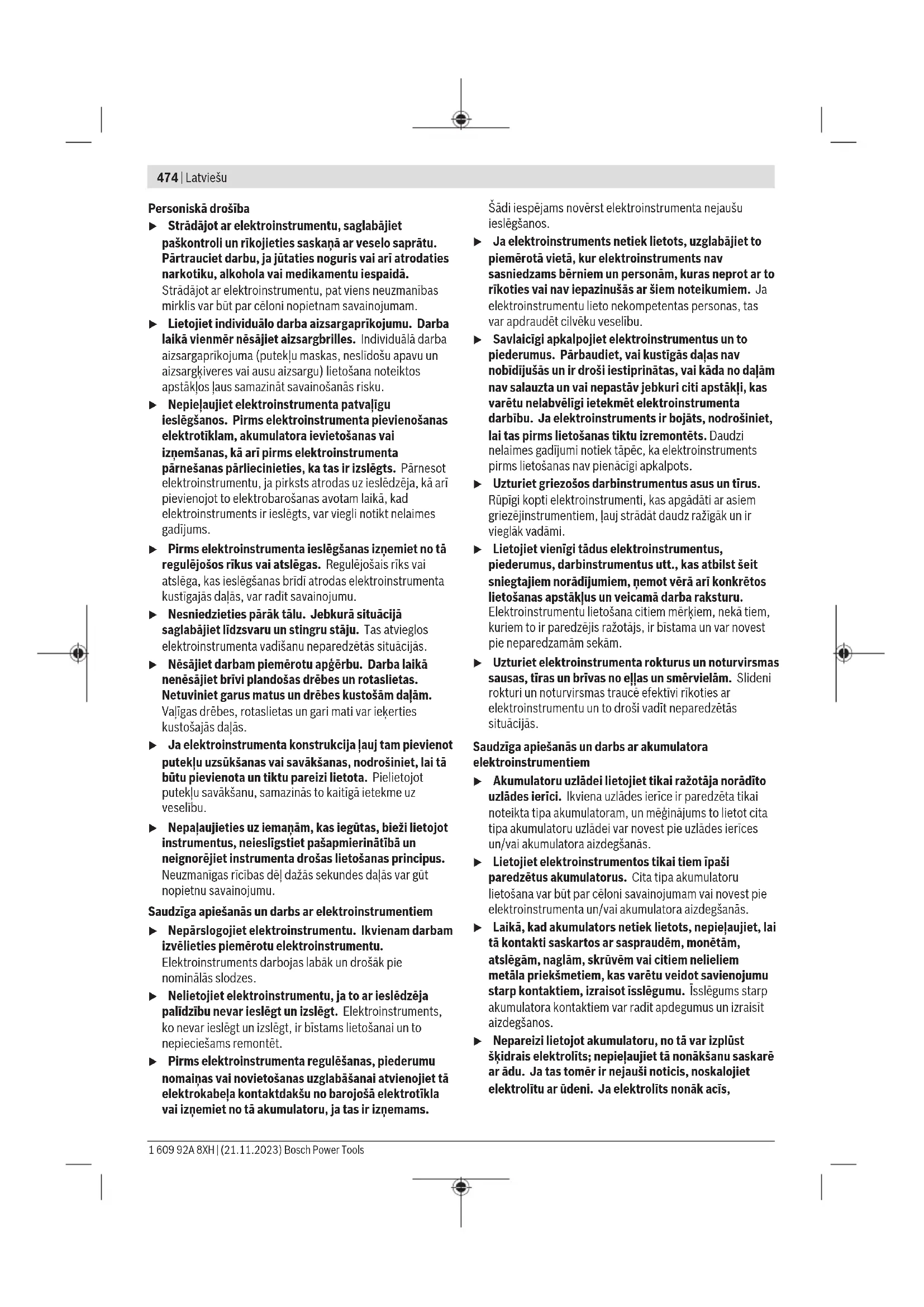 Bluetooth® Low Energy ModuleGCY42 ei kuulu standardsesse tarnekomplekti Ühildamisfunktsioonid (GWS18V-15 C / GWS18V-15 SC/ GWS18V-15 PSC) Bluetooth® Low Energy Module'igaGCY42 (ei kuulu standardsesse tarnekomplekti) on elektrilisel tööriistal kasutatavad järgmised ühenduvusfunktsioonid: – registreerimine ja isikustamine; – oleku kontroll, hoiatusteadete väljastamine; – üldine teave ja seaded; – haldus. Teavet Bluetooth® Low Energy ModuleGCY42 (ei kuulu standardsesse tarnekomplekti) kohta saate kaasasolevast kasutusjuhendist. Elektrilise tööriista ühendamine rakendusega tuleb kinnitada, vajutades kasutajaliidesel(4) pöörlemiskiiruse eelvaliku nuppu(39). Rakendus küsib seda ühendamisel. Hooldus ja korrashoid Hooldus ja puhastus u Eemaldage aku seadmest enne mis tahes töid seadme kallal (nt hooldus, tarvikute vahetus jmt), samuti enne seadme transportimist ja hoiulepanekut. Lüliti (sisse/ välja) juhuslik käsitsemine toob kaasa vigastuste ohu. u Seadme laitmatu ja ohutu töö tagamiseks hoidke seade ja selle ventilatsiooniavad puhtad. Hoidke ja käsitsege lisavarustust hoolikalt. Klienditeenindus ja kasutusalane nõustamine Klienditeeninduse töötajad vastavad teie küsimustele teie toote remondi ja hoolduse ning varuosade kohta. Joonised ja info varuosade kohta leiate ka veebisaidilt: www.bosch-pt.com Boschi nõustajad on meeleldi abiks, kui teil on küsimusi toodete ja lisatarvikute kasutamise kohta. Päringute esitamisel ja varuosade tellimisel teatage meile kindlasti toote tüübisildil olev 10‑kohaline tootenumber. Eesti Vabariik Teeninduskeskus Tel.: (+372) 6549 575 Faks: (+372) 6549 576 E-posti: service-pt@lv.bosch.com 1 609 92A 8XH | (21.11.2023) Bosch Power ToolsLatviešu | 473 Muud teeninduse aadressid leiate jaotisest: www.bosch-pt.com/serviceaddresses Transport Soovitatud liitiumioonakude suhtes kohaldatakse ohtlike veoste eeskirjade nõudeid. Akude puhul on lubatud kasutajapoolne piiranguteta maanteevedu. Kolmandate isikute teostatava veo korral (nt õhuvedu või ekspedeerimine) tuleb järgida pakendi ja tähistuse osas kehtivaid erinõudeid. Sellisel juhul peab veose ettevalmistamisel alati osalema ohtlike ainete veo ekspert. Aku vedu on lubatud vaid siis, kui aku korpus on vigastusteta. Katke lahtised kontaktid teibiga ja pakkige aku nii, et see pakendis ei liiguks. Järgige ka võimalikke täiendavaid siseriiklikke nõudeid. Kasutuskõlbmatuks muutunud seadmete käitlus Elektrilised tööriistad, akud, lisatarvikud ja pakendid tuleb keskkonnasäästlikult ringlusse võtta. Ärge käidelge elektrilisi tööriistu ja akusid/ patareisid koos olmejäätmetega! Üksnes ELliikmesriikidele: Vastavalt direktiivile 2012/19/EL elektri- ja elektroonikaseadmete jäätmete kohta ning nende kohaldamisele riigi õigusaktides tuleb kasutusressursi ammendanud elektritööriistad ja vastavalt direktiivile 2006/66/EÜ defektsed või kasutusressursi ammendanud akud/patareid eraldi kokku koguda ja suunata keskkonnasäästlikku taaskasutusse. Vale jäätmekäitluse korral võivad vanad elektri- ja elektroonikaseadmed, milles sisaldub kahjulikke aineid, kahjustada keskkonda ja inimeste tervist. Akud/patareid: Li-Ion: Järgige punktis Transport toodud juhiseid (vaadake „Transport“, Lehekülg473). Latviešu Drošības noteikumi Vispārēji drošības noteikumi elektroinstrumentiem BRĪDINĀ- JUMS Izlasiet visus drošības noteikumus un instrukcijas, aplūkojiet ilustrācijas un iepazīstieties ar specifikācijām, kas tiek piegādātas kopā ar šo elektroinstrumentu. Šeit sniegto drošības noteikumu un instrukciju neievērošana var izraisīt aizdegšanos un būt par cēloni elektriskajam triecienam vai nopietnam savainojumam. Pēc izlasīšanas uzglabājiet šos noteikumus turpmākai izmantošanai. Drošības noteikumos lietotais apzīmējums "elektroinstruments" attiecas gan uz Jūsu tīkla elektroinstrumentiem (ar elektrokabeli), gan arī uz akumulatora elektroinstrumentiem (bez elektrokabeļa). Drošība darba vietā u Uzturiet savu darba vietu tīru un labi apgaismotu. Nekārtīgās un tumšās vietās var viegli notikt nelaimes gadījums. u Nedarbiniet elektroinstrumentus sprādzienbīstamā atmosfērā, piemēram, viegli uzliesmojošu šķidrumu tuvumā un vietās ar paaugstinātu gāzu vai putekļu saturu gaisā. Darba laikā elektroinstruments nedaudz dzirksteļo, un tas var izsaukt viegli degošu putekļu vai tvaiku aizdegšanos. u Darbinot elektroinstrumentu, neļaujiet bērniem un nepiederošām personām tuvoties darba vietai. Citu personu klātbūtne var novērst uzmanību, kā rezultātā jūs varat zaudēt kontroli pār elektroinstrumentu. Elektrodrošība u Elektroinstrumenta kontaktdakšai jābūt piemērotai elektrotīkla kontaktligzdai. Kontaktdakšas konstrukciju nedrīkst nekādā veidā mainīt. Nelietojiet kontaktdakšas adapterus, ja elektroinstruments caur kabeli tiek savienots ar aizsargzemējuma ķēdi. Neizmainītas konstrukcijas kontaktdakša, kas piemērota kontaktligzdai, ļauj samazināt elektriskā trieciena saņemšanas risku. u Nepieļaujiet ķermeņa daļu saskaršanos ar sazemētiem priekšmetiem, piemēram, ar caurulēm, radiatoriem, plītīm vai ledusskapjiem. Pieskaroties sazemētām virsmām, pieaug risks saņemt elektrisko triecienu. u Nelietojiet elektroinstrumentu lietus laikā, neturiet to mitrumā. Mitrumam iekļūstot elektroinstrumentā, pieaug risks saņemt elektrisko triecienu. u Nenoslogojiet kabeli. Neizmantojiet kabeli, lai elektroinstrumentu nestu, vilktu vai atvienotu no elektrotīkla kontaktligzdas. Sargājiet kabeli no karstuma, eļļas, asām malām un kustošām daļām. Bojāts vai samezglojies elektrokabelis var būt par cēloni elektriskā trieciena saņemšanai. u Darbinot elektroinstrumentu ārpus telpām, izmantojiet tā pievienošanai vienīgi ārpustelpu lietošanai derīgus pagarinātājkabeļus. Lietojot elektrokabeli, kas piemērots darbam ārpus telpām, samazinās elektriskā trieciena saņ
