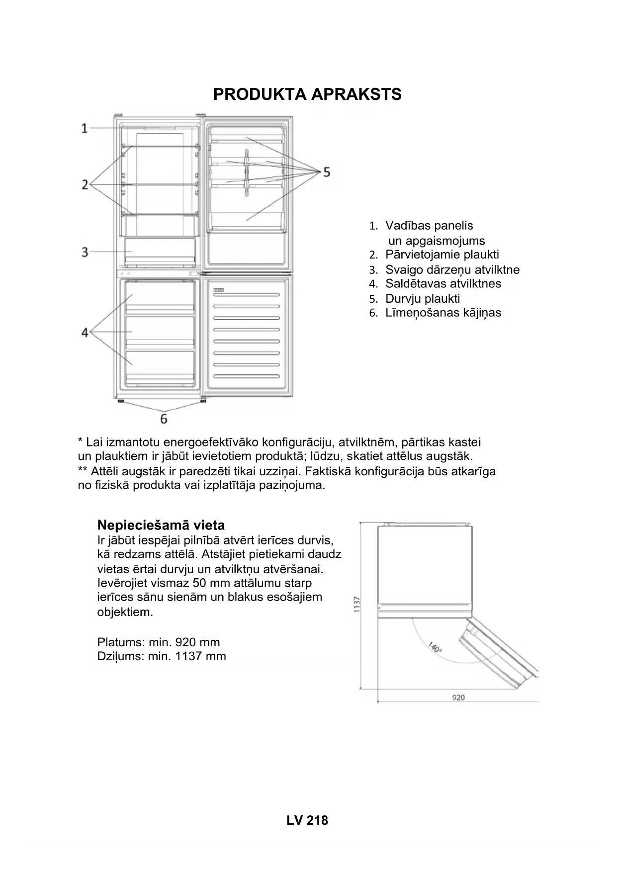 - Lai izmantotu energoefektīvāko konfigurāciju, atvilktnēm, pārtikas kastei un plauktiem ir jābūt ievietotiem produktā; lūdzu, skatiet attēlus augstāk. ** Attēli augstāk ir paredzēti tikai uzziņai. Faktiskā konfigurācija būs atkarīga no fiziskā produkta vai izplatītāja paziņojuma. Nepieciešamā vieta Ir jābūt iespējai pilnībā atvērt ierīces durvis, kā redzams attēlā. Atstājiet pietiekami daudz vietas ērtai durvju un atvilktņu atvēršanai. Ievērojiet vismaz 50 mm attālumu starp ierīces sānu sienām un blakus esošajiem objektiem. Platums: min. 920 mm Dziļums: min. 1137 mmLV 219 LIETOŠANA Ieslēgšanas/izslēgšanas taustiņš — tiek izmantots, lai ieslēgtu/izslēgtu ierīci. Mode taustiņš — tiek izmantots, lai izvēlētos ledusskapja temperatūru vai speciālās funkcijas. Wi-Fi ikona — rāda, vai ierīce ir savienota ar lietotni. Super Cool ikona — rāda, vai funkcija ir aktivizēta. Temperatūras līmeņi — rāda atlasīto temperatūru. Lietošana