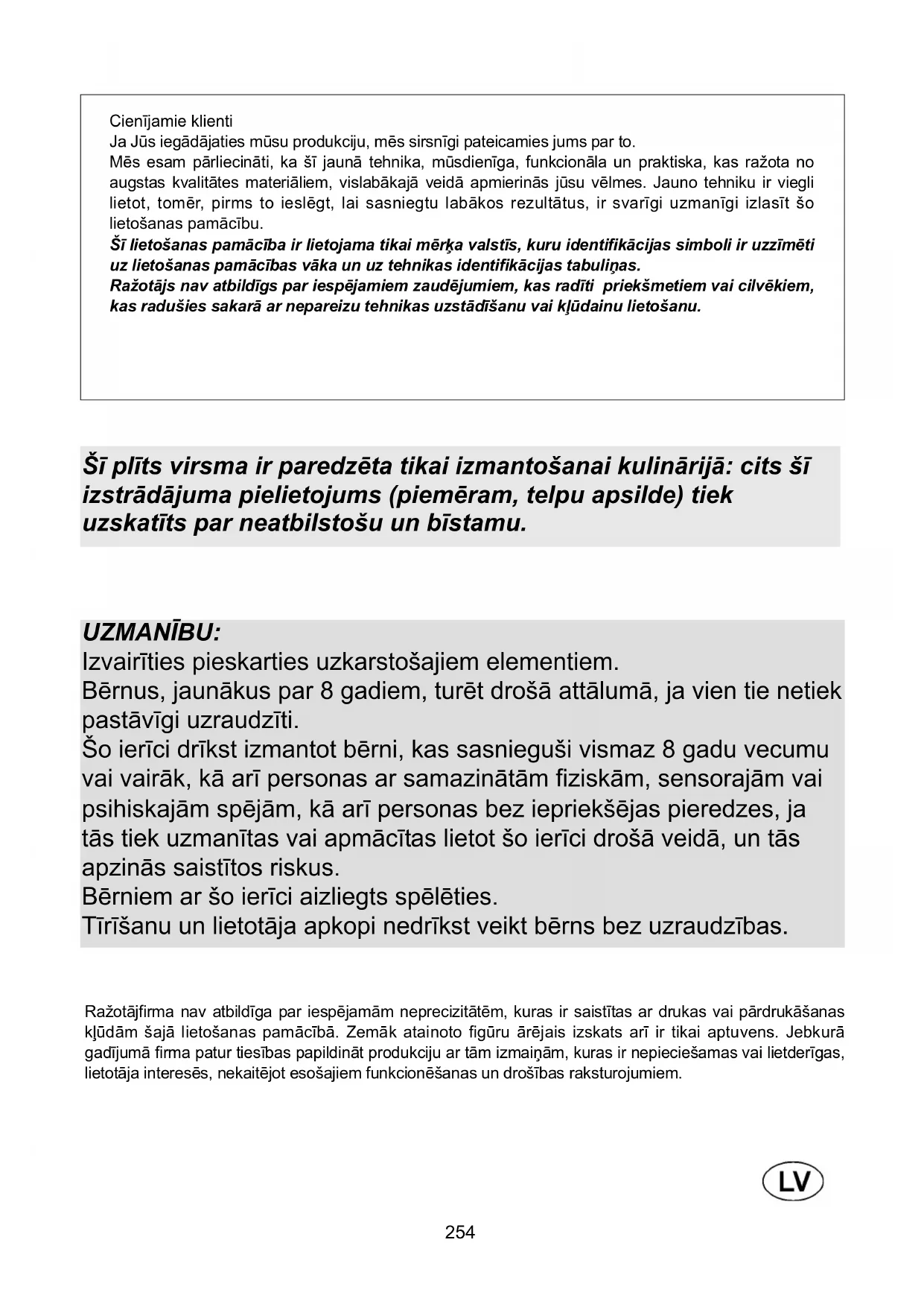 Parimate tulemuste saavutamiseks on antud seadet enne tehasest väljasaatmist testinud ja seadistanud kogenud ning kvalifitseeritud spetsialistid. Originaalvaruosasid saab seadmele muretseda ainult meie firma teeninduskeskustest ja erikauplustest. Iga seadistust ja remonti tuleb teostada suure ettevaatlikkuse ning tähelepanuga ning ainult kvalifitseeritud personali abil. Sellepärast soovitame me probleemide esinemisel alati pöörduda müüja poole, kellelt te seadme ostsite või siis lähimasse teeniduskeskusesse, näidates ära teie poolt soetatud seadme margi, mudeli, seerianumbri ja rikketüübi. Vastavad andmed on trükitud andmeplaadile (etiketile), mis asub seadme alumises osas, samuti andmeplaadil (etiketil), mis on pakendikarbis. Antud informatsioon võimaldab tehnilisel konsultandil valmistada ette vajalikud varuosad ja tagada tulevikus hooldustööde õigeaegse ja täpse teostamise. Soovitame teil need andmed allpool esitatud kujul üles kirjutada, et need oleksid vajadusel alati käepärast. MARK: ....................................................................... MUDEL: ....................................................................... SEERIA: ....................................................................... Seade on tähistatud Euroopa Parlamendi ja nõukogu elektri- ja elektroonikaseadmete jäätmete direktiivi 2002/96/EÜ nõuete kohaselt. Need juhised kehtivad üle kogu Euroopa elektri- ja elektroonikaseadmete tagastamisele ja ümbertöötlemisele.254 UZMANĪBU: Izvairīties pieskarties uzkarstošajiem elementiem. Bērnus, jaunākus par 8 gadiem, turēt drošā attālumā, ja vien tie netiek pastāvīgi uzraudzīti. Šo ierīci drīkst izmantot bērni, kas sasnieguši vismaz 8 gadu vecumu vai vairāk, kā arī personas ar samazinātām fiziskām, sensorajām vai psihiskajām spējām, kā arī personas bez iepriekšējas pieredzes, ja tās tiek uzmanītas vai apmācītas lietot šo ierīci drošā veidā, un tās apzinās saistītos riskus. Bērniem ar šo ierīci aizliegts spēlēties. Tīrīšanu un lietotāja apkopi nedrīkst veikt bērns bez uzraudzības. Cienījamie klienti Ja Jūs iegādājaties mūsu produkciju, mēs sirsnīgi pateicamies jums par to. Mēs esam pārliecināti, ka šī jaunā tehnika, mūsdienīga, funkcionāla un praktiska, kas ražota no augstas kvalitātes materiāliem, vislabākajā veidā apmierinās jūsu vēlmes. Jauno tehniku ir viegli lietot, tomēr, pirms to ieslēgt, lai sasniegtu labākos rezultātus, ir svarīgi uzmanīgi izlasīt šo lietošanas pamācību. Šī lietošanas pamācība ir lietojama tikai mērķa valstīs, kuru identifikācijas simboli ir uzzīmēti uz lietošanas pamācības vāka un uz tehnikas identifikācijas tabuliņas. Ražotājs nav atbildīgs par iespējamiem zaudējumiem, kas radīti priekšmetiem vai cilvēkiem, kas radušies sakarā ar nepareizu tehnikas uzstādīšanu vai kļūdainu lietošanu. Ražotājfirma nav atbildīga par iespējamām neprecizitātēm, kuras ir saistītas ar drukas vai pārdrukāšanas kļūdām šajā lietošanas pamācībā. Zemāk atainoto figūru ārējais izskats arī ir tikai aptuvens. Jebkurā gadījumā firma patur tiesības papildināt produkciju ar tām izmaiņām, kuras ir nepieciešamas vai lietderīgas, lietotāja interesēs, nekaitējot esošajiem funkcionēšanas un drošības raksturojumiem. Šī plīts virsma ir paredzēta tikai izmantošanai kulinārijā: cits šī izstrādājuma pielietojums (piemēram, telpu apsilde) tiek uzskatīts par neatbilstošu un bīstamu.255