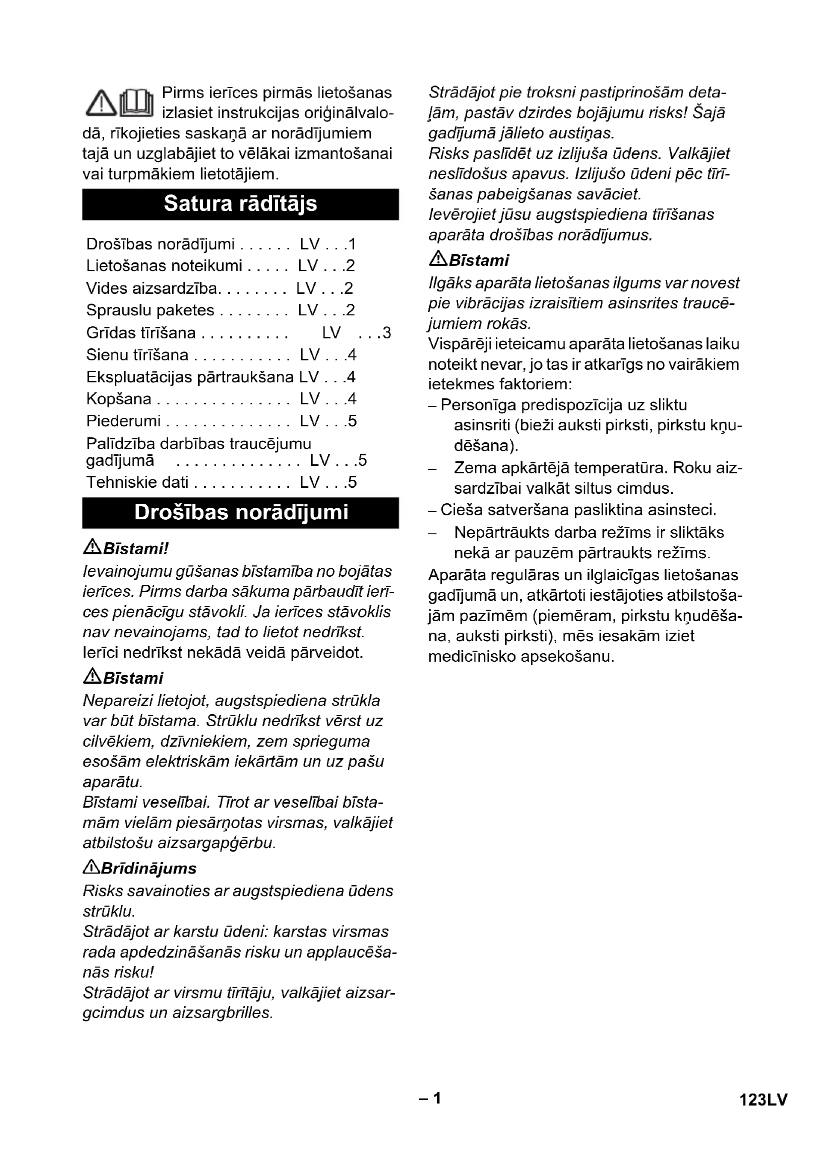 • 0,4 122 ET– 1 Pirms ierīces pirmās lietošanas izlasiet instrukcijas oriģinālvalo- dā, rīkojieties saskaņā ar norādījumiem tajā un uzglabājiet to vēlākai izmantošanai vai turpmākiem lietotājiem. Bīstami! Ievainojumu gūšanas bīstamība no bojātas ierīces. Pirms darba sākuma pārbaudīt ierī- ces pienācīgu stāvokli. Ja ierīces stāvoklis nav nevainojams, tad to lietot nedrīkst. Ierīci nedrīkst nekādā veidā pārveidot. Bīstami Nepareizi lietojot, augstspiediena strūkla var būt bīstama. Strūklu nedrīkst vērst uz cilvēkiem, dzīvniekiem, zem sprieguma esošām elektriskām iekārtām un uz pašu aparātu. Bīstami veselībai. Tīrot ar veselībai bīsta- mām vielām piesārņotas virsmas, valkājiet atbilstošu aizsargapģērbu. 몇 Brīdinājums Risks savainoties ar augstspiediena ūdens strūklu. Strādājot ar karstu ūdeni: karstas virsmas rada apdedzināšanās risku un applaucēša- nās risku! Strādājot ar virsmu tīrītāju, valkājiet aizsar- gcimdus un aizsargbrilles. Strādājot pie troksni pastiprinošām deta- ļām, pastāv dzirdes bojājumu risks! Šajā gadījumā jālieto austiņas. Risks paslīdēt uz izlijuša ūdens. Valkājiet neslīdošus apavus. Izlijušo ūdeni pēc tīrī- šanas pabeigšanas savāciet. Ievērojiet jūsu augstspiediena tīrīšanas aparāta droš ības norādījumus. Bīstami Ilgāks aparāta lietošanas ilgums var novest pie vibrācijas izraisītiem asinsrites traucē- jumiem rokās. Vispārēji ieteicamu aparāta lietošanas laiku noteikt nevar, jo tas ir atkarīgs no vairākiem ietekmes faktoriem: – Personīga predispozīcija uz sliktu asinsriti (bieži auksti pirksti, pirkstu kņu- dēšana). – Zema apkārtējā temperatūra. Roku aiz- sardzībai valkāt siltus cimdus. – Cieša satveršana pasliktina asinsteci. – Nepārtrāukts darba režīms ir sliktāks nekā ar pauzēm pārtraukts režīms. Aparāta regulāras un ilglaicīgas lietošanas gadījumā un, atkārtoti iestājoties atbilstoša- jām pazīmēm (piemēram, pirkstu kņudēša- na, auksti pirksti), mēs iesakām iziet medicīnisko apsekošanu. Satura rādītājs Drošības norādījumi