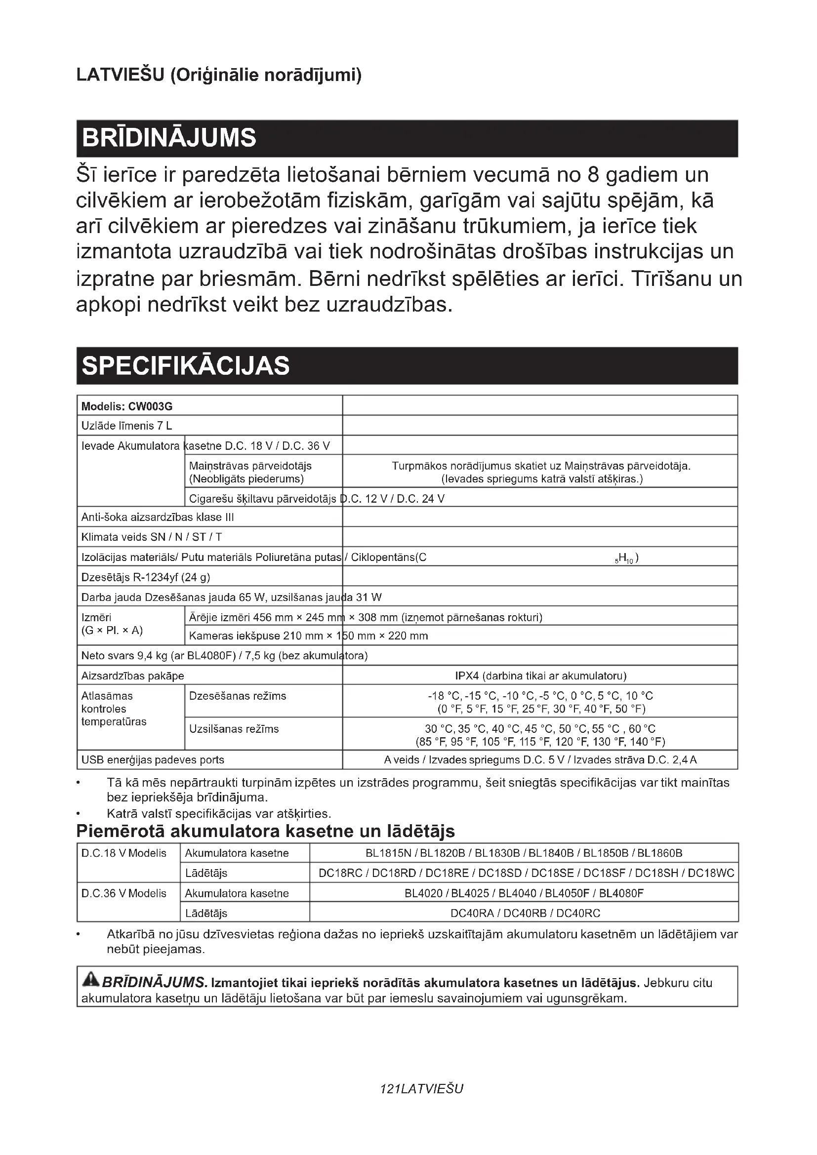 Šī ierīce ir paredzēta lietošanai bērniem vecumā no 8 gadiem un cilvēkiem ar ierobežotām fiziskām, garīgām vai sajūtu spējām, kā arī cilvēkiem ar pieredzes vai zināšanu trūkumiem, ja ierīce tiek izmantota uzraudzībā vai tiek nodrošinātas drošības instrukcijas un izpratne par briesmām. Bērni nedrīkst spēlēties ar ierīci. Tīrīšanu un apkopi nedrīkst veikt bez uzraudzības. SPECIFIKĀCIJAS Modelis: CW003GUzlāde līmenis 7 LIevade Akumulatora kasetne D.C. 18 V / D.C. 36 VMaiņstrāvas pārveidotājs (Neobligāts piederums)Turpmākos norādījumus skatiet uz Maiņstrāvas pārveidotāja. (Ievades spriegums katrā valstī atšķiras.)Cigarešu šķiltavu pārveidotājs D.C. 12 V / D.C. 24 VAnti-šoka aizsardzības klase IIIKlimata veids SN / N / ST / TIzolācijas materiāls/ Putu materiāls Poliuretāna putas / Ciklopentāns(C