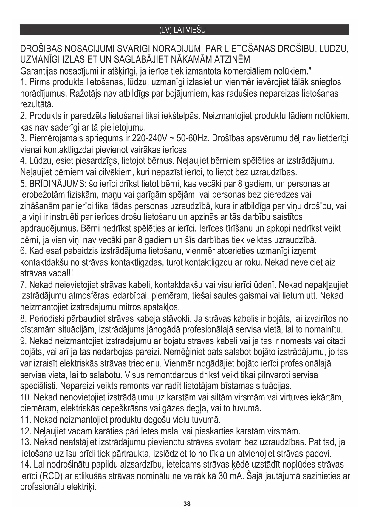 norādījumus. Ražotājs nav atbildīgs par bojājumiem, kas radušies nepareizas lietošanas rezultātā. DROŠĪBAS NOSACĪJUMI SVARĪGI NORĀDĪJUMI PAR LIETOŠANAS DROŠĪBU, LŪDZU, UZMANĪGI IZLASIET UN SAGLABĀJIET NĀKAMĀM ATZINĒM Garantijas nosacījumi ir atšķirīgi, ja ierīce tiek izmantota komerciāliem nolūkiem."